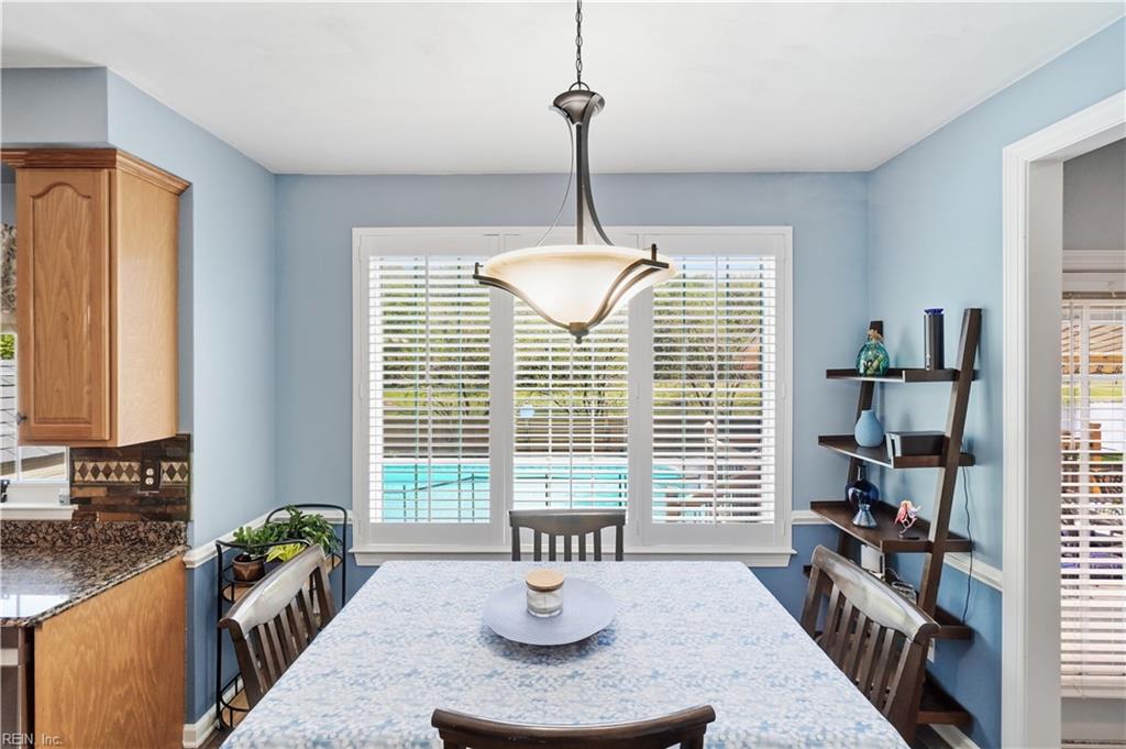 WOW! Stunning water view, a 20x40 in-ground saltwater pool, and 900 sq ft of deck space create a backyard oasis made for relaxing and entertaining! A 20-foot awning adds shaded comfort as you unwind while taking in the water view. Inside, this well-maintained two-story home offers 4 bedrooms and 3 full baths, including a first-floor bedroom with an adjacent full bath great for guests or a home office. Formal living and dining rooms provide flexible space for hosting, while the eat-in kitchen and den/family room create a welcoming hub for everyday living. Additional highlights include an irrigation system, downstairs plantation shutters, a 476 sq ft unfinished floored room over the garage for storage or future expansion, plus 2-zone HVAC with Nest thermostats, all in the sought-after Etheridge Lakes community.
