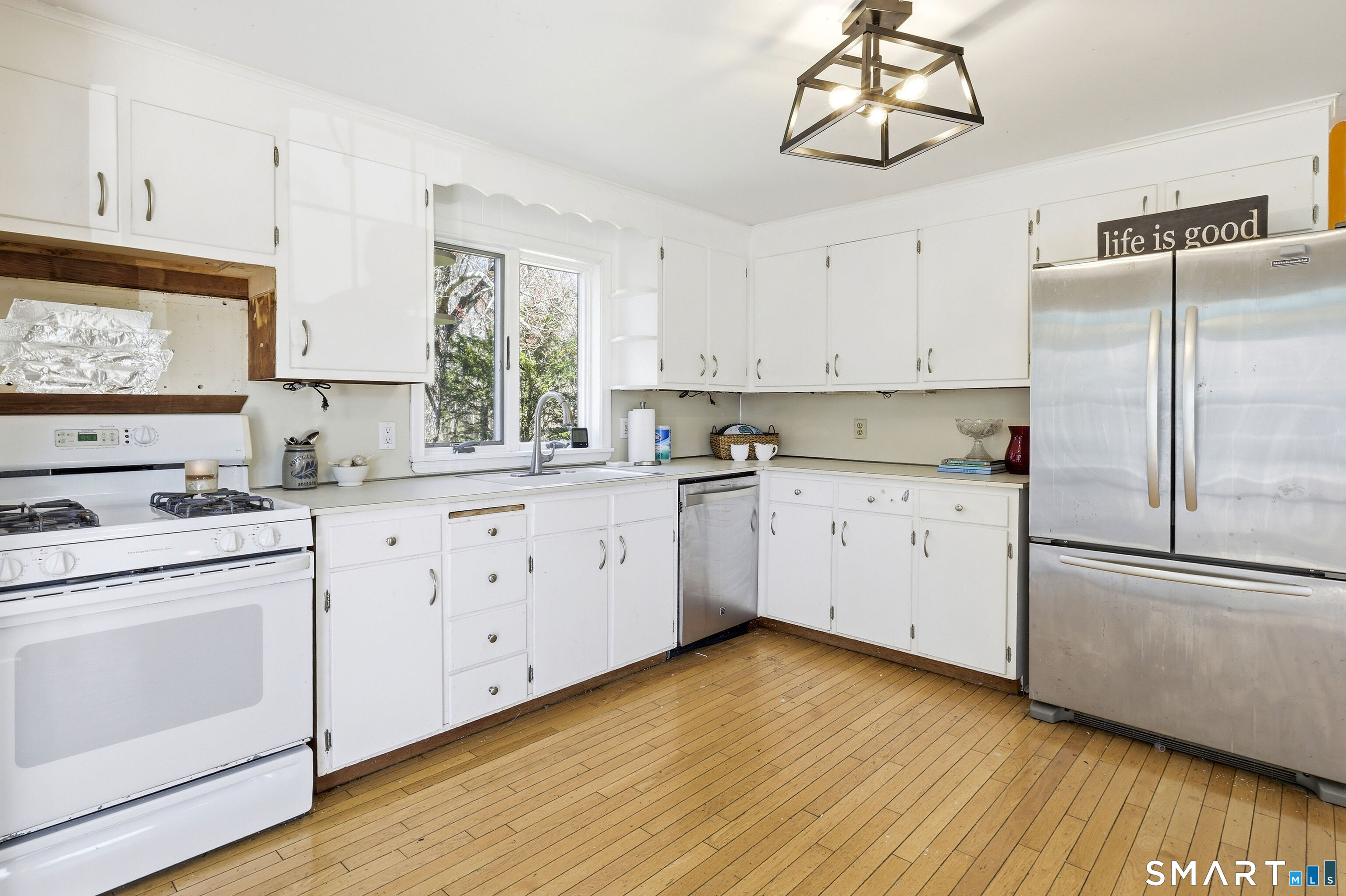 Welcome to the highly sought-after Buttonball neighborhood, where charm and functionality come together in this fully dormered Cape. Offering three generously sized bedrooms and abundant closet space, this home provides both comfort and versatility. The inviting living room features a cozy fireplace, perfect for relaxing evenings, while the partially finished lower level adds additional space ideal for entertaining, hobbies, or a home office and includes a warm fireplace as well. A bright and airy breezeway seamlessly connects the kitchen and dining room, creating a flexible layout that easily accommodates gatherings of any size and everyday living alike. Hardwood floors run throughout the home, offering timeless style and easy maintenance. The first-floor bathroom has been tastefully updated, and the upper-level half bath presents an excellent opportunity to add a shower, enhancing both convenience and value. Set on a picturesque lot, this property offers an outdoor retreat complete with a gentle stream, a tranquil koi pond, and a versatile shed-previously used as a chicken coop-perfect for hobbyists or additional storage. A wonderful opportunity to own a warm and welcoming Carini built home in one of the area's most desirable neighborhoods.