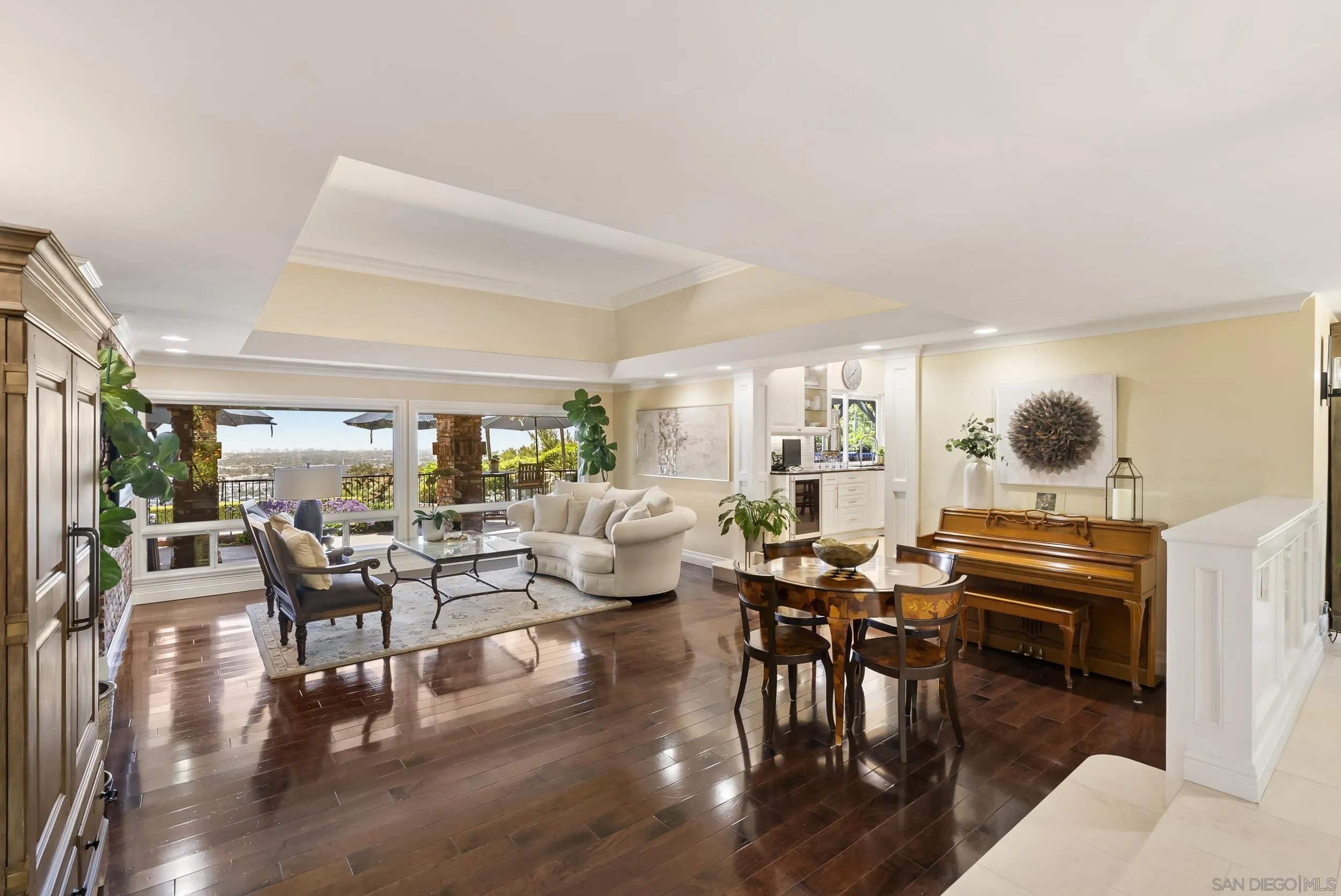6525 Crystalaire Drive presents an exceedingly rare opportunity unlike anything else to hit the Del Cerro market. Spanning approximately 5,549 square feet on a sprawling 0.56-acre lot, this extraordinary single-story estate embodies a unique level of scale, privacy, and panoramic beauty seldom available. Thoughtfully designed for both grand-scale entertaining and comfortable everyday living, the home offers 5 bedrooms plus an office, expansive living areas, and a floor plan that balances openness with privacy. Walls of glass frame sweeping views throughout the residence, while soaring ceilings, rich architectural brick detailing, and multiple fireplaces bring warmth, substance, and timeless character to the interiors. The privately situated primary retreat offers a true sense of escape, featuring a sunken sitting room with fireplace, dual closets, and an expansive stone-clad bath with dual vanities, a makeup area, spa tub, and oversized shower. Outdoors, the resort-style grounds include a pool, elevated spa, outdoor kitchen, pergolas, expansive patios, fire pit lounge, large view deck, edible garden, and mature fruit trees. A temperature-controlled wine cellar with exterior access, outdoor sauna, beautifully landscaped grounds with extensive Simons brick, 54 owned solar panels, zoned heating and air conditioning, a 2-car garage, and abundant off-street parking further elevate the offering. Set on one of Del Cerro's premier streets, this is a standout residence that delivers an exceptional blend of scale, craftsmanship, lifestyle, and views.