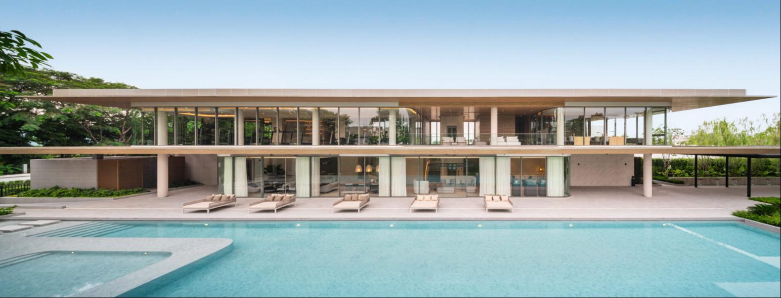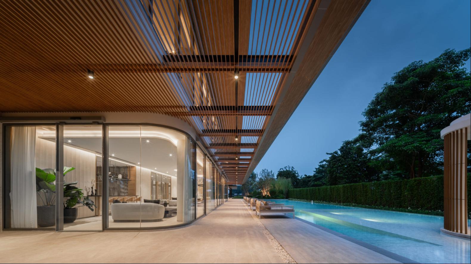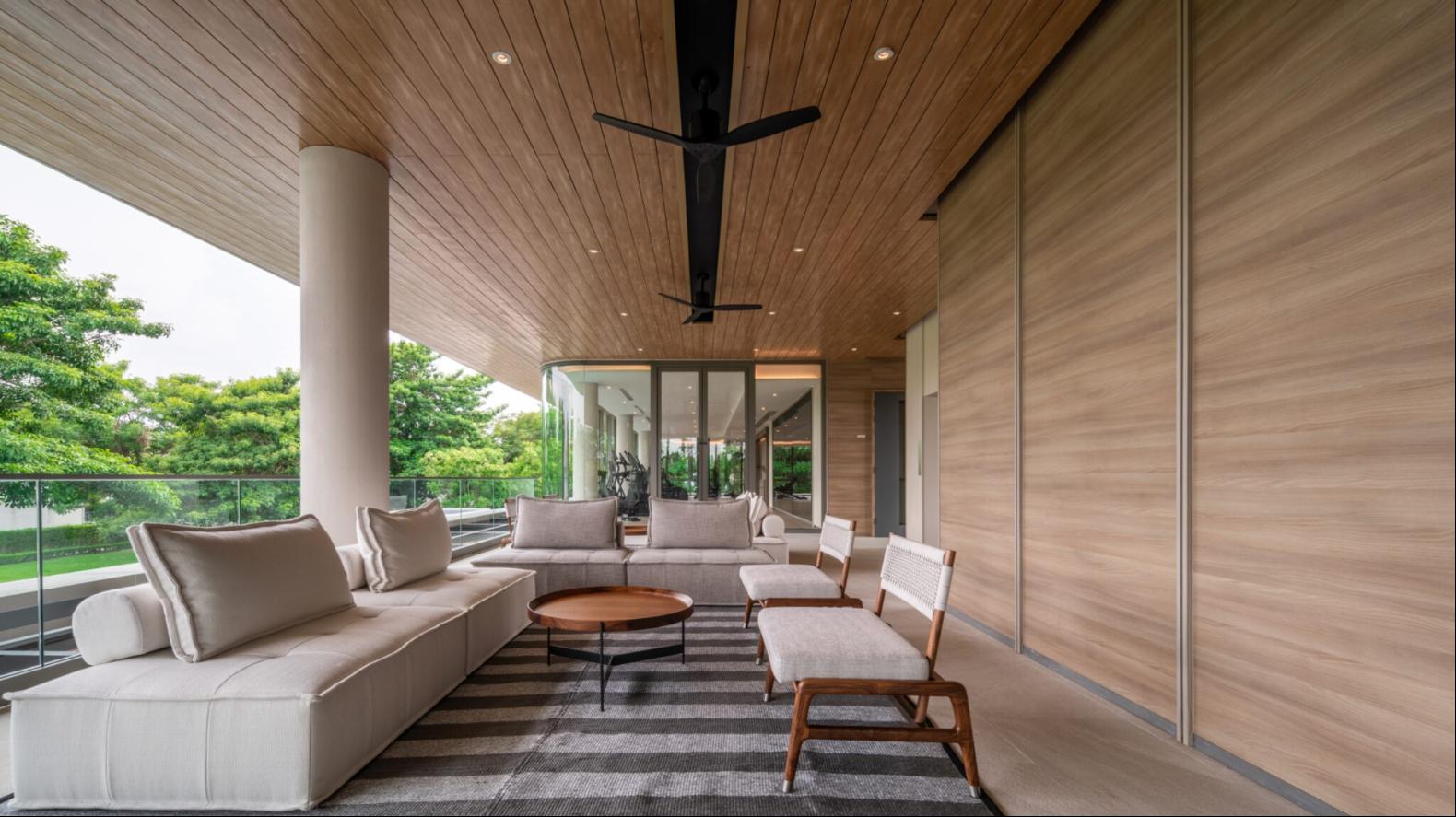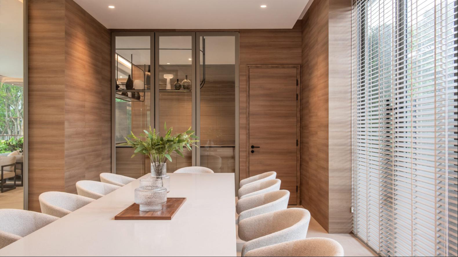 Occupying an expansive land plot and offering approximately 880 square meters of usable living space, the home is thoughtfully arranged across three levels to accommodate both elegant entertaining and relaxed everyday life. The architectural concept emphasizes openness and natural flow, beginning with an impressive double‑volume living area that welcomes abundant daylight while enhancing natural ventilation. Floor‑to‑ceiling glass elements frame tranquil garden views, creating a calming, resort‑like atmosphere within the city.