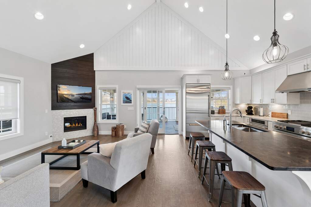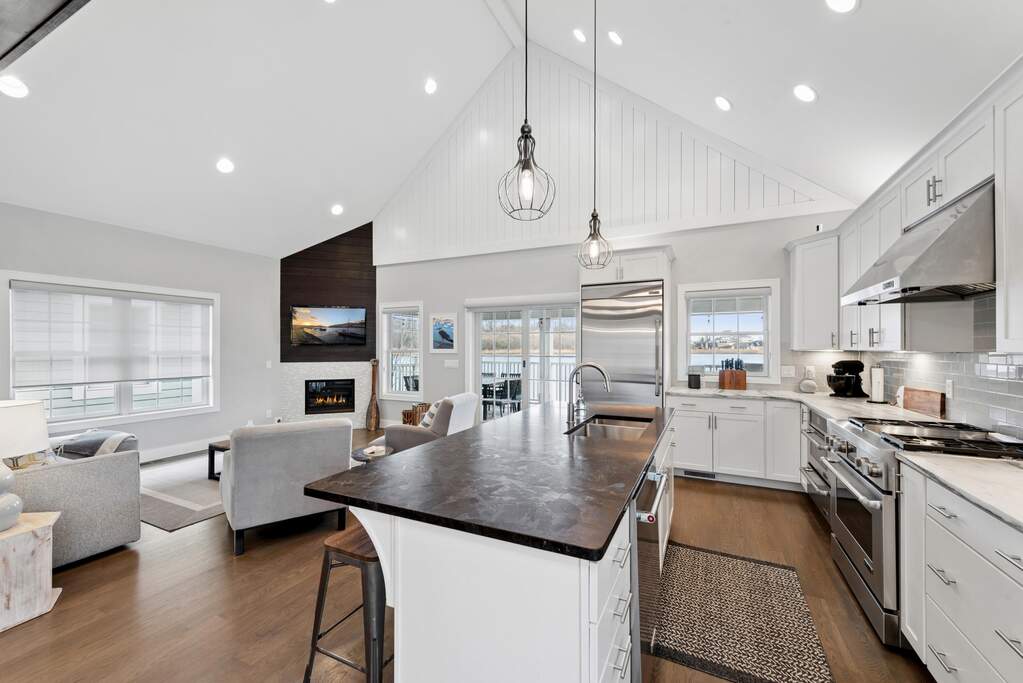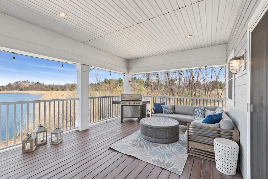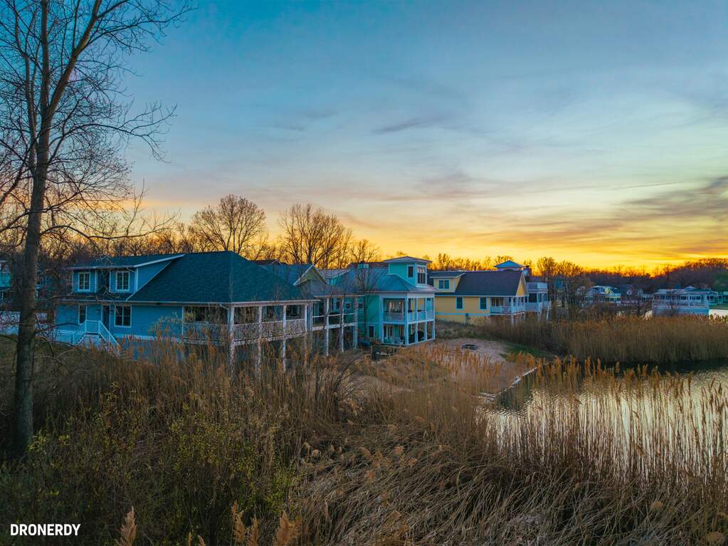 Your perfect getaway awaits at this amazing waterfront home in Michigan City's Beachwalk. The stunning views of Lake Kai from your balcony will delight as you host friends and family in this home built for entertaining. You'll love the modern, clean style of your vaulted, open-concept living room and bright chef's kitchen with JennAir appliances. Tasteful wood touches abound and every detail is considerate and intentional. Throughout the home, windows are elevated by chic wooden shutters, including the main floor owner's suite -- a calm respite with shiplap-accented tray ceiling and spacious bath. The upstairs mezzanine overlooks the main living area and leads to two bedrooms and an adjoining bath. The lower level is designed for play with a super cool game lounge, an incredible custom wet bar with wine cooler, ice maker, drink fridge, and mood lighting. The cinema room provides coziness to relax and unwind. The fourth bedroom offers further space for your guests and there's even interior storage for paddleboards, cornhole, and beach gear. Walk out to a sandy shore where you can chill around a fire pit and dip your toes in cool water. All this and Beachwalk's resort-style amenities including a pool, hot tub, fishing pier, splash pad, and a community boardwalk to the shores of Lake Michigan. Bring your shades and swimsuit, your new lake lifestyle is here!