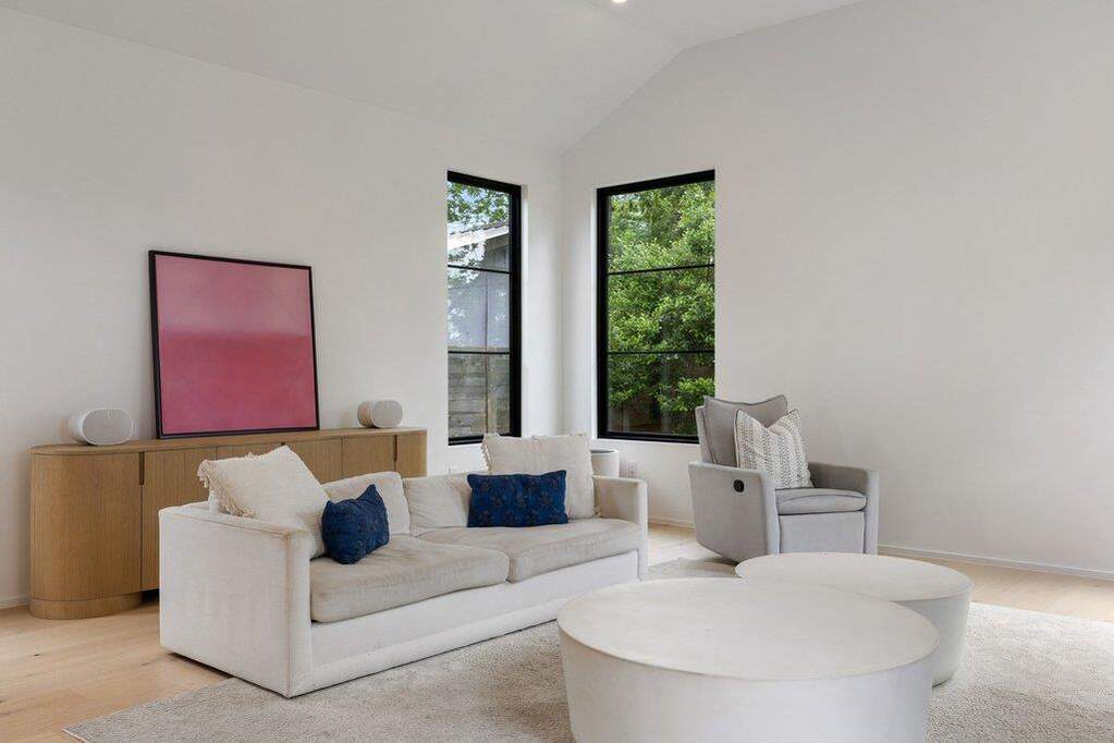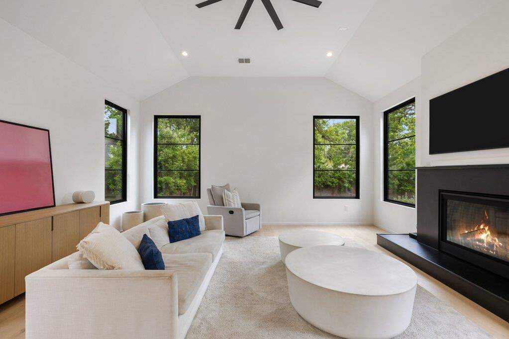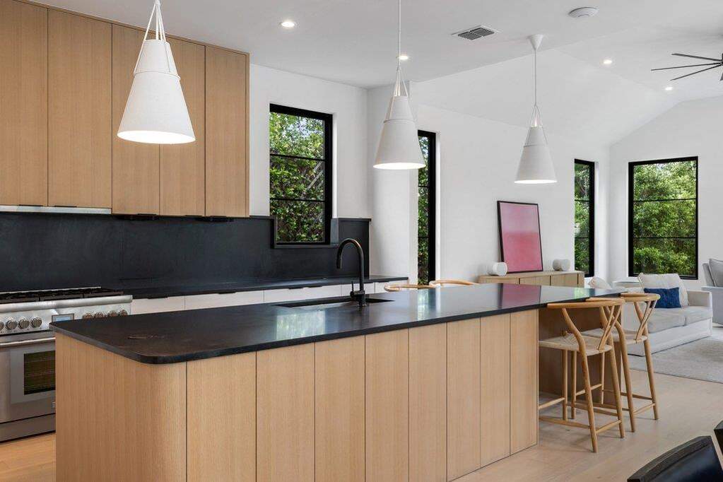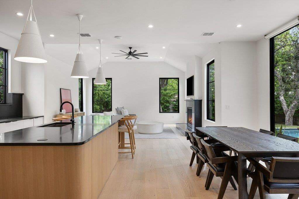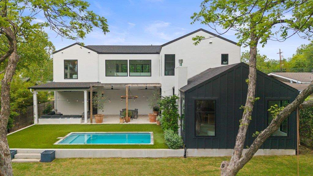 A refined expression of modern architecture in the heart of Brentwood, this thoughtfully designed residence is the result of a collaborative vision between Rodenberg Design, SLIC Design, and Narum Design Build, delivering a level of craftsmanship and intentionality rarely seen at this price point. Clean lines and curated finishes define the interiors, where white oak flooring runs throughout, complemented by high-end Benchmark custom cabinetry, matte black hardware, stainless steel Thermador appliances, and striking Basaltina stone island countertops and backsplash that anchor the kitchen with a sophisticated, textural edge. A Lutron smart lighting system enhances both ambiance and functionality, while expansive windows flood the home with natural light and a fluid layout offers both everyday livability and elevated entertaining, including a secondary living space for added flexibility. The exterior is equally considered, featuring a sleek black metal roof and a private backyard retreat anchored by a generous covered living space with custom chandelier detail, a pool framed by turf and irrigation, and a beautifully tiered, wide-use yard lined with meticulously installed Eagleton holly hedging for privacy. Every element has been intentionally curated, resulting in a residence that feels both architecturally significant and effortlessly livable, all within one of Central Austin's most sought-after neighborhoods. Ideally positioned just minutes from Downtown Austin, with convenient access to Mopac and 183, the home offers seamless connectivity while keeping you close to the city's best dining, retail, and entertainment.