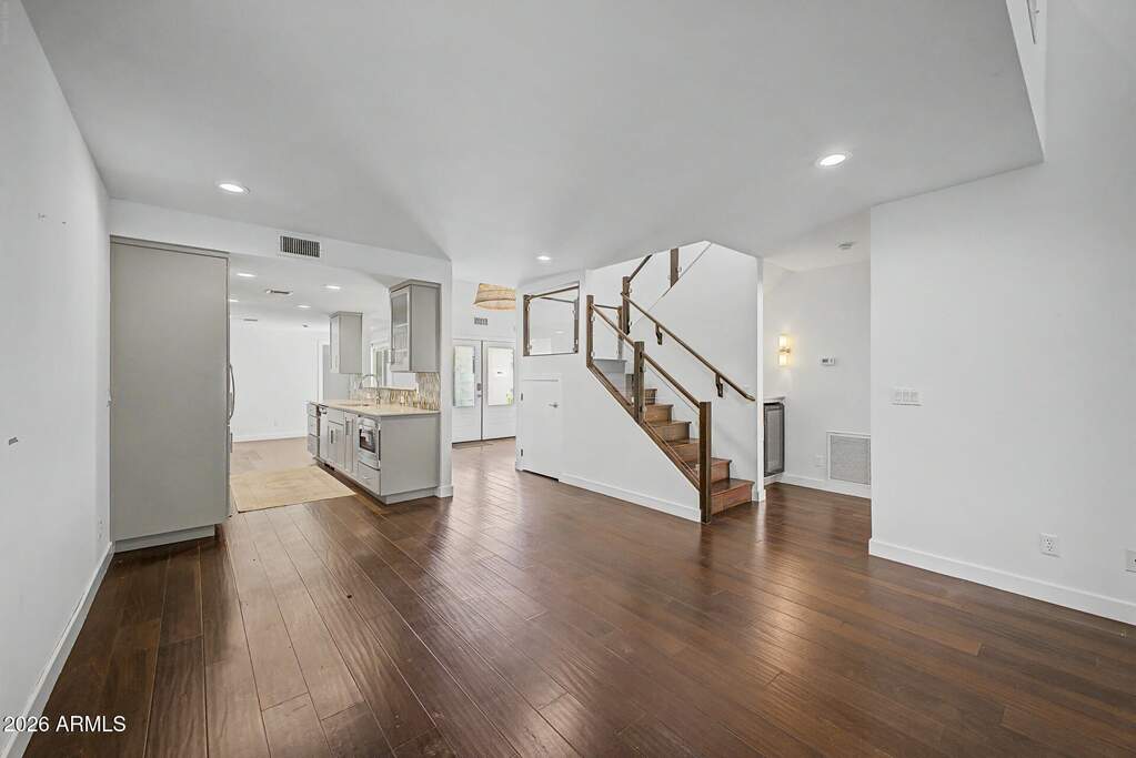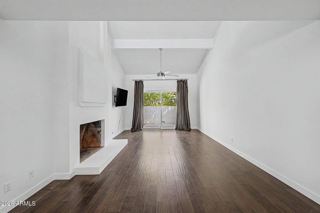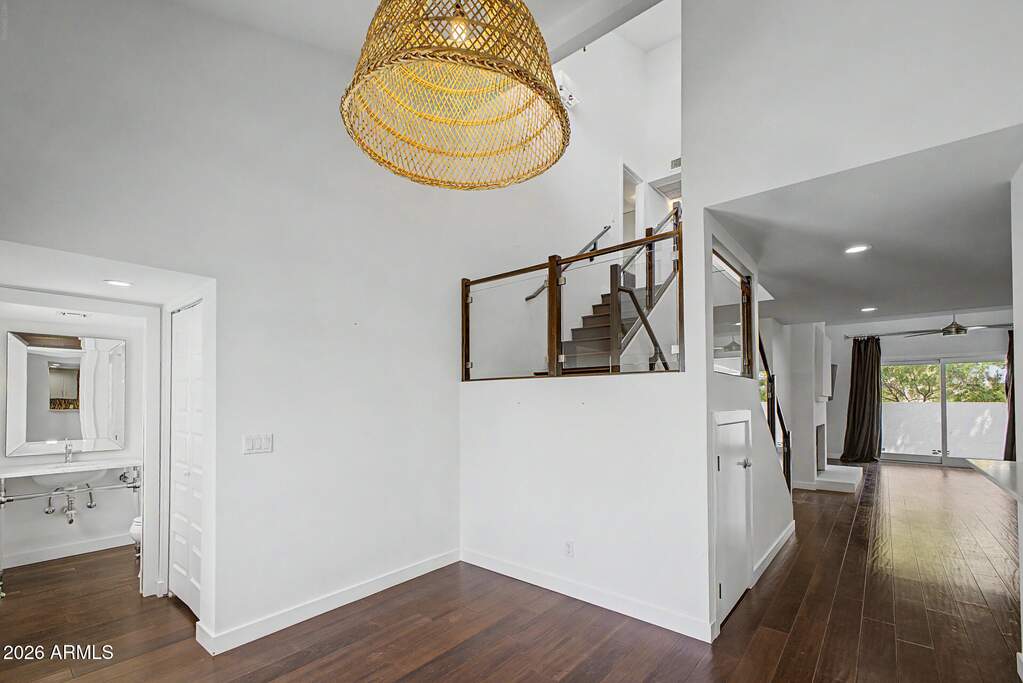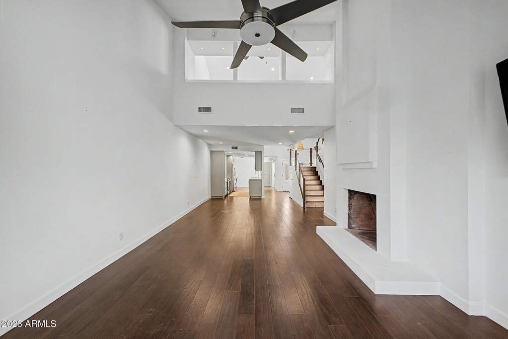 Experience elevated desert living in the exclusive guard-gated Village at Camelback Mountain, ideally located near premier destinations like Steak 44, The Henry, Buck & Rider, AJ's Fine Foods, and the iconic The Global Ambassador, with convenient access to Phoenix Sky Harbor International Airport. A welcoming atrium entry sets the tone, leading into a thoughtfully designed interior featuring rich Brazilian walnut flooring and an open-concept kitchen adorned with Walker Zanger tile and custom cabinetry. The main-level primary suite offers a cozy fireplace, dual sinks, a dedicated vanity space, and a walk-in shower with dual heads for a spa-like experience. Upstairs, a striking glass staircase leads to a versatile den with access to a private deck--an uncommon feature that adds both charm and functionality. Residents enjoy access to two community pools and tennis courts, all set against the stunning backdrop of Camelback Mountain. Great investment opportunity with strong potential for sweat equity, surrounded by neighboring properties selling in the $1.4M-$1.5M range. A distinctive home in a highly sought-after location--this is desert living at its finest.
