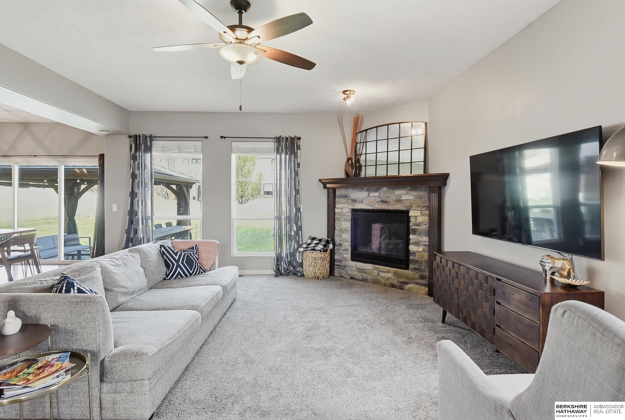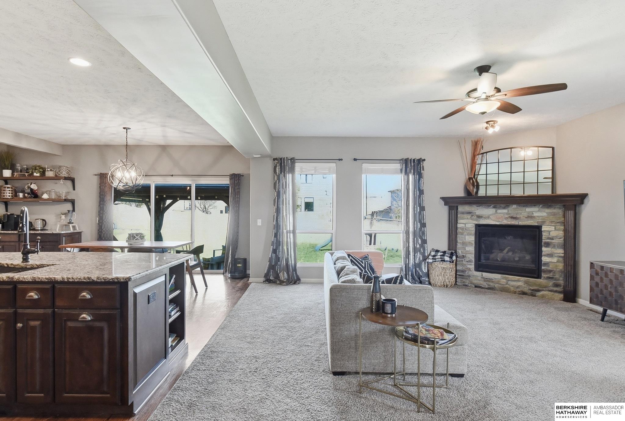 4 bedroom, 4 bathroom, 3 car garage 2 story home in North Shore with finished basement, large patio, & gazebo. Open concept main floor features a spacious living area & kitchen with a large island, birch cabinets, granite countertops, stainless steel appliances, & built-in coffee/serving bar. Thoughtfully designed rear staircase creates an open layout & allows for larger upstairs BRs, all with walk-in closets. Primary suite includes a walk-in tiled shower, jetted tub, & 2 closets. Finished lower level includes a bar, 2nd fireplace, & stone accent entertainment wall, ideal for hosting or additional living space. Exterior features a large patio & gazebo for outdoor living and entertaining. Additional features include abundant storage throughout, multiple living/entertaining areas, & functional layout for modern living. Walking distance to Prairie Queen recreation area, Werner Park, & Prairie Queen grade school. Quick access to HWY 370 & I80 as well as many shopping & dining amenities