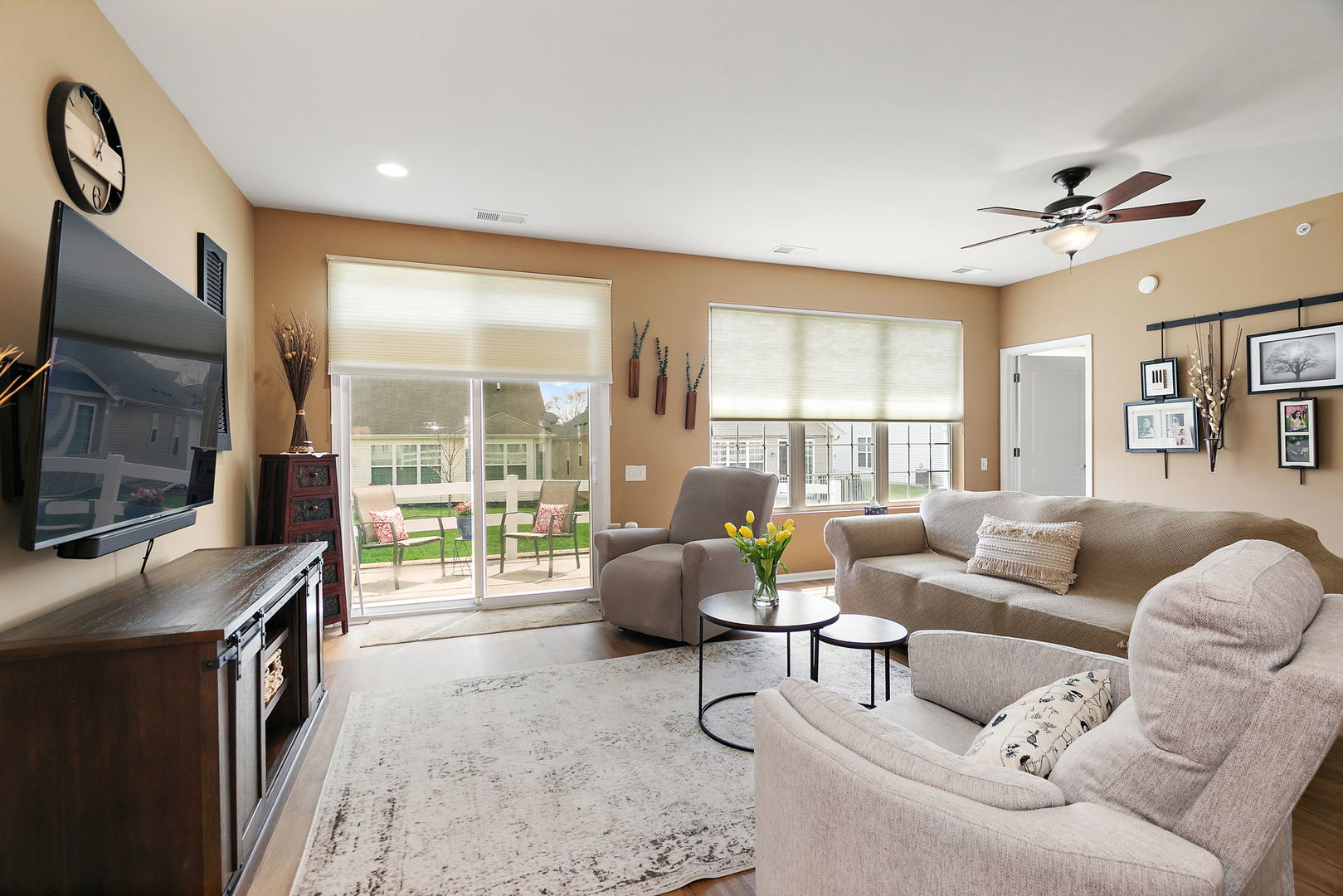 Welcome to this beautifully designed James model located on a cul-de-sac in Huntley's premier 55+ community. This thoughtfully laid-out home features 2 spacious bedrooms and 2 full bathrooms. The primary suite includes a bay window that fills the room with natural light and an en-suite featuring a convenient step in shower with 2 benches. The guest bedroom is perfectly situated next to a second full bathroom. The open-concept design creates a seamless flow throughout the home, anchored by a versatile great room & dining room offers endless possibilities for furniture layout and entertaining. The kitchen features maple cabinets, black appliances and a breakfast nook with large window and pantry closet. The newer, easy care LVT flooring through the main living areas adds to the adorable charm of this home. A laundry room with newer washer and dryer & utility cabinet leads to the 2-car garage. Enjoy the peaceful backyard on the patio. Some updated lighting, Samsung microwave. Original roof, HVAC and water heater. Enjoy a of variety clubs and activities, 3 pools, tennis and pickleball, golf, bocce ball, walking trails, fishing, free out-door concerts. Close to shopping, restaurants, medical facilities and I-90. Come see this popular James model home today.