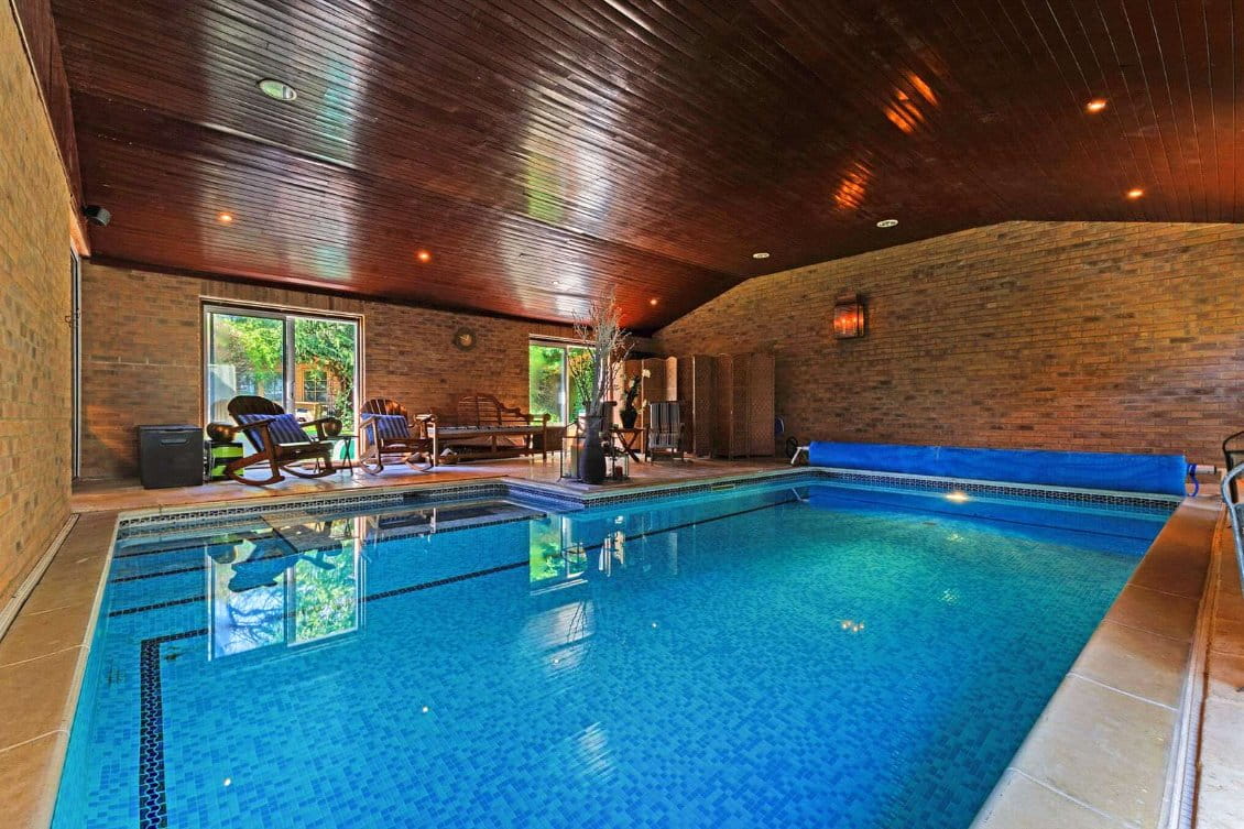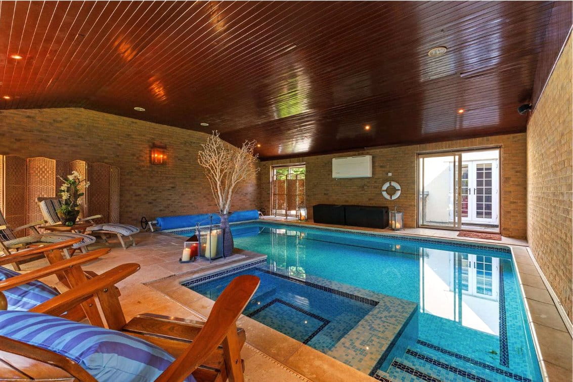 Beyond are internal doors which open directly into the indoor spa area with swimming pool, offering plenty of space for seating, tables, loungers, or gym equipment. The pool area includes a jacuzzi zone and creates an ideal space for relaxation and entertaining. The ground floor also includes two shower rooms, one of which is conveniently located next to the indoor swimming pool.