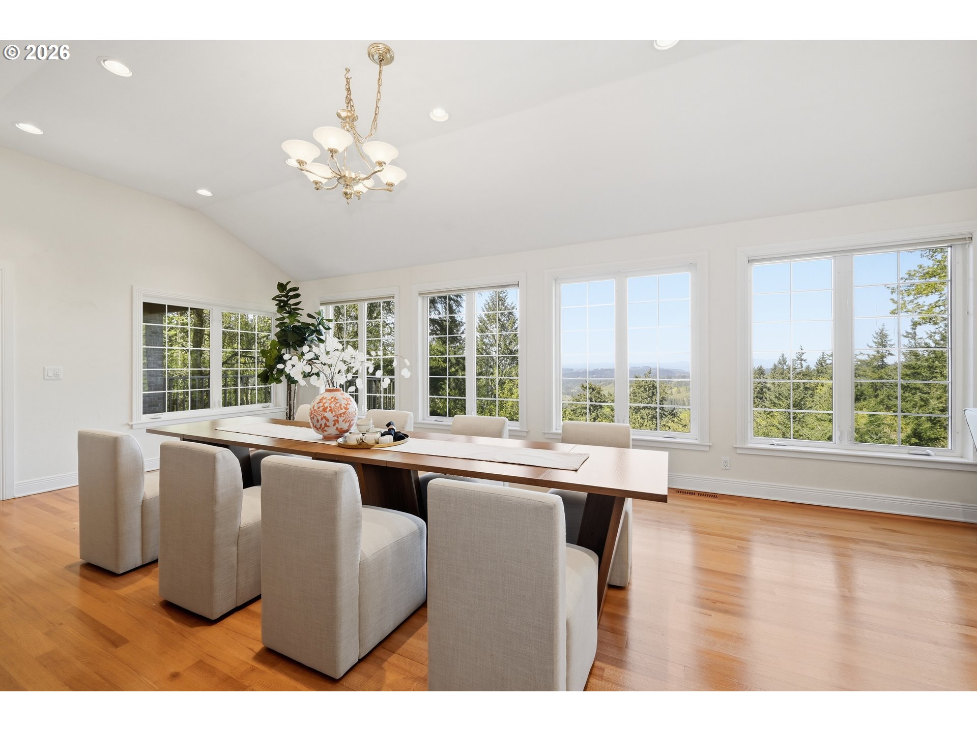 You will find this absolutely stunning home in one of Eugene's best kept secret places. It offers breathtaking views of the valley, western mountains, and Fern Ridge Lake from every room and is situated at the end of a paved private road. Surrounded on the other 3 sides are the mature forests of Spencer Butte Park making this an unmatched quiet & serene setting, yet only minutes from city shopping centers. Stepping inside immediately creates a sense of AWE, elegance and comfort. High-end finishes, soaring ceilings, and beautiful flooring throughout set the tone, while expansive view windows frame the serene natural beauty. The primary suite is truly exceptional, featuring a step-in jetted tub, an oversized shower, wood burning fireplace, walk-in closet, dual vanities, two private balconies that overlook the views. The gourmet kitchen is equipped with all the amenities you would expect including SS appliances, gas cooktop, built-in oven, slab granite counter surfaces & more. The grand dining room and living room each showcase walls of windows and a fireplace creating a warm inviting space. The lower level has 3 additional bedrooms, one with an exterior entrance, and a temperature controlled wine cellar with built-in wine racks. A huge covered view deck with an outdoor kitchen extends the living to outdoors perfect for entertaining or just relaxing. The detached 2.5 bay garage has a large office/art studio above with an expansive view of the mountains accessed by exterior stairs. As you come up the paved driveway you will pass a 1,600 sq ft heated, well lit shop and RV/boat storage, plus a separate building ideal for a studio, gym, or game room. The naturalized landscaping features massive rhododendrons and requires no irrigation. Wildlife and nature surround you. This is a rare combination of luxury, privacy, and proximity to town and an extraordinary retreat with views that never get old.