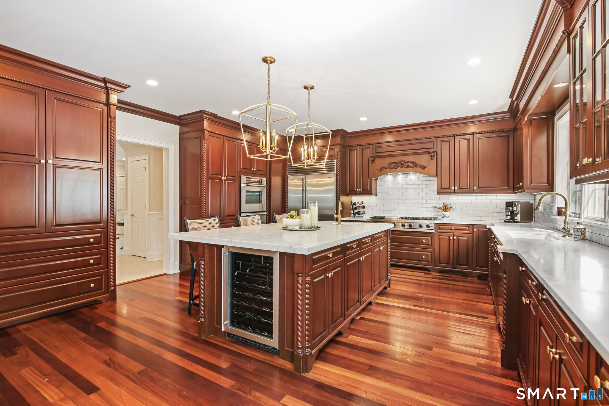 Elegant Colonial set on a private, beautifully landscaped acre in North Stamford. Built in 2005, this 5 bedroom, 5.5 bath home offers timeless design, high ceilings, Brazilian hardwood floors, and detailed custom millwork throughout. A grand foyer leads to formal living and dining rooms, a private office, and a chef's kitchen with high-end appliances, opening to the family room with fireplace and stone patio-ideal for everyday living and entertaining. A main-level bedroom adds flexibility, and an elevator from the garage to the main level adds convenience. Extensively updated with full propane conversion, three new AC systems, new boiler, water system and tank, roof, driveway, and garage doors, plus radon mitigation, fresh interior paint, updated powder room, and a fully fenced backyard. Kitchen features new Danby marble countertops, backsplash, dishwasher, two sinks, garbage disposal, and updated faucets, hardware, and lighting, with matching Danby marble countertop, sink and hardware in the butler's pantry. Additional updates include new dryer and exterior lighting fixtures with timers. Upstairs, the primary suite offers a private retreat with fireplace and spa-like bath. A second suite features a walk-in closet and en suite bath, plus two additional en suite bedrooms. Walk-up attic offers expansion potential. Three-car garage with temperature control and hot/cold water connection. Convenient to High Ridge Rd, New Canaan, and Pound Ridge