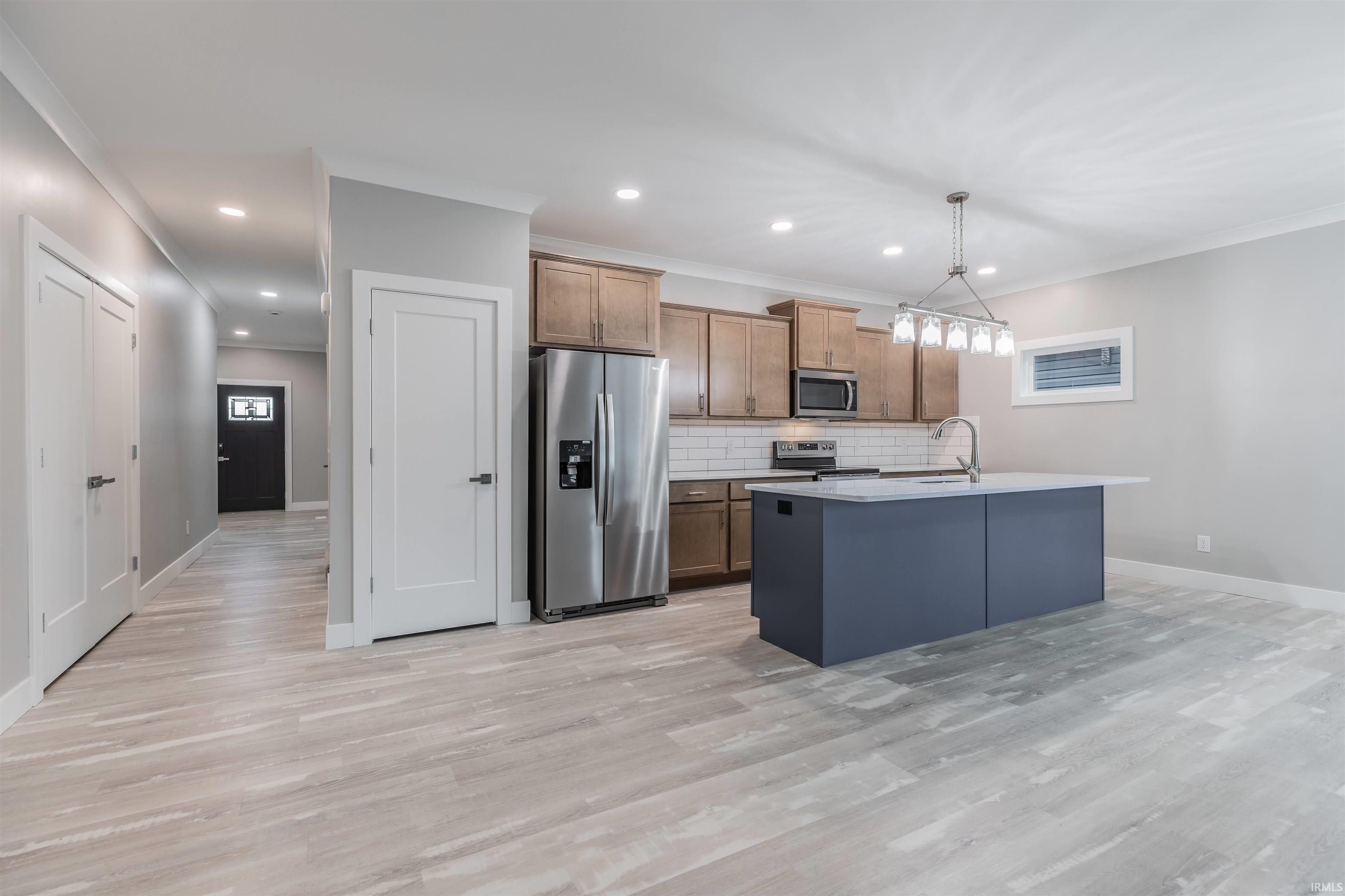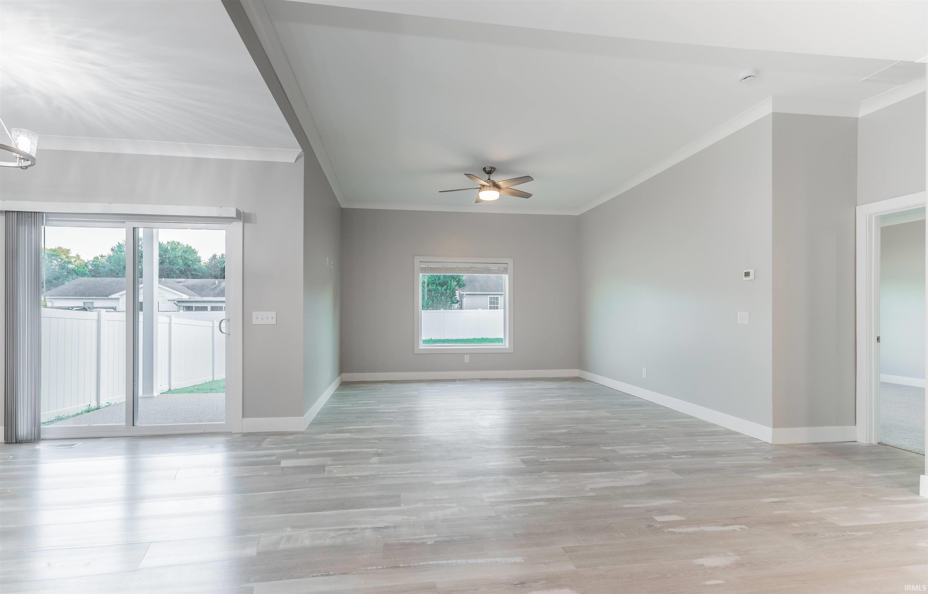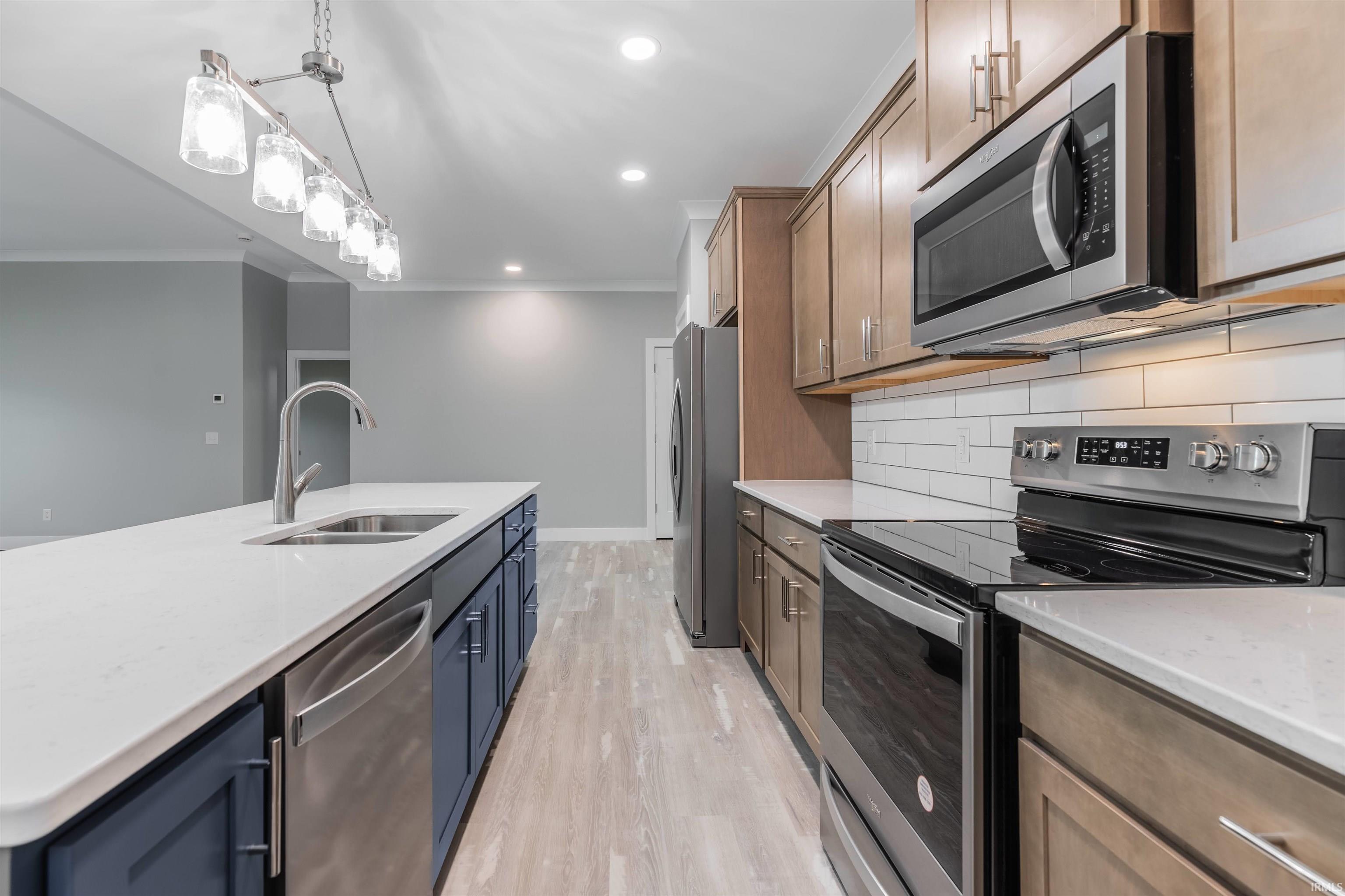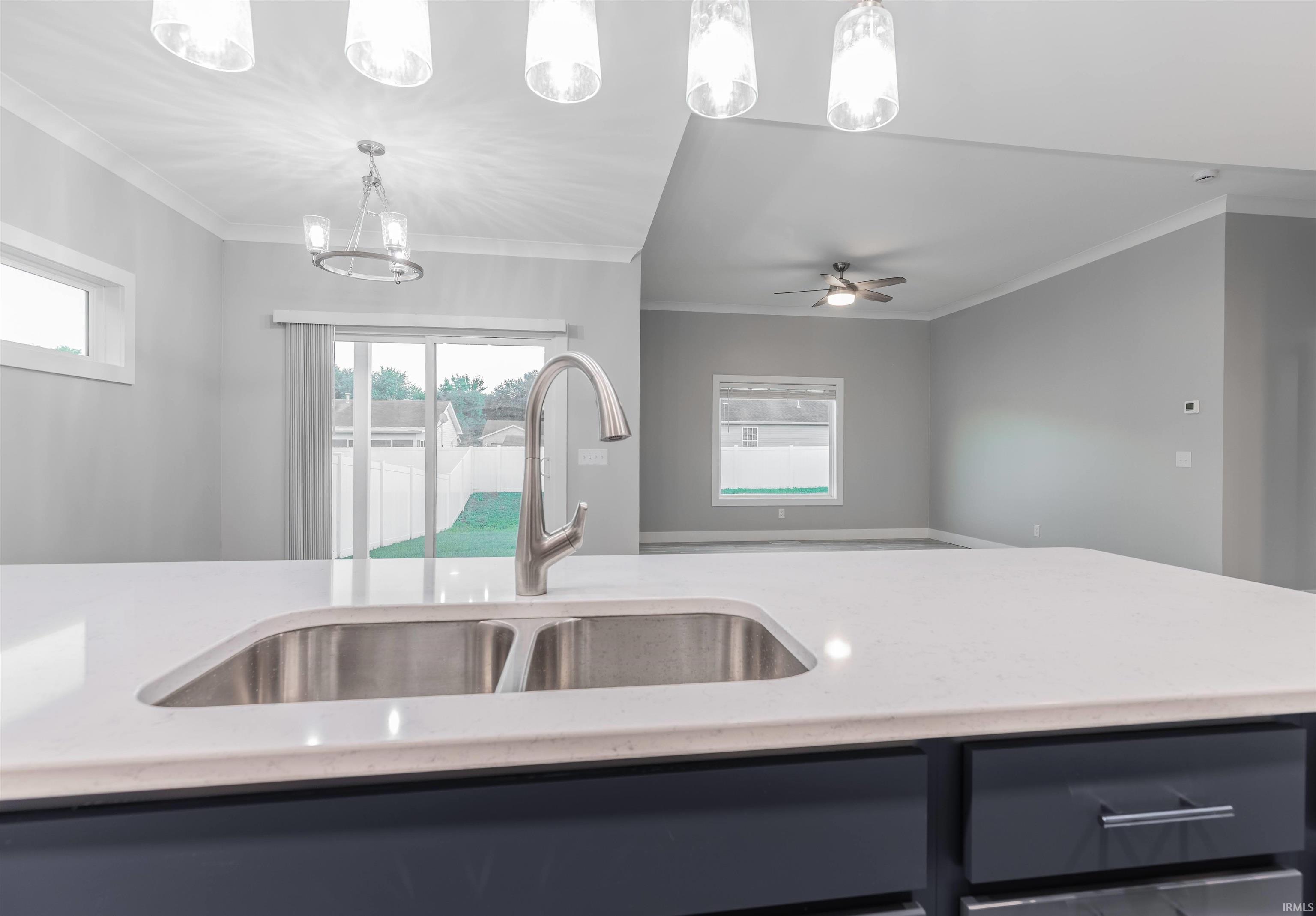 Located in McCutchanville on cul-de-sac street with sidewalks and aggregate driveways, This newly constructed home stands out with features you won't typically find - including a full vinyl privacy fence already in place. Offering over 2,100 square feet, the open-concept design welcomes you with a spacious foyer and 9-foot smooth ceilings, complemented by crown molding, tray ceilings, 6-inch baseboards, and wood shelving throughout. The kitchen blends style and function with white and gray cabinetry, granite countertops, an oversized breakfast bar, castled cabinets, subway tile backsplash, and a large walk-in pantry - plus all appliances and window blinds are already included. The owner's suite is tucked privately at the rear of the home, featuring a walk-in closet with wood shelving and a beautifully finished bath with dual vanity and tiled walk-in shower. Two additional bedrooms are positioned on the opposite side for added privacy. Upstairs, a versatile bonus room with landing space offers the perfect setup for a media room, office, or flex space. Enjoy the covered back porch overlooking the FULLY fenced yard (maintenance free) , along with a dedicated laundry room with cabinetry and a 2-car garage complete with an additional storage room. This home is priced great , brand new and with all the upgrades you can imagine! Few lots left on this one street development so construction is near the end. See the highlight sheet with more details.