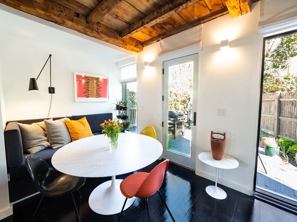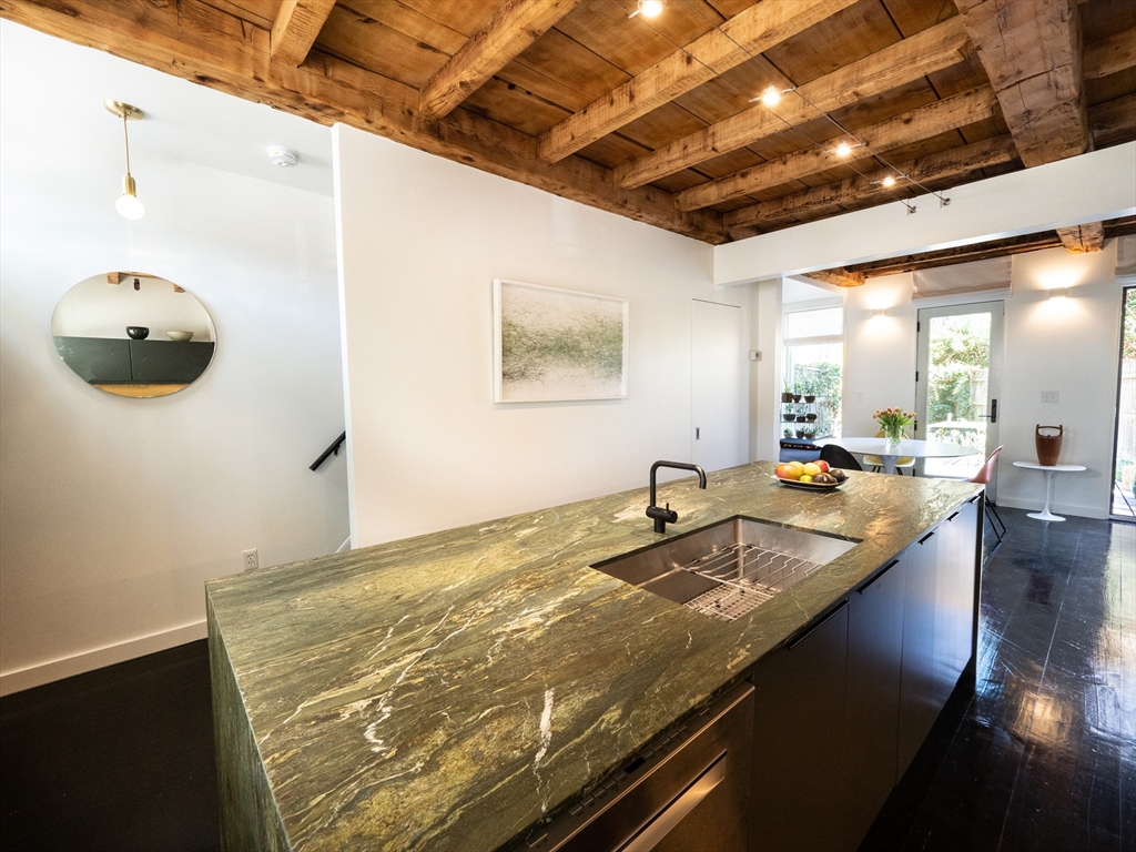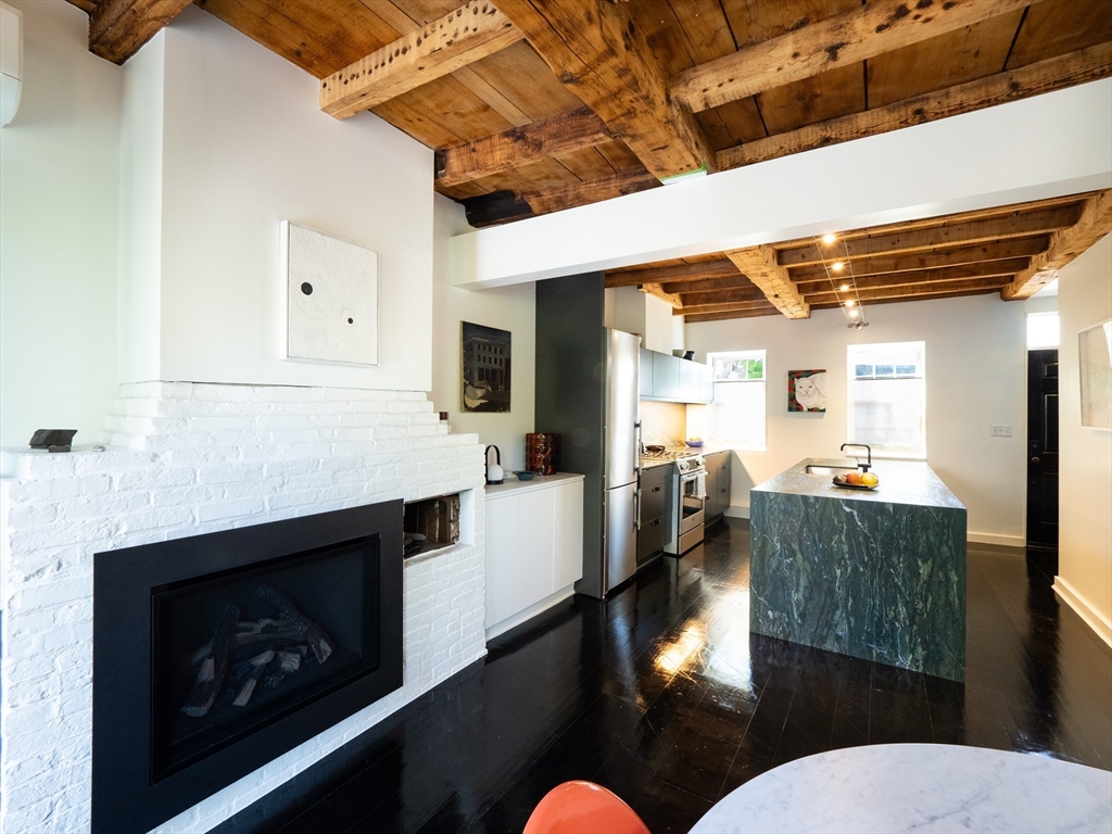 A 1826 brick rowhouse completely updated into a custom artist loft-like single-family home, done by an artist & an architect. You are greeted by a stunning kitchen showcasing an oversized leather-textured marble countertop, custom cabinets & gas stove with accompanying stainless steel appliances. From the kitchen, you see right through the rest of the open main floor to a flex space that you can use as a dining area or lounge with a gas fireplace. Walk out the main floor to your own private yard complete with a bluestone patio & access to a private parking spot (w/ EV charging capability). Second floor is a fully open layout with a custom walnut wood built-in desk & custom cabinets, as well as a recently renovated full bath with a stand-up shower. The master bedroom is the entire top floor w/ large windows & a double deep closet. Original king pine 12-18 inch stained hardwood floors throughout. In the basement: a washer/dryer, slop sink; room for storage or your own workshop. Avail 9/1