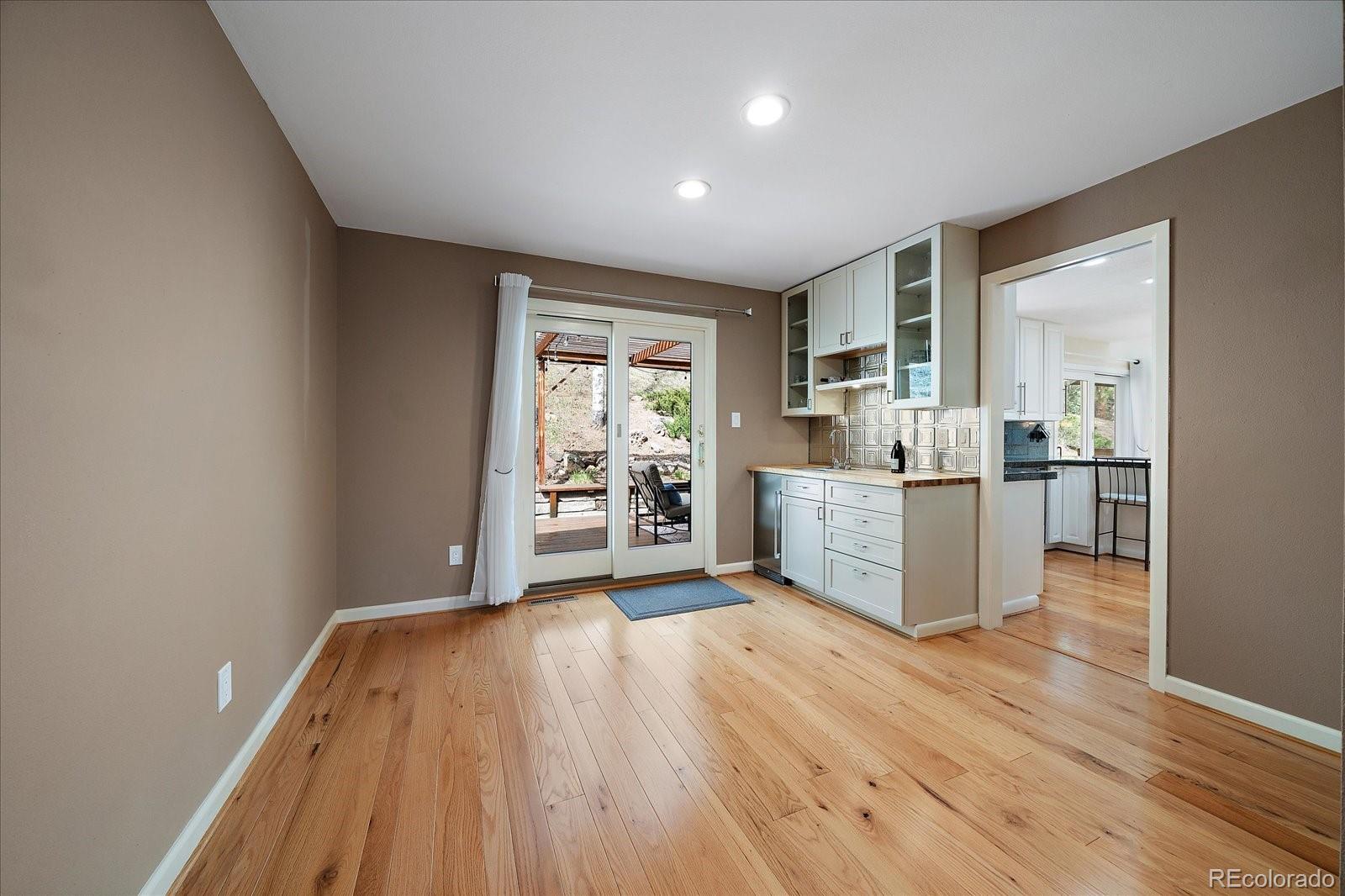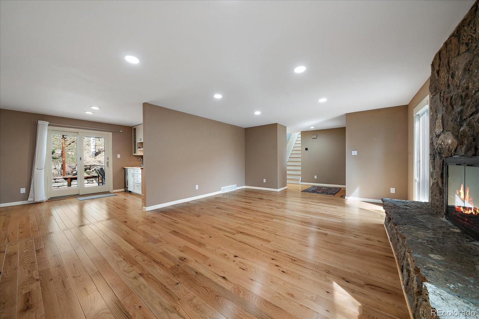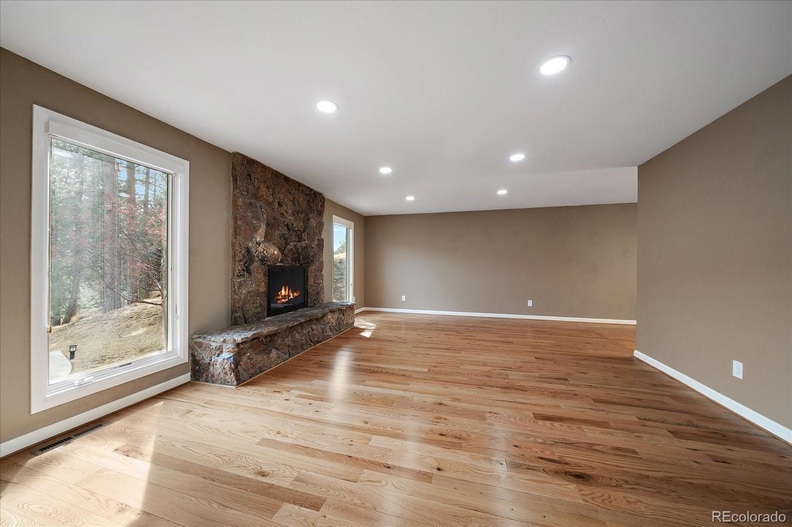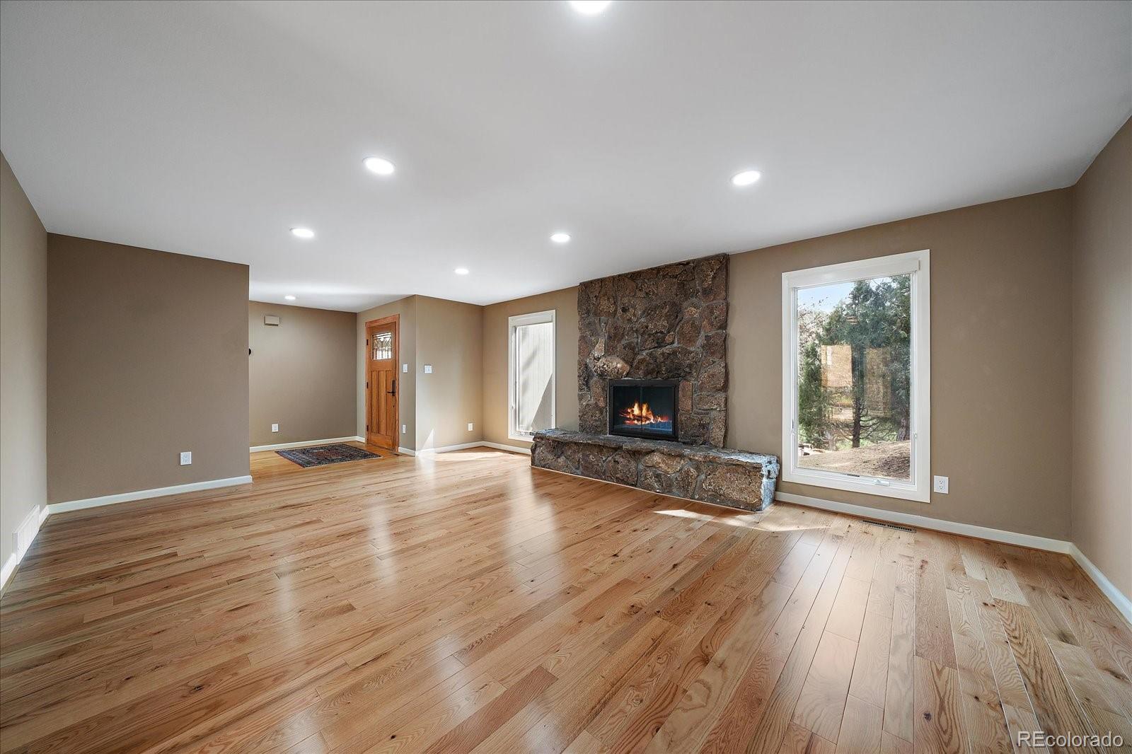 Tucked among the pines, fully remodeled and located on a quiet culdesac, 4039 Histead Way offers the perfect blend of serenity and comfort. The main floor has a nice flow with beautiful wood floors in the living room, dining room and kitchen. Spend evenings enjoying the wood burning moss rock fireplace with a custom insert while entertaining or relaxing. The dining area has a new wet bar complete with a refrigerator, cabinets and designer accents. From the well appointed kitchen you'll have access to the private inviting redwood deck with a pergola, sun shades, extra seating and a serene fountain. A family room with space for a large group and plenty of built-in storage is a bonus. On the main level, there is also a half bath and a bedroom which could be used as an office. The upper level hosts a spacious primary bedroom with Bear Mountain views, wood floors and cathedral ceilings, an updated ensuite bath with high-end finishes and a wall of custom closets. Two additional bedrooms are located on the upper level, both with wood floors, plus there is one additional updated bathroom with double pedestal sinks and a jetted, soaking tub. The Sellers have done a spectacular job mitigating the home with fire screens under the deck, a mitigation report from Evergreen Fire Department, metal facia and a steel coated metal roof installed in 2024. Seller is installing a new furnace and hot water heater. See the Special Features document for additional features. The acreage provides privacy, a basketball court and the perfect sledding hill with a soft landing near the culdesac. Located just minutes from downtown Evergreen, you'll enjoy easy access to local shops, dining, trails, and Evergreen Lake, while still savoring the privacy and quiet of mountain living. With convenient access to Denver and the mountains, this property offers the best of both worlds - peaceful retreat and city accessibility.