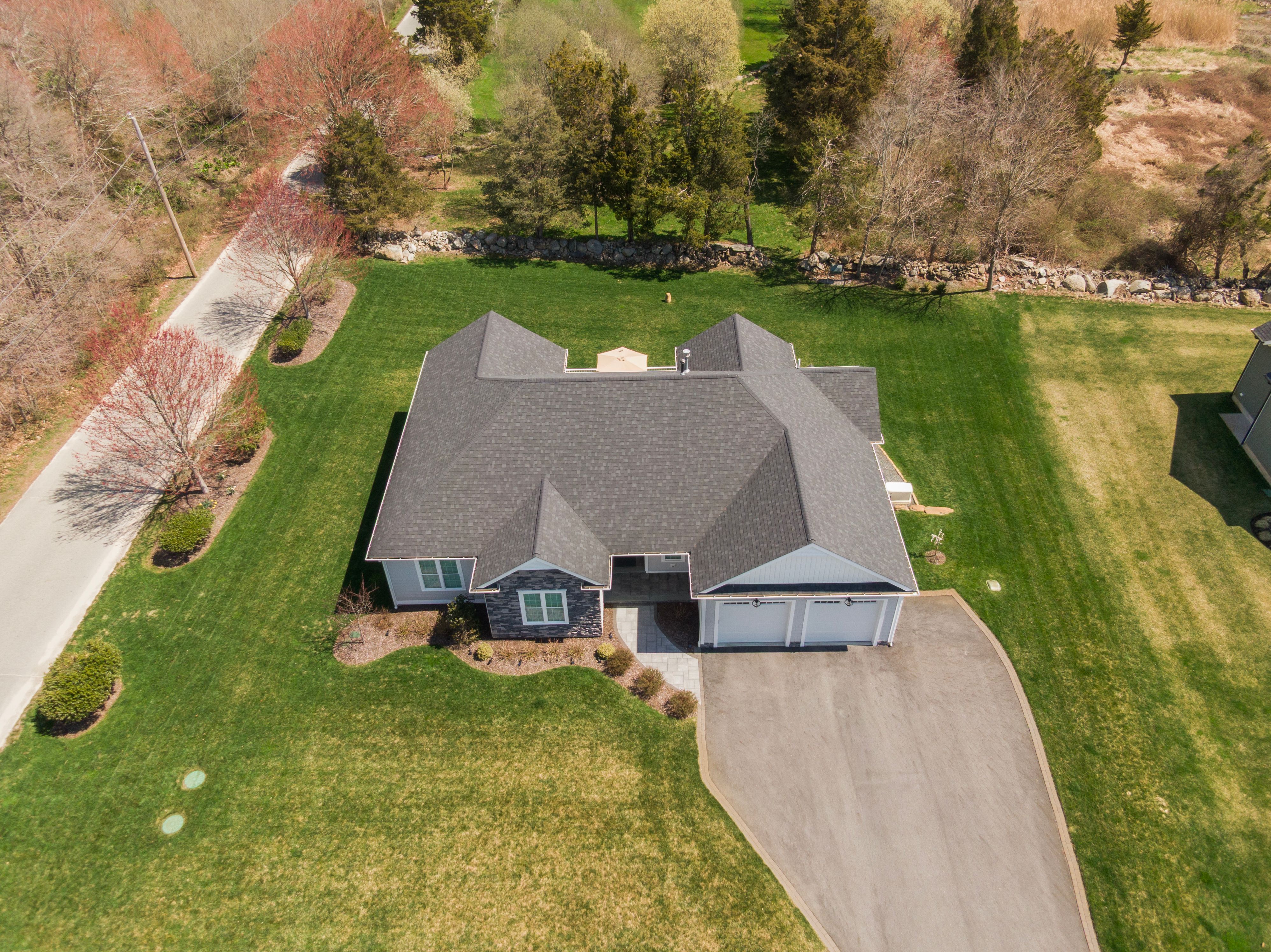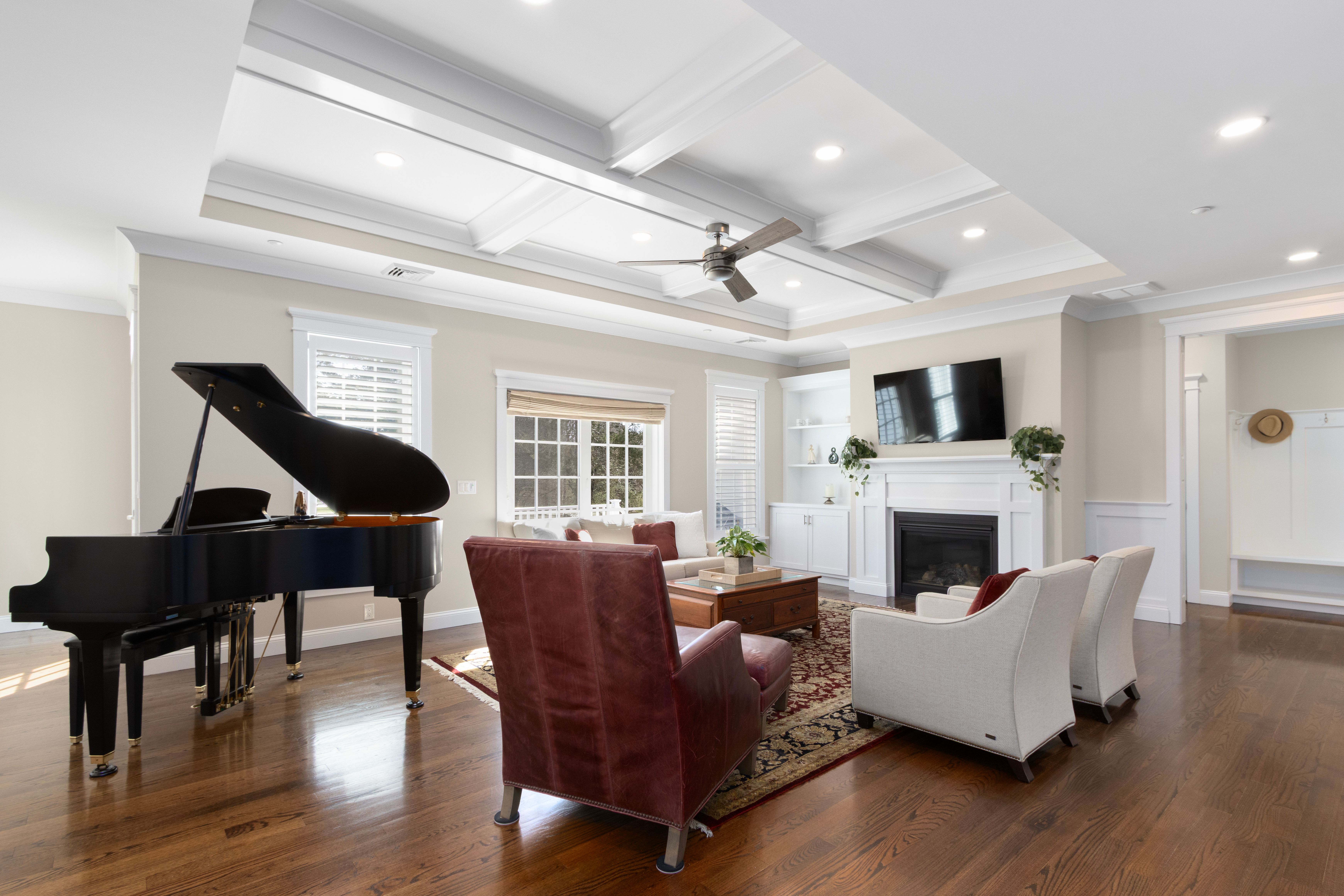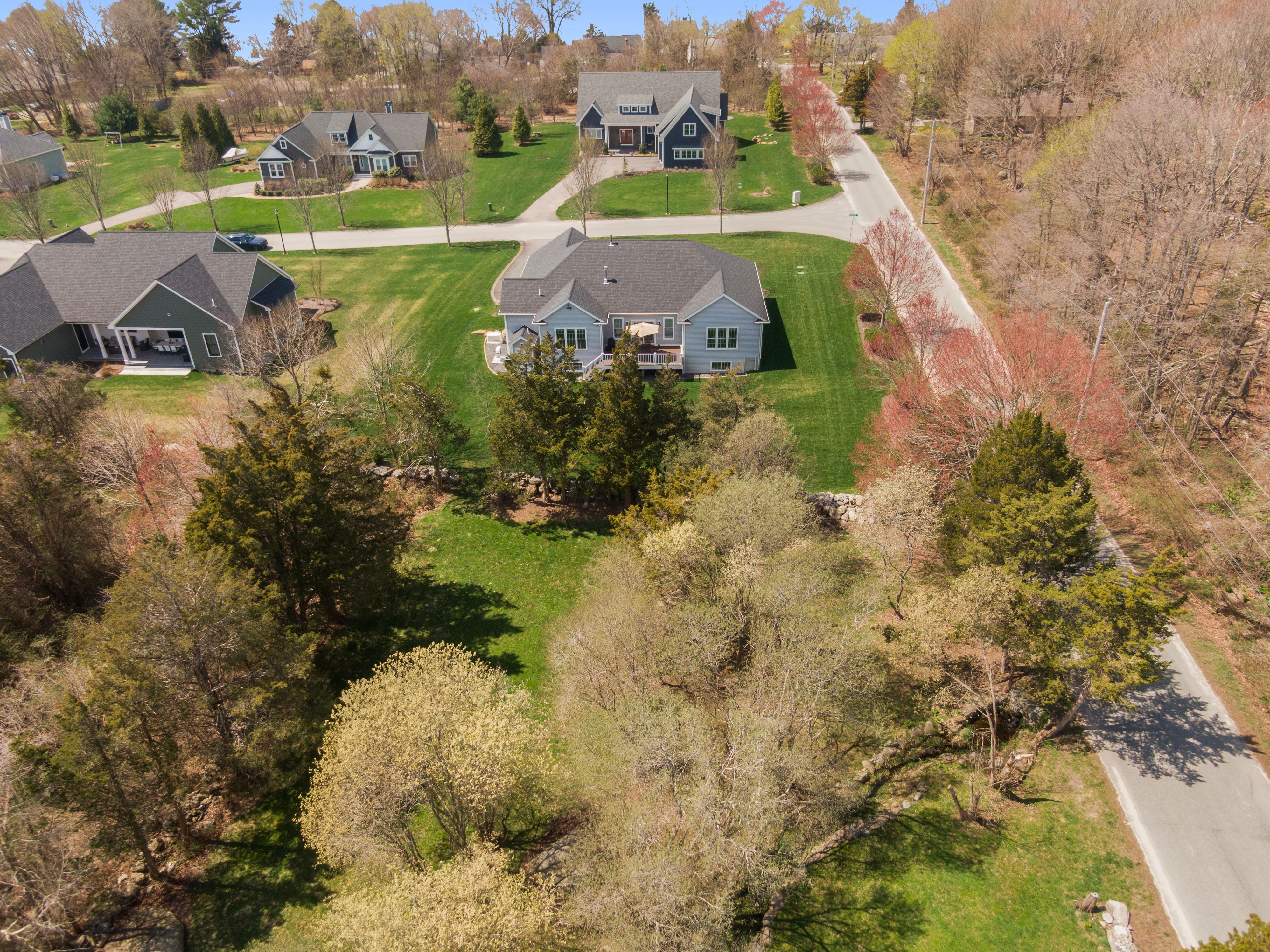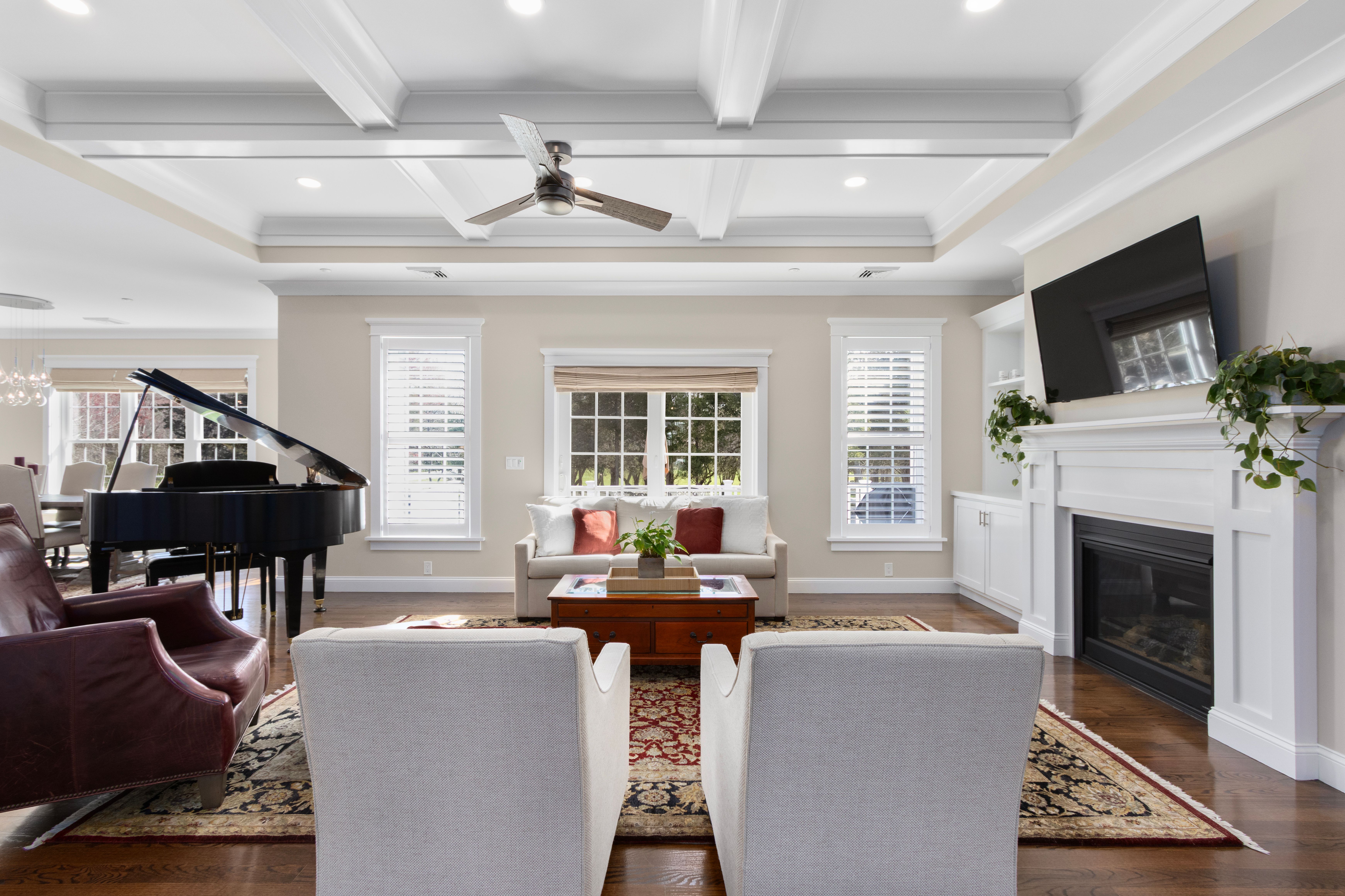 This beautifully maintained ranch-style home offers 3 bedrooms and 2.5 baths, blending timeless design with modern comfort. A light-filled open floor plan features 10-foot ceilings and elegant coffered ceilings in the family room, where a cozy gas fireplace serves as the centerpiece. Hardwood floors extend throughout the main level, complemented by ceiling fans that enhance comfort and efficiency. The spacious eat-in kitchen is designed for both everyday living and entertaining, boasting a large center island, abundant cabinetry, and seamless flow into the living and dining areas. Custom trim work throughout the home adds a refined, classic touch. The primary suite is a true retreat, highlighted by tray ceilings, a custom walk-in closet, and a spa-like bathroom. The recently finished lower level expands the living space with a media room, surround sound, custom built-ins, and a convenient half bath perfect for relaxing or hosting guests. Enjoy peaceful outdoor living from the backyard porch overlooking a wooded backdrop and charming stone wall. Situated on nearly an acre, this move-in-ready home reflects exceptional pride of ownership and offers privacy, comfort, and lasting appeal. Residents may opt to join the Touisset Point Community Club for an additional fee, offering access to seasonal social events and recreational activities.