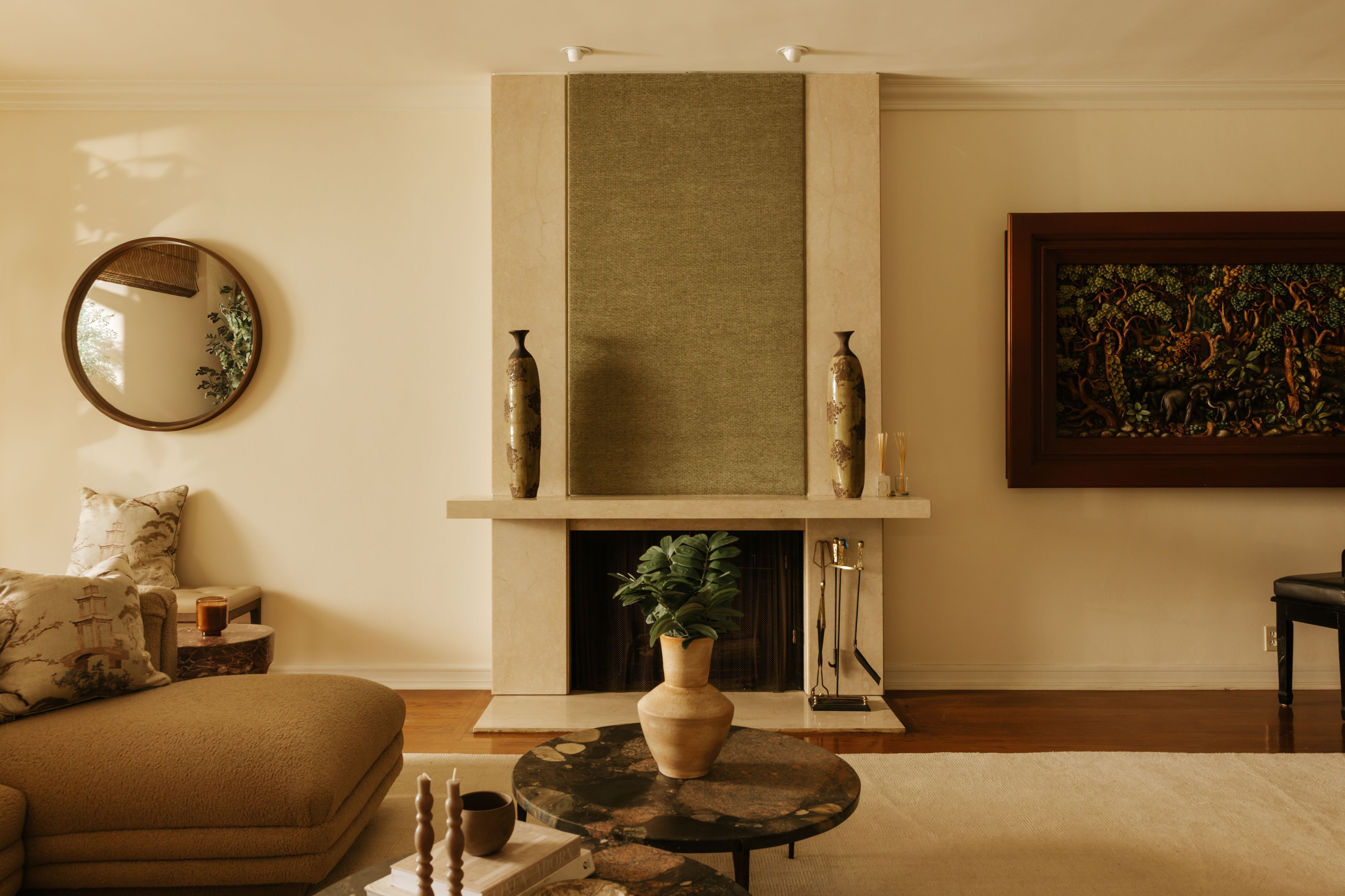 The interiors balance warmth and architectural presence, highlighted by a step-down family room with coffered, wood-inlaid ceilings and a striking Pennsylvania gray-blue stone fireplace. The chef’s kitchen serves as a central gathering space with custom cherry-wood cabinetry, Carrara marble countertops, a skylight, floating steel beams, and professional-grade appliances. A custom bar with fluted Gonzala wood cabinetry and a dramatic labradorite countertop adds a refined layer of entertaining, while the dining room is defined by a signature floating tapestry ceiling and seamless indoor-outdoor flow.