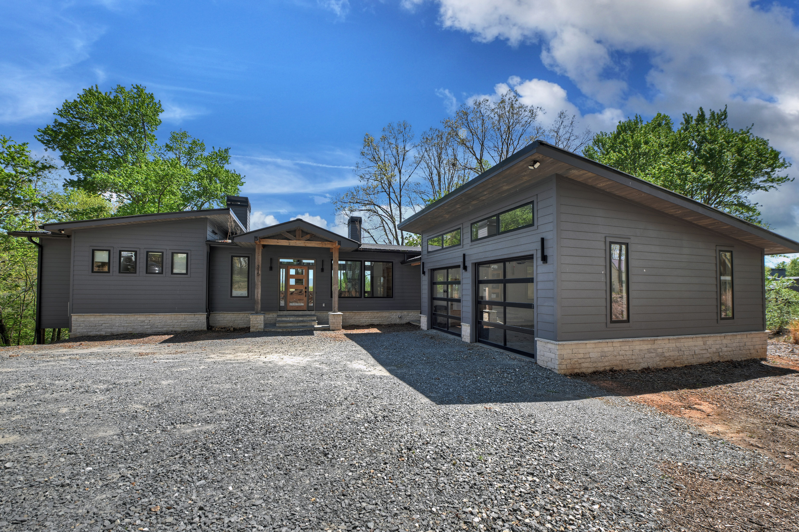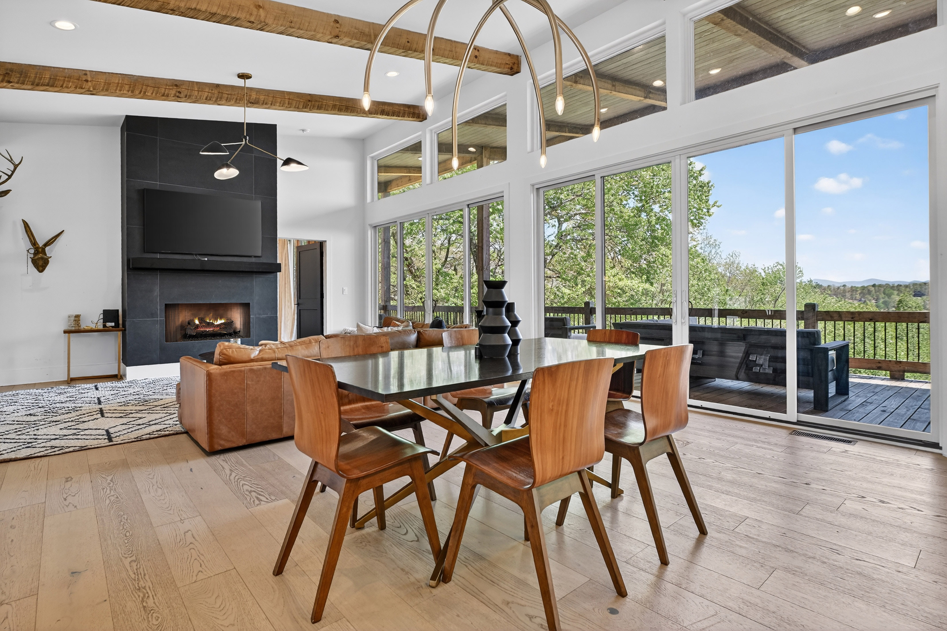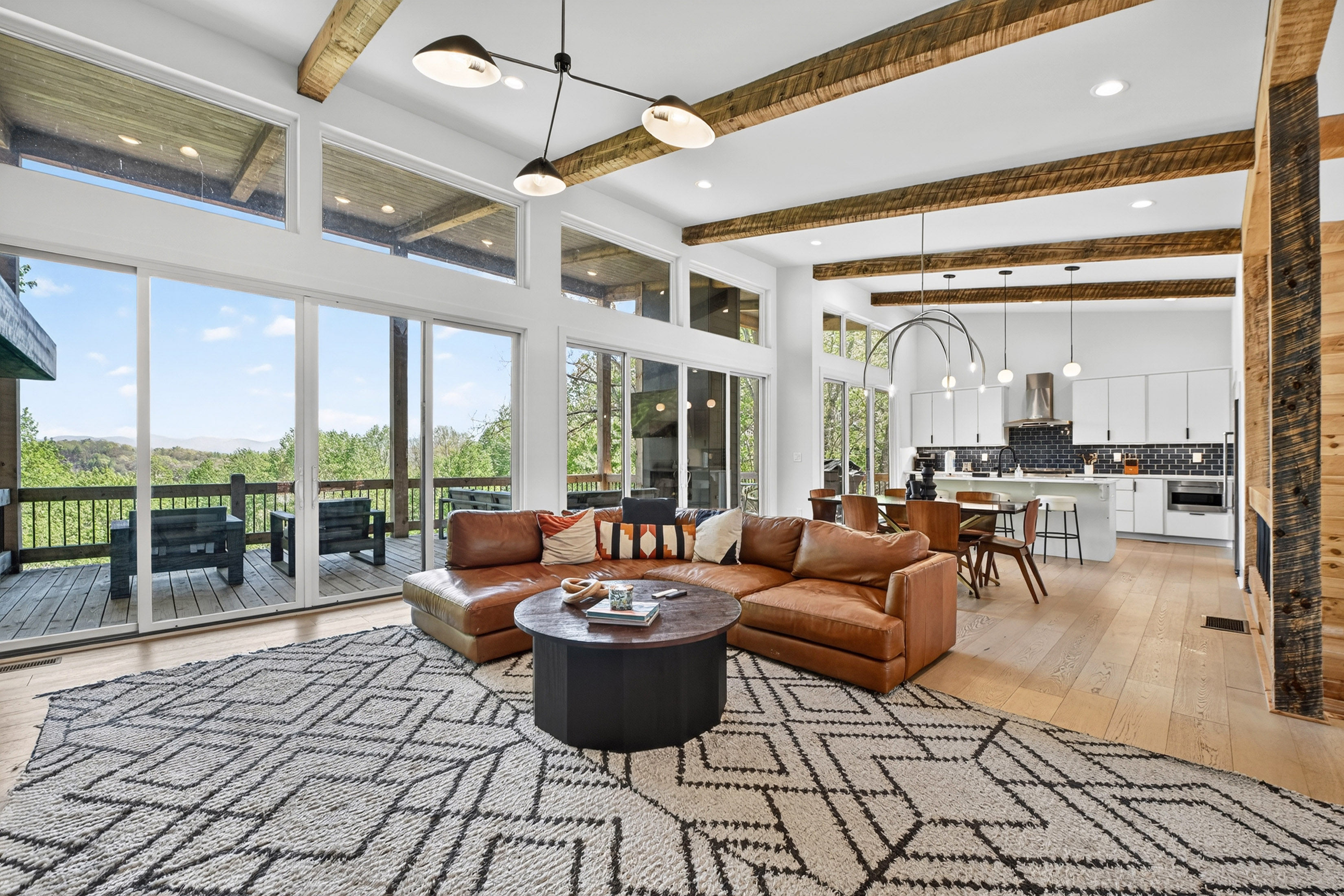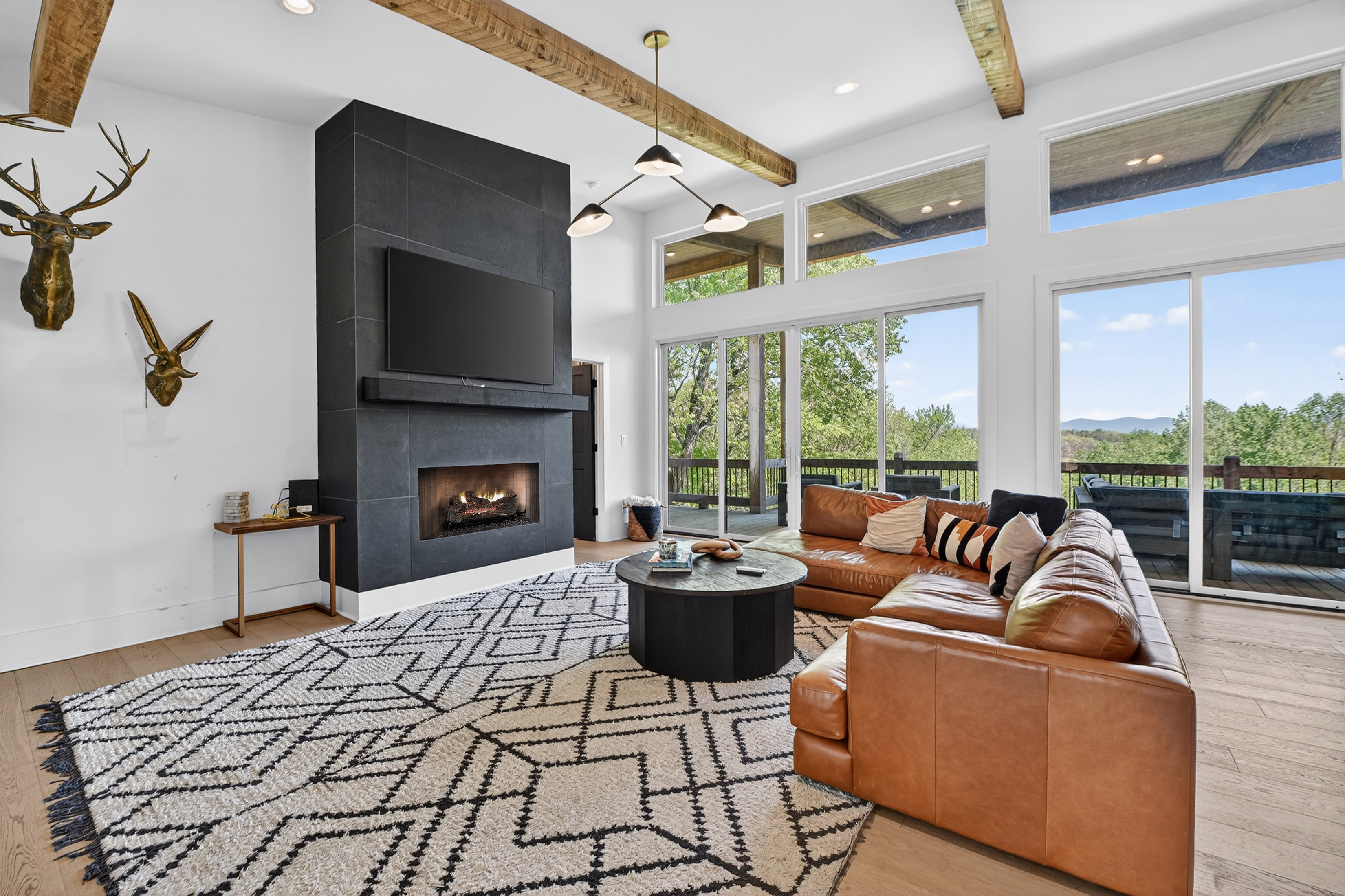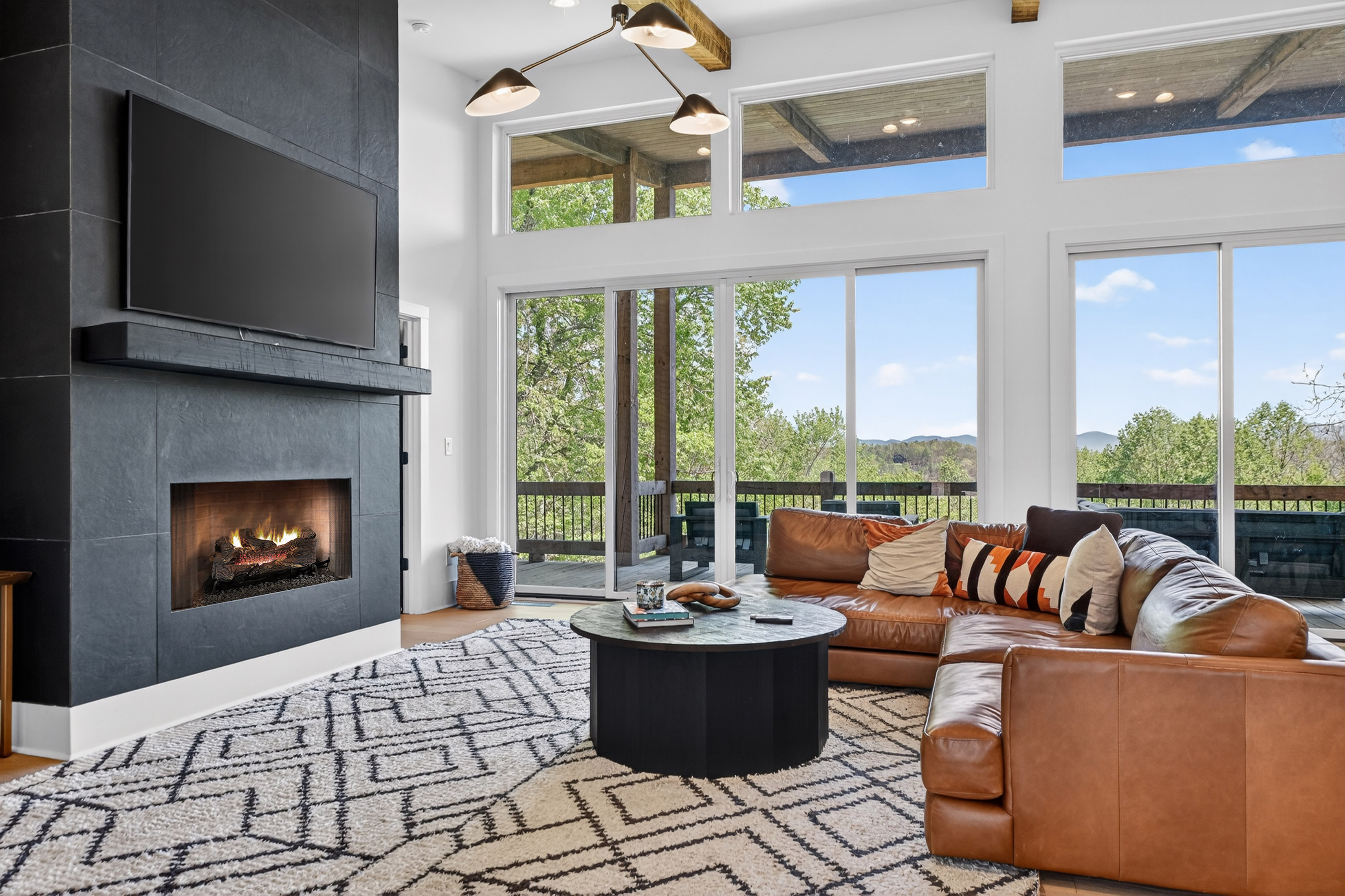 Positioned to capture sweeping year-round mountain views and rolling pasture, 315 Blue Berry Ridge is a striking contemporary chalet that seamlessly blends modern design with the natural beauty of North Georgia. Walls of glass and expansive sliding doors frame the landscape, filling the home with light and opening to a sprawling outdoor living deck anchored by a stone fireplace-designed for effortless indoor-outdoor entertaining. The main level offers a refined open-concept layout with a spacious living room, dining area, and a gourmet kitchen outfitted with stainless steel appliances, custom cabinetry, and a generous pantry. A large laundry and mud room provides functional ease with direct access to the detached, finished two-car garage. The primary suite on this level is a private retreat, complete with a spa-inspired en-suite featuring dual vanities, a walk-in tile shower, and a soaking tub. The terrace level is built for gathering and relaxation, offering a substantial den, game area, and full wet bar, along with two additional luxury bedroom suites for guests. Step outside to the walk-out patio where a hot tub and outdoor game area invite you to unwind beneath the mountain skyline. Offered fully furnished, this property is a proven high-performing short-term rental and an exceptional opportunity as a full-time residence, second home, or investment. Ideally located just minutes from Downtown Blue Ridge, Lake Blue Ridge, and endless hiking and biking trails, this is elevated mountain living at its finest.