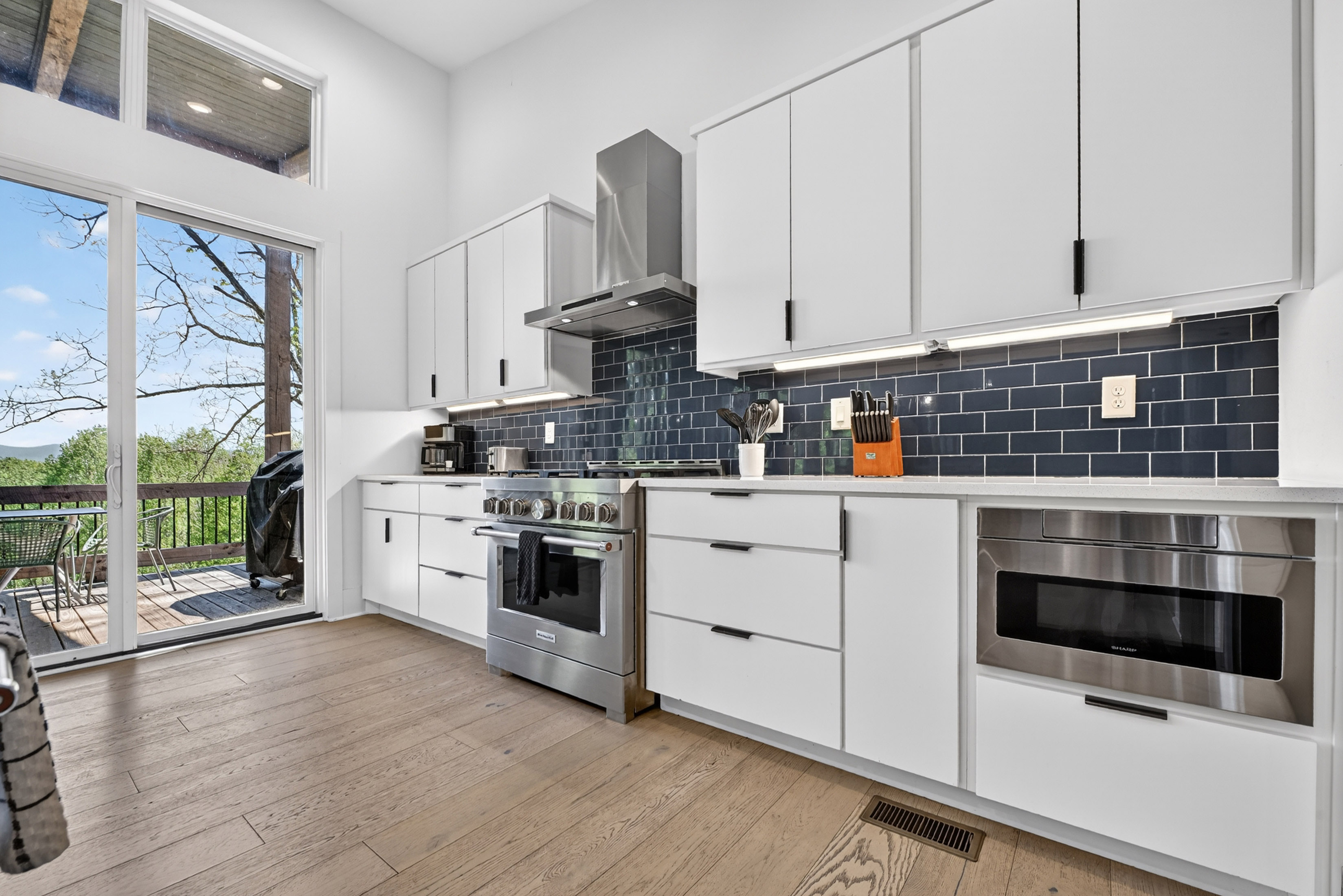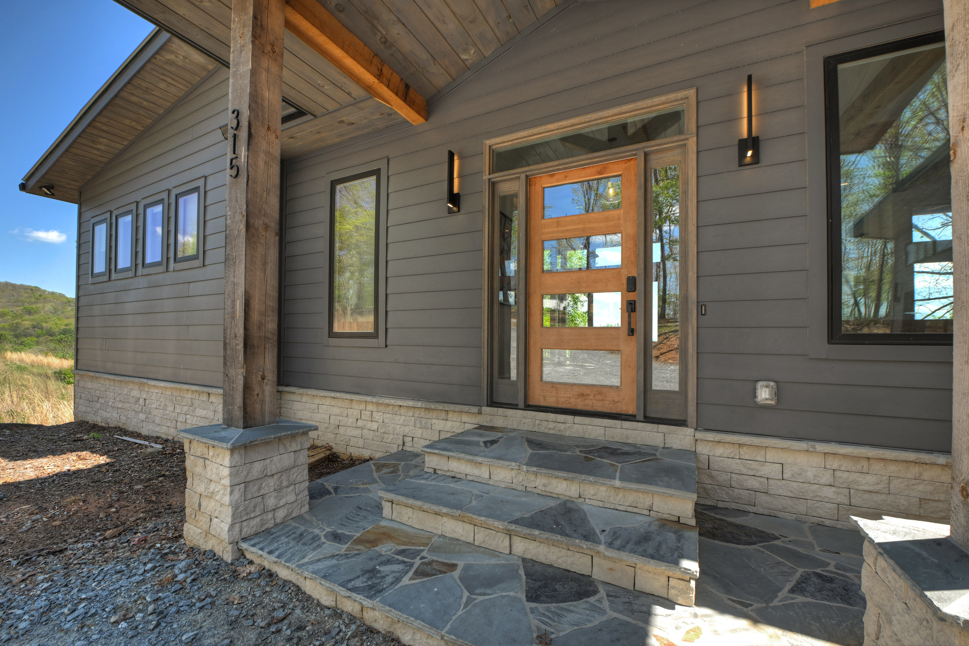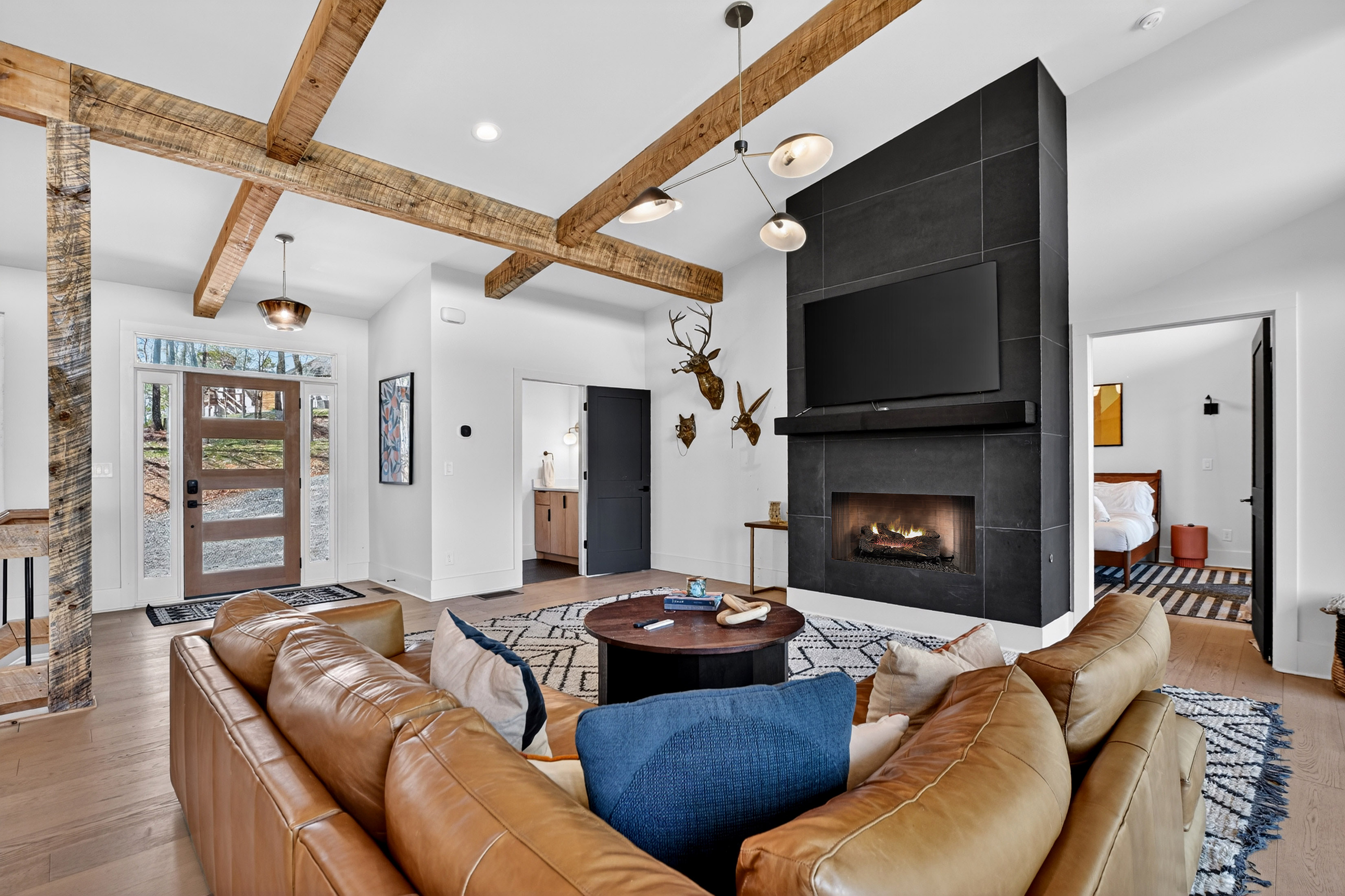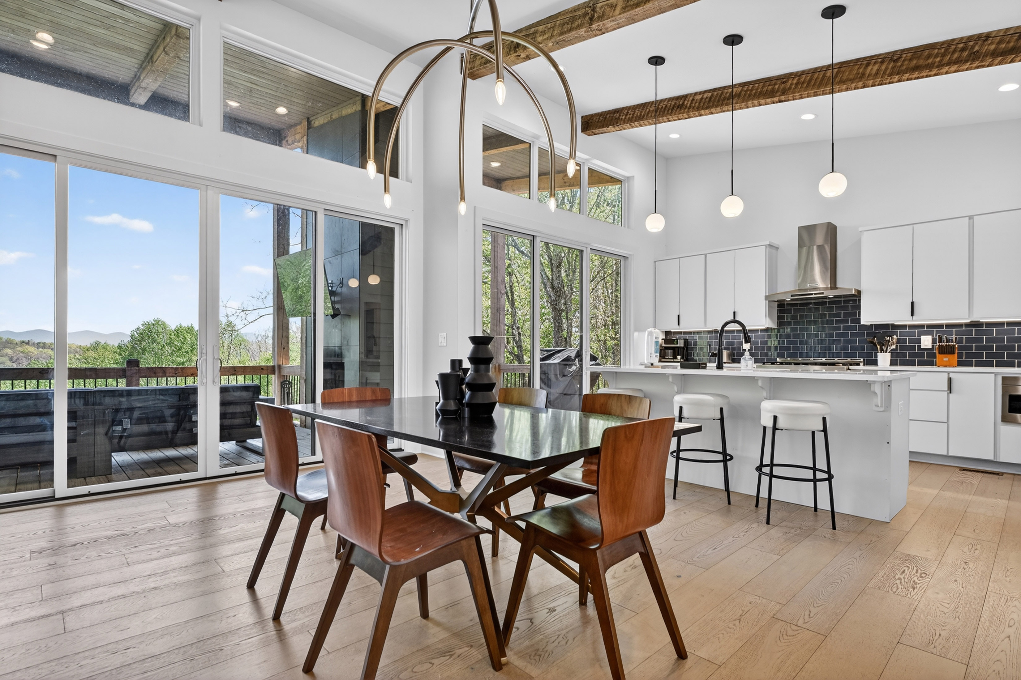 Positioned to capture sweeping year-round mountain views and rolling pasture, 315 Blue Berry Ridge is a striking contemporary chalet that seamlessly blends modern design with the natural beauty of North Georgia. Walls of glass and expansive sliding doors frame the landscape, filling the home with light and opening to a sprawling outdoor living deck anchored by a stone fireplace-designed for effortless indoor-outdoor entertaining. The main level offers a refined open-concept layout with a spacious living room, dining area, and a gourmet kitchen outfitted with stainless steel appliances, custom cabinetry, and a generous pantry. A large laundry and mud room provides functional ease with direct access to the detached, finished two-car garage. The primary suite on this level is a private retreat, complete with a spa-inspired en-suite featuring dual vanities, a walk-in tile shower, and a soaking tub. The terrace level is built for gathering and relaxation, offering a substantial den, game area, and full wet bar, along with two additional luxury bedroom suites for guests. Step outside to the walk-out patio where a hot tub and outdoor game area invite you to unwind beneath the mountain skyline. Offered fully furnished, this property is a proven high-performing short-term rental and an exceptional opportunity as a full-time residence, second home, or investment. Ideally located just minutes from Downtown Blue Ridge, Lake Blue Ridge, and endless hiking and biking trails, this is elevated mountain living at its finest.