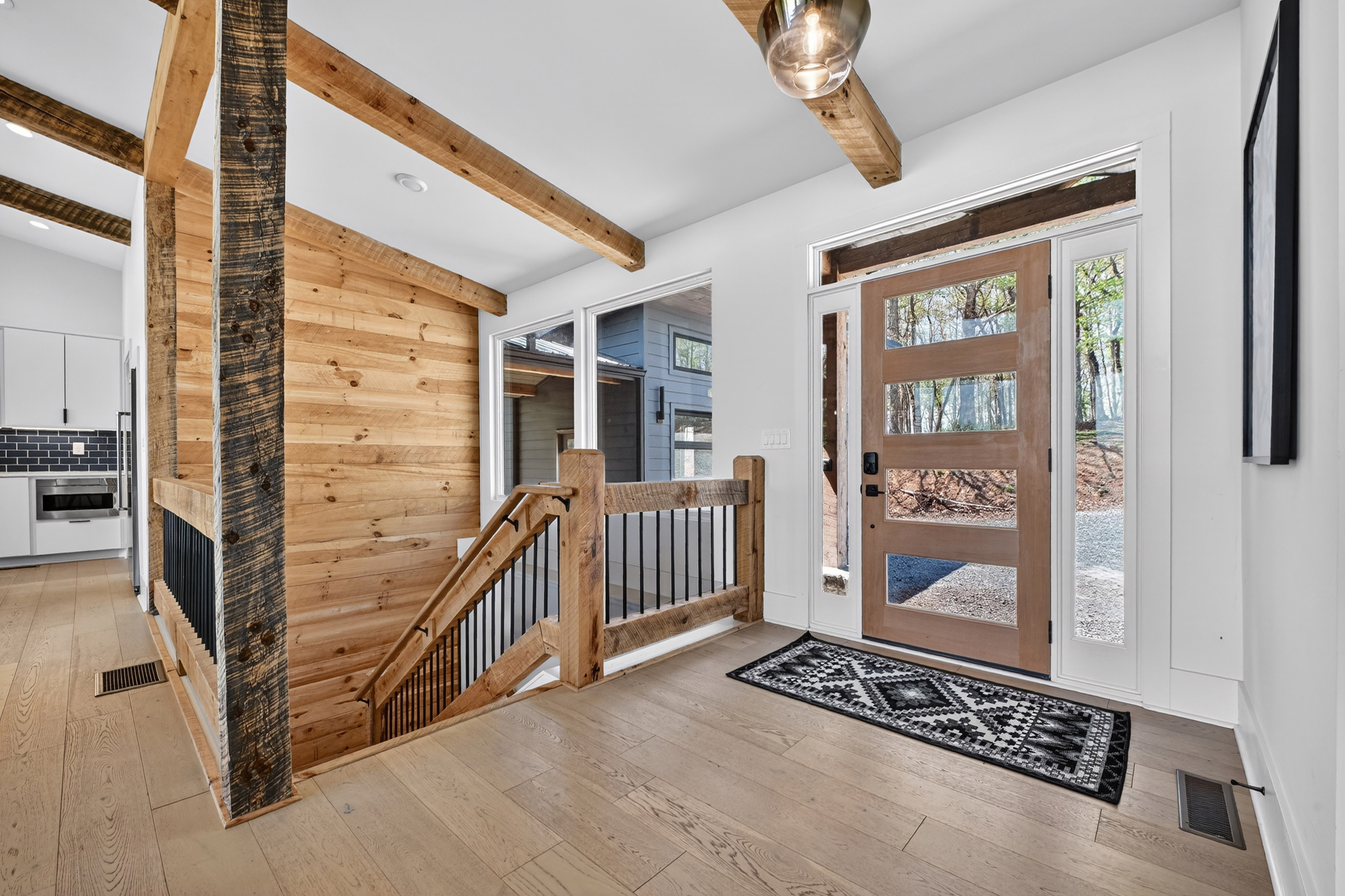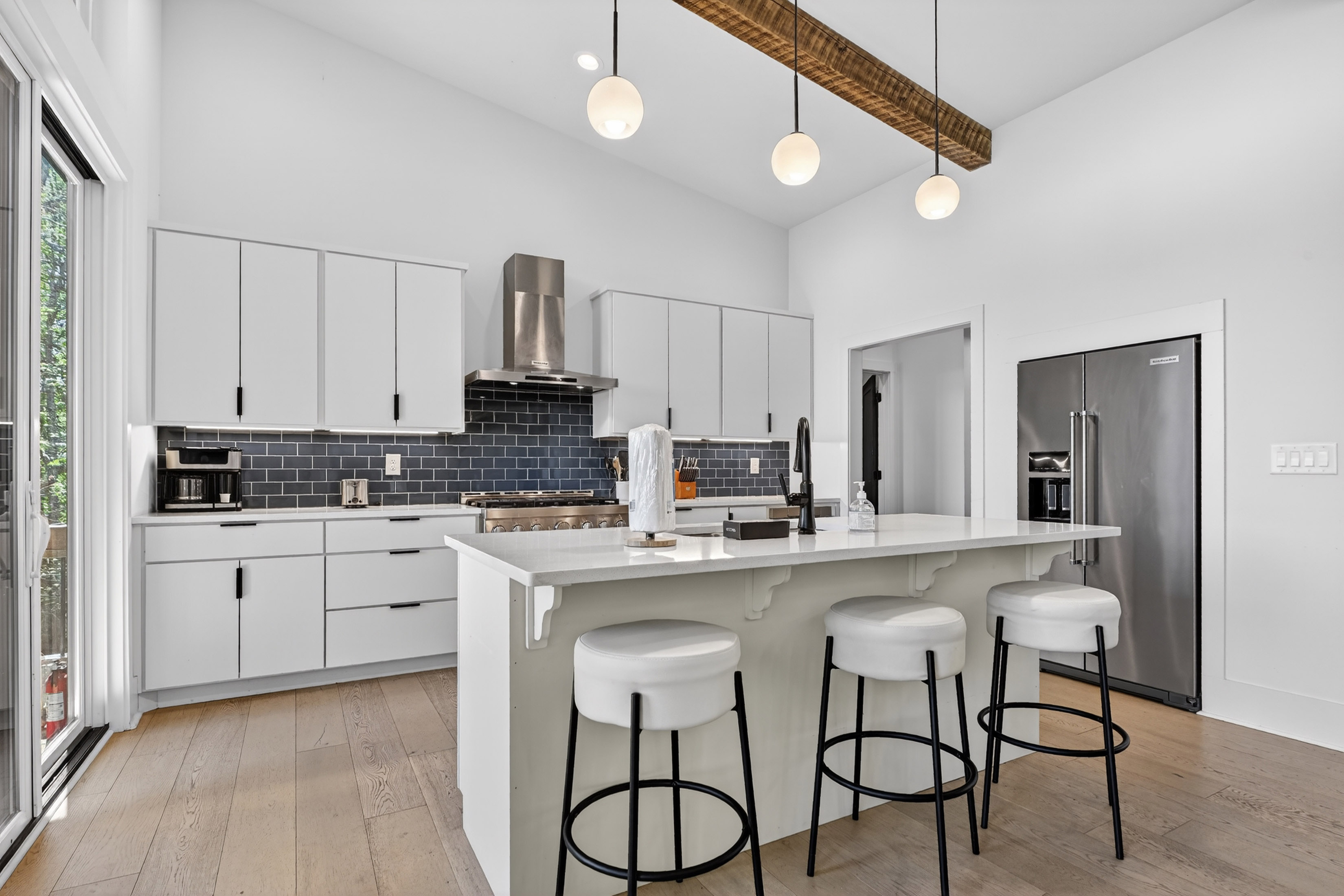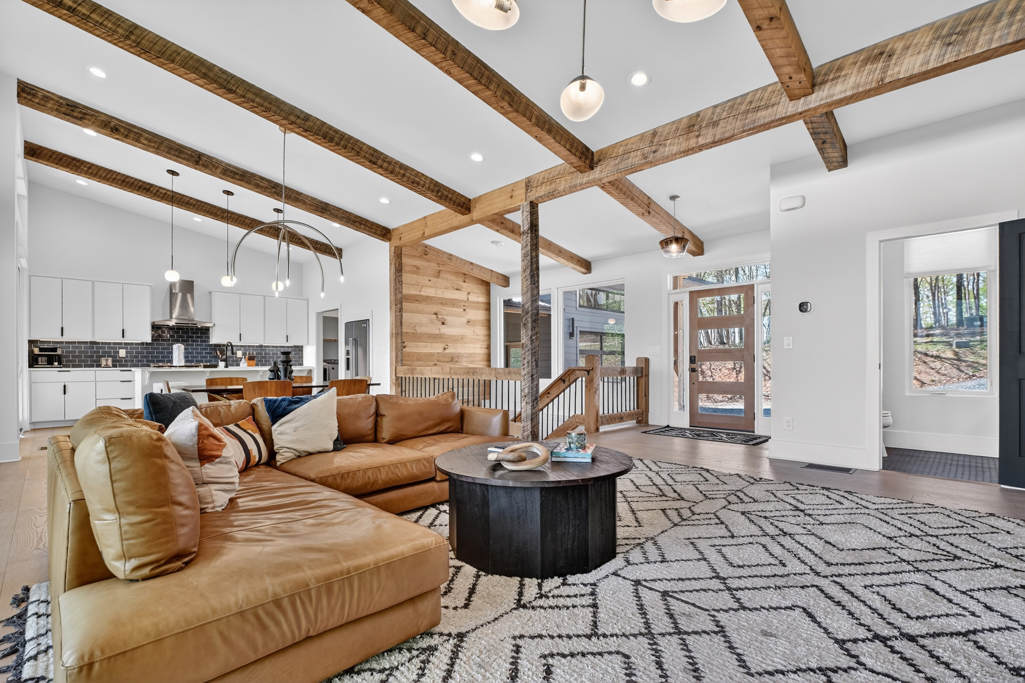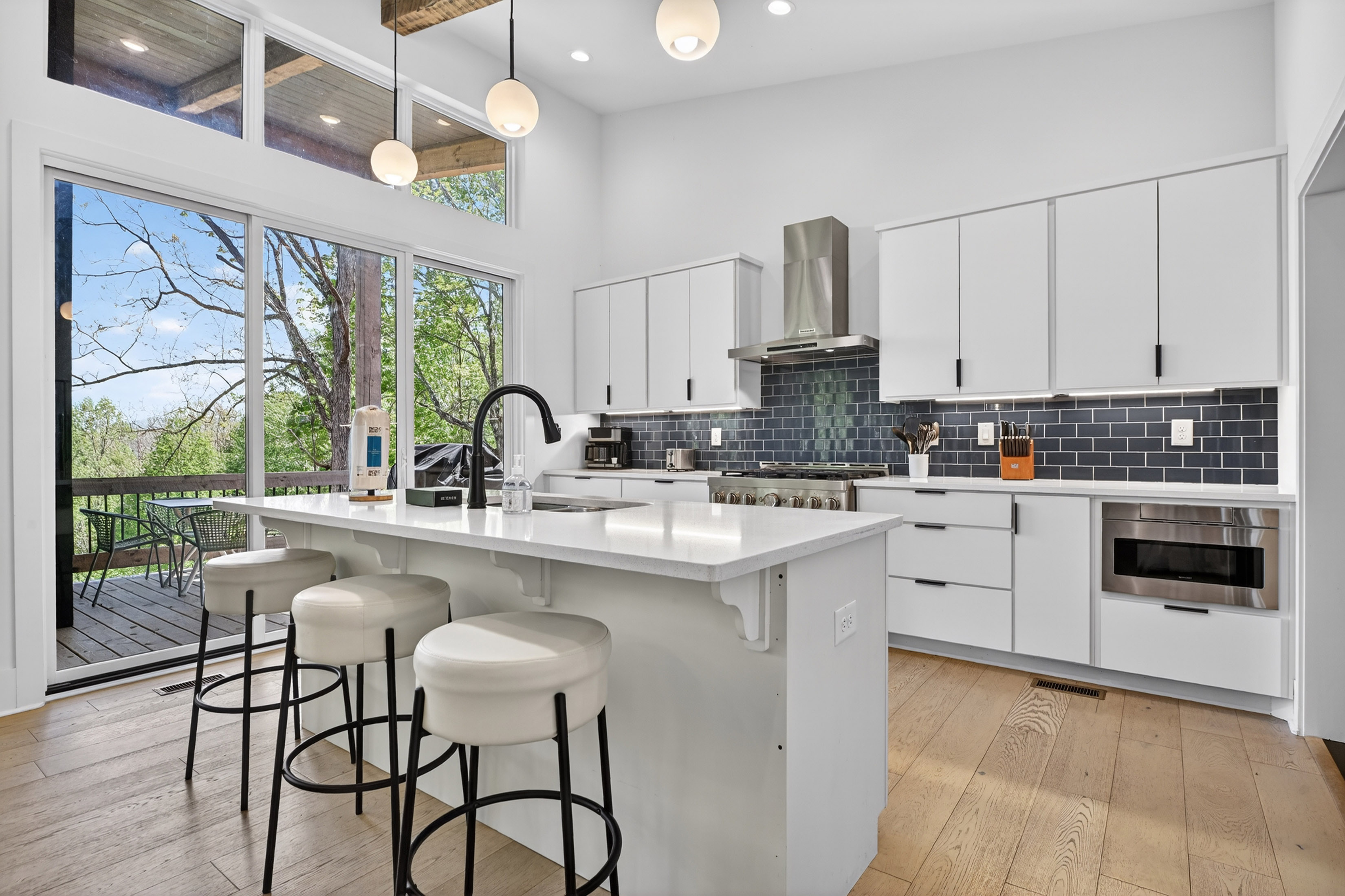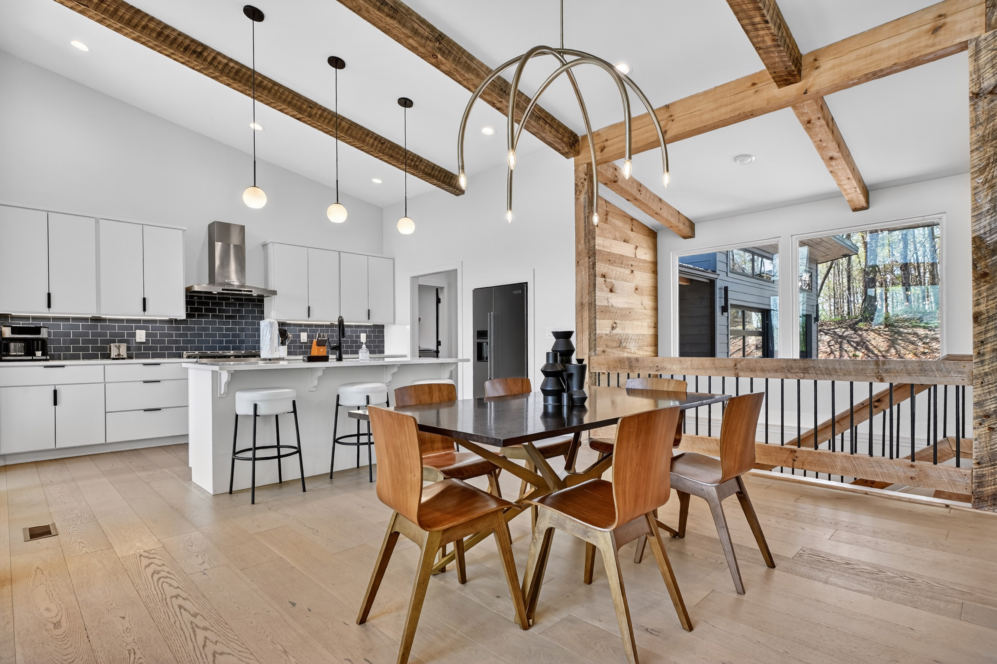 Positioned to capture sweeping year-round mountain views and rolling pasture, 315 Blue Berry Ridge is a striking contemporary chalet that seamlessly blends modern design with the natural beauty of North Georgia. Walls of glass and expansive sliding doors frame the landscape, filling the home with light and opening to a sprawling outdoor living deck anchored by a stone fireplace-designed for effortless indoor-outdoor entertaining. The main level offers a refined open-concept layout with a spacious living room, dining area, and a gourmet kitchen outfitted with stainless steel appliances, custom cabinetry, and a generous pantry. A large laundry and mud room provides functional ease with direct access to the detached, finished two-car garage. The primary suite on this level is a private retreat, complete with a spa-inspired en-suite featuring dual vanities, a walk-in tile shower, and a soaking tub. The terrace level is built for gathering and relaxation, offering a substantial den, game area, and full wet bar, along with two additional luxury bedroom suites for guests. Step outside to the walk-out patio where a hot tub and outdoor game area invite you to unwind beneath the mountain skyline. Offered fully furnished, this property is a proven high-performing short-term rental and an exceptional opportunity as a full-time residence, second home, or investment. Ideally located just minutes from Downtown Blue Ridge, Lake Blue Ridge, and endless hiking and biking trails, this is elevated mountain living at its finest.