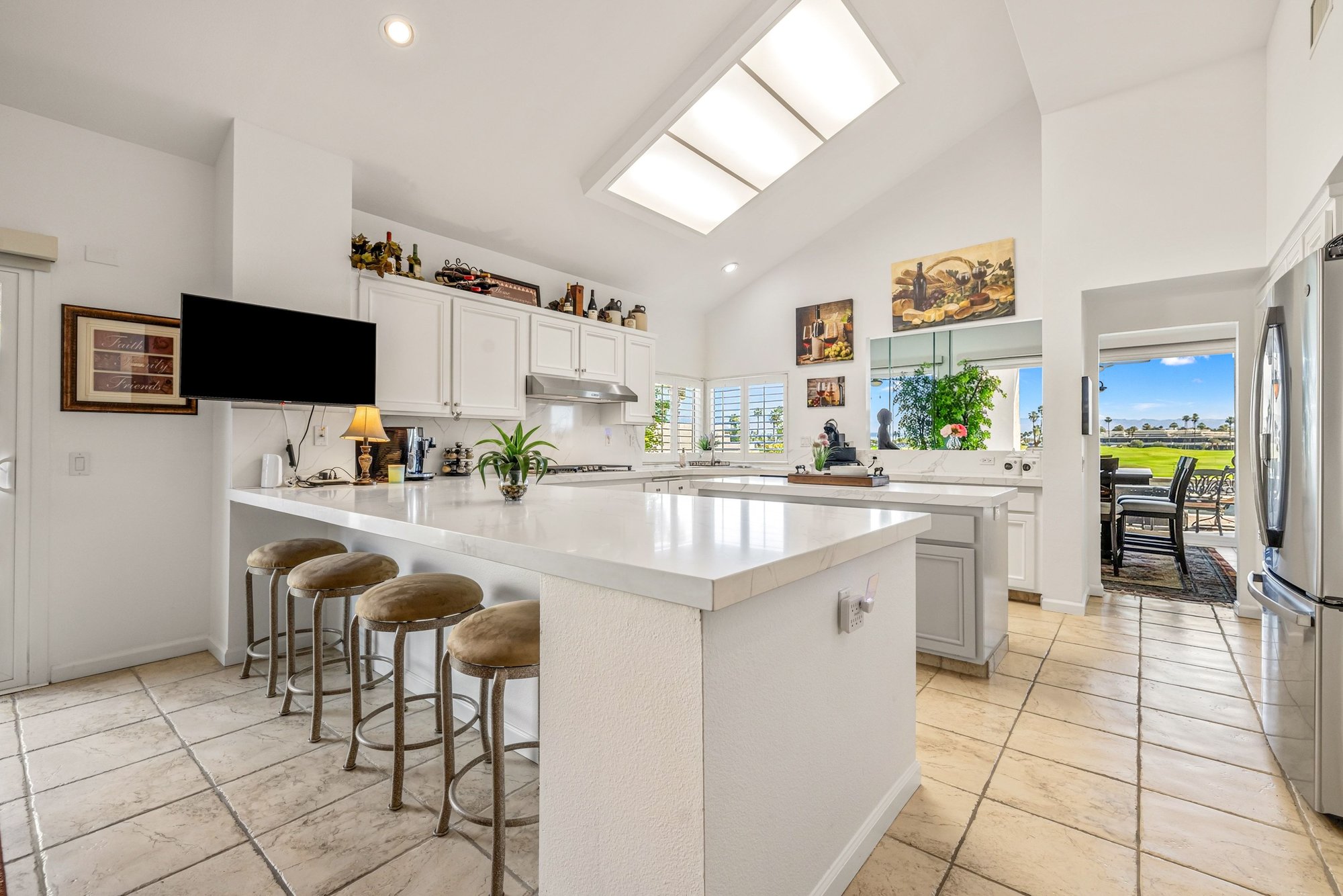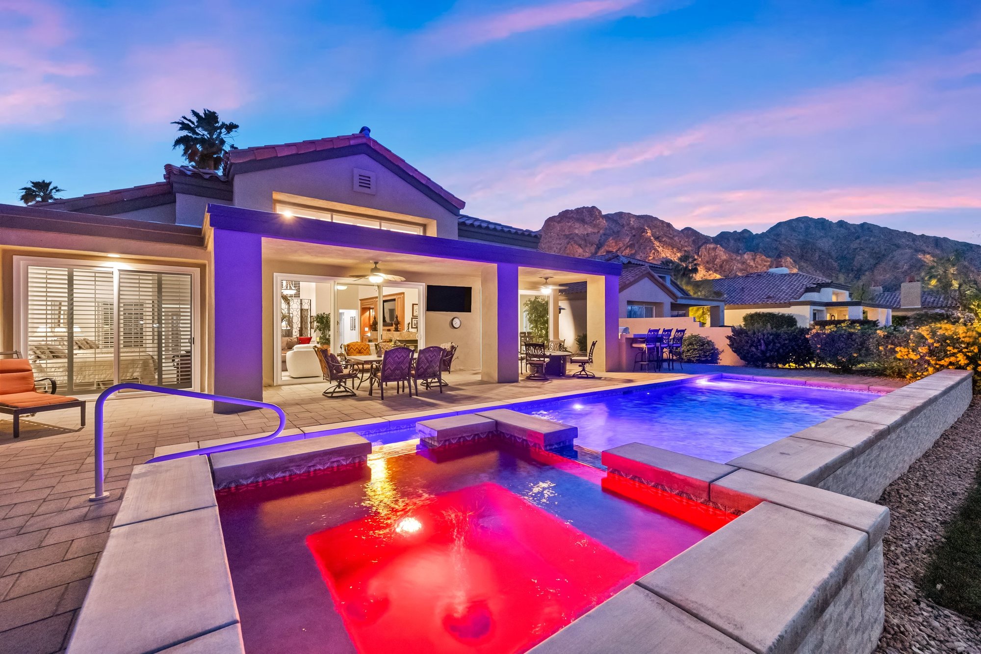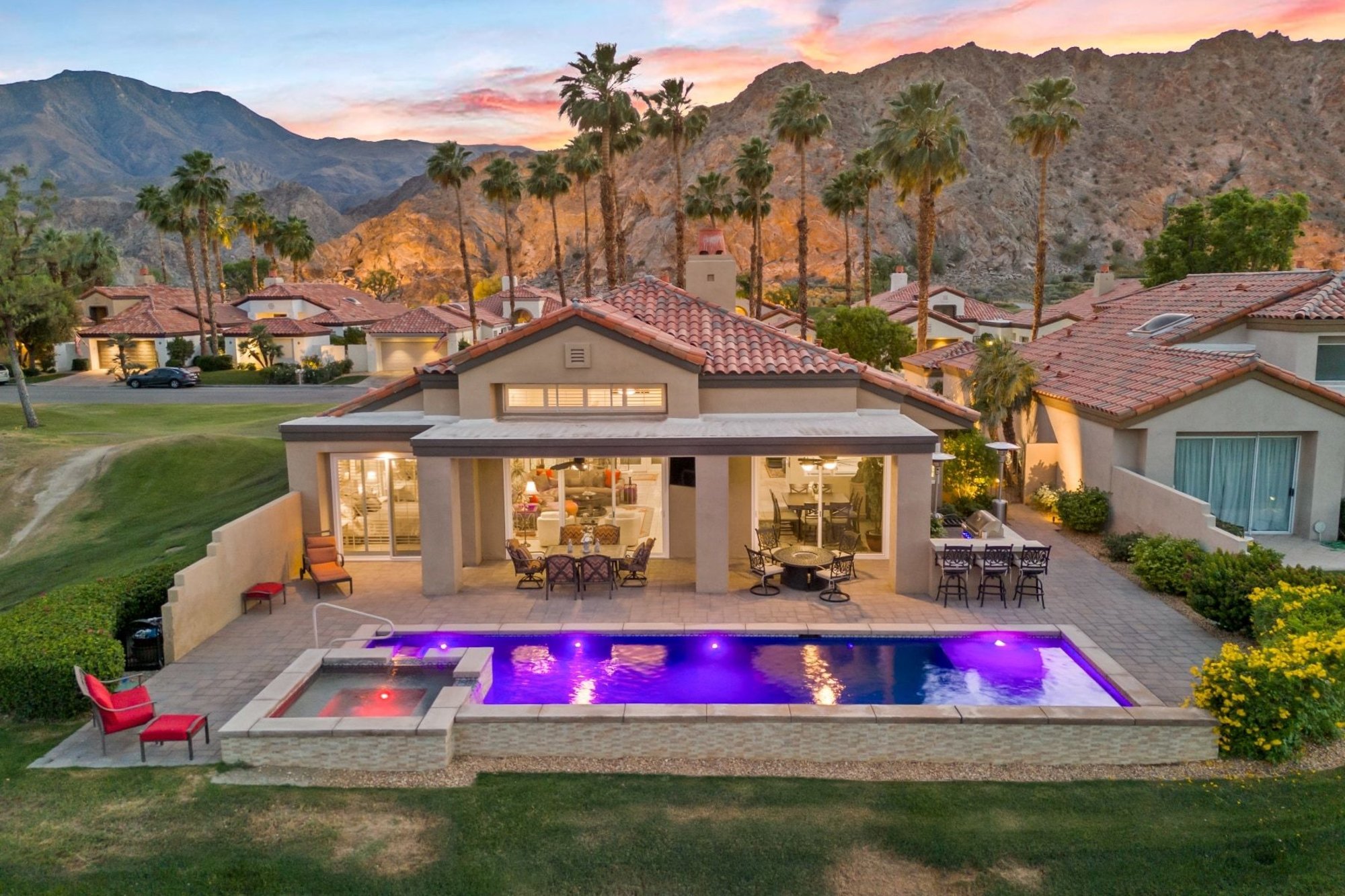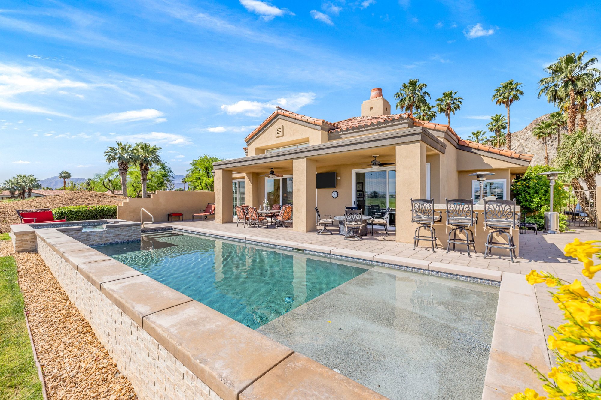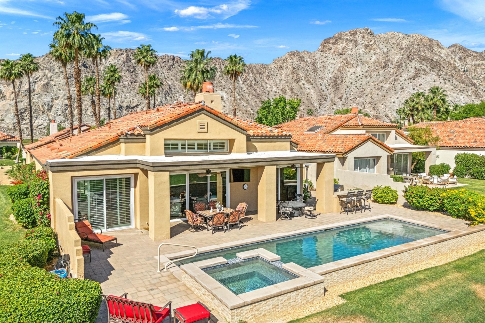 Play - Relax - Repeat! For the true golf enthusiast - this address puts you at the center of it all. Ideally positioned behind the Nicklaus Private and Arnold Palmer gates, this premier end-unit sits just steps from the private practice range, placing you in the heart of PGA West - The Western Home of Golf in America. A short cart ride connects you to both private and resort clubhouses, offering six championship courses and a storied history of PGA Tour, Q-School, The Amex Championship, and Skins Game. Wide-open east and northeast views stretch across the practice range toward the Members' clubhouse and Chocolate Mountains beyond, while the majestic Santa Rosa Mountains frame the west and southwest views. Morning sunrises, peaceful desert skies, and the occasional bighorn sheep create a setting uniquely South La Quinta. Designed as the ultimate year-round residence or desert golf retreat, this Highlands Plan 3 offers 4 ensuite bedrooms, 5 baths, and 2,986 SF, including a detached casita off a private entry courtyard - ideal for hosting your own foursome or multiple couples. A remodeled kitchen and new sliders enhance seamless indoor-outdoor living. The rear yard is anchored by a large newer pool and spa, with expansive paver decking that wraps the home for a clean, finished look. Take in sweeping practice range views or grab a few clubs and walk down to the tee to sharpen your game. Additional highlights include a 2-car plus golf cart garage and a quiet side yard retreat just off the family room - perfect for relaxing between rounds or enjoying a pre-dinner beverage. PGA West is surrounded by many of the desert's premier private clubs and lifestyle amenities, including the Desert International Horse Park, Eldorado Polo Club, and the BNP Paribas Open at the Indian Wells Tennis Garden. Outdoor pursuits abound with hiking, pickleball, and world-class seasonal events. Membership at The Club at PGA West is separate, and offers access to golf, tennis, pickleball, fitness, dining, and a vibrant social calendar.
