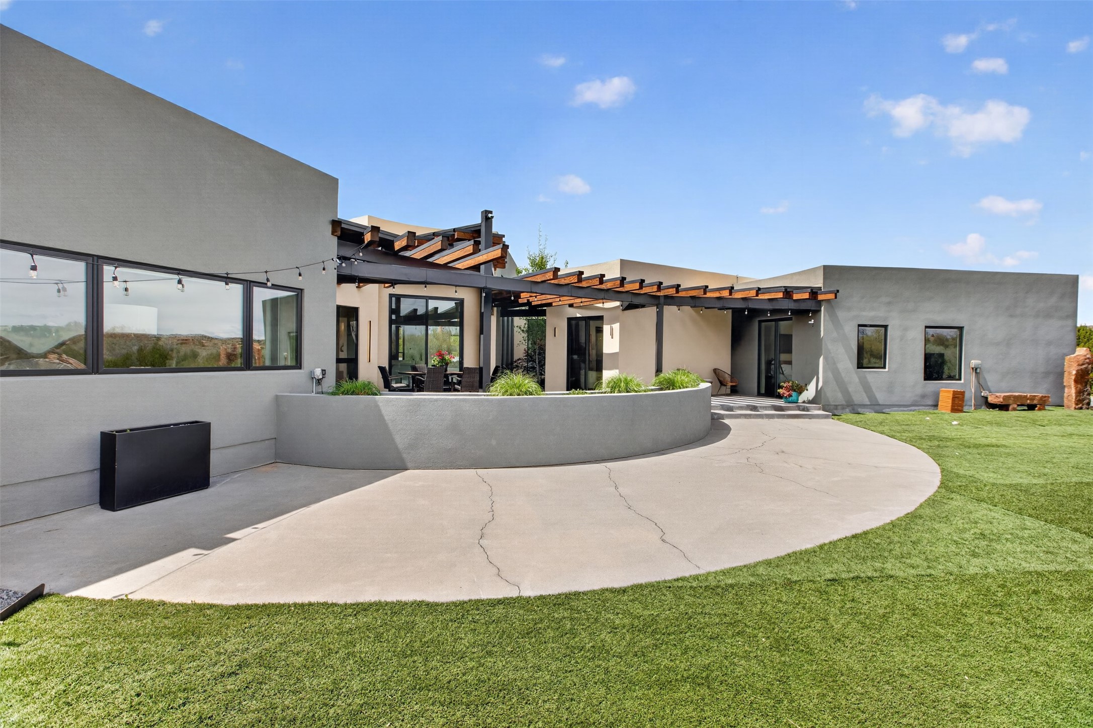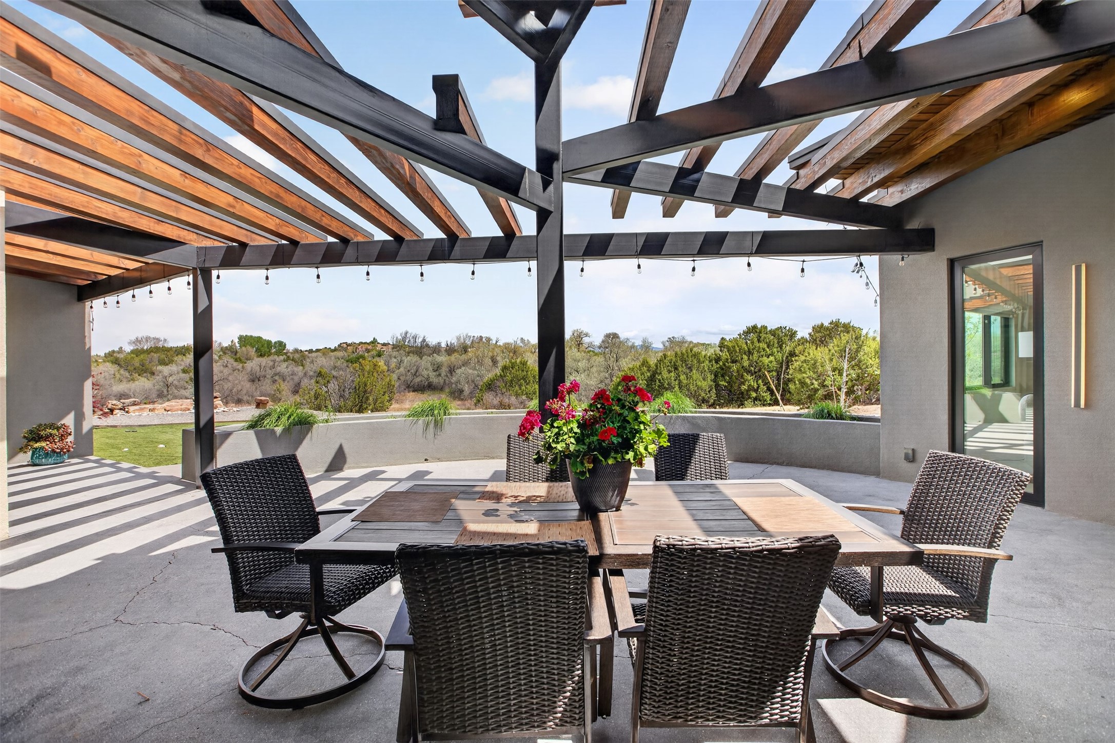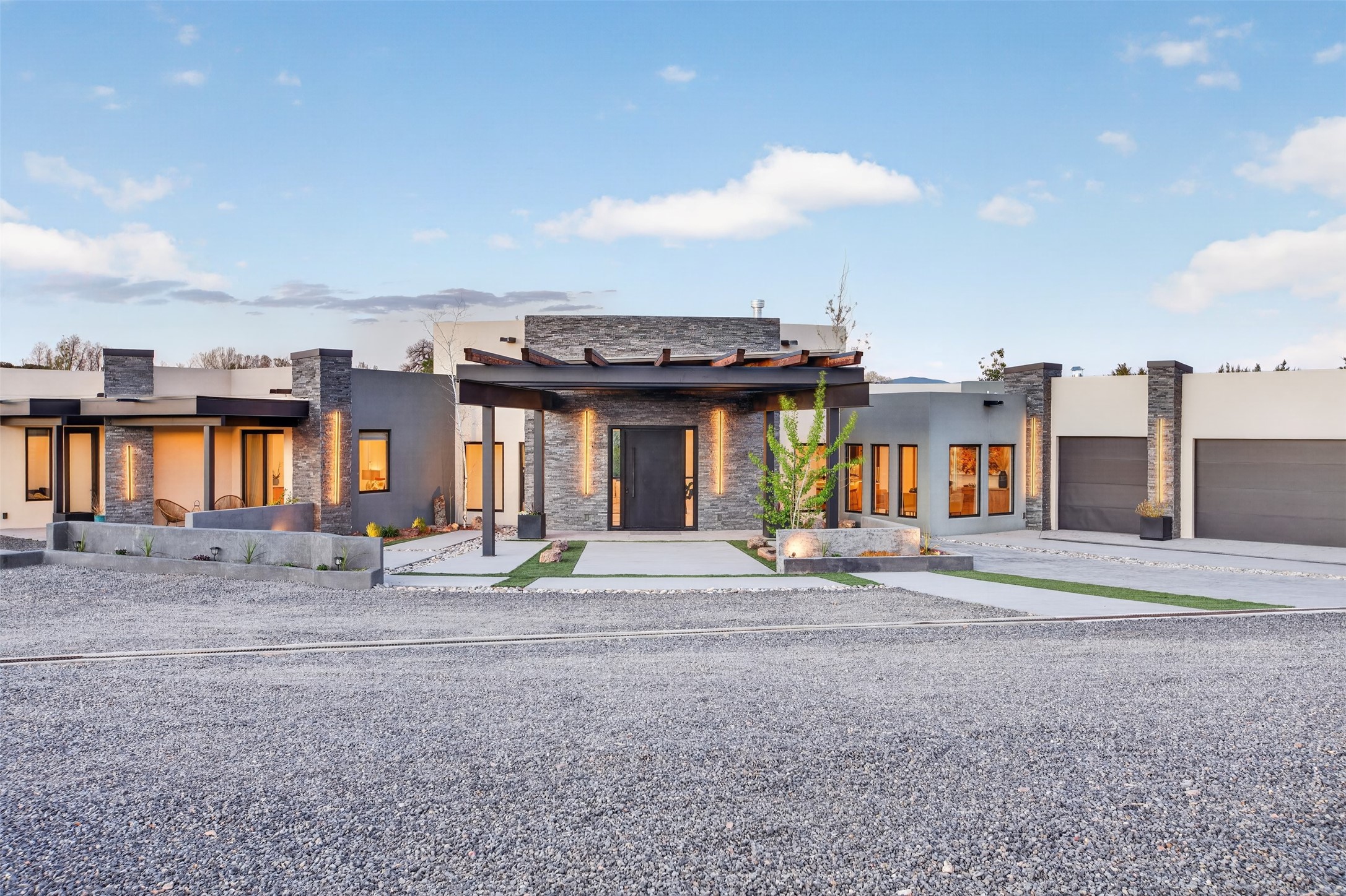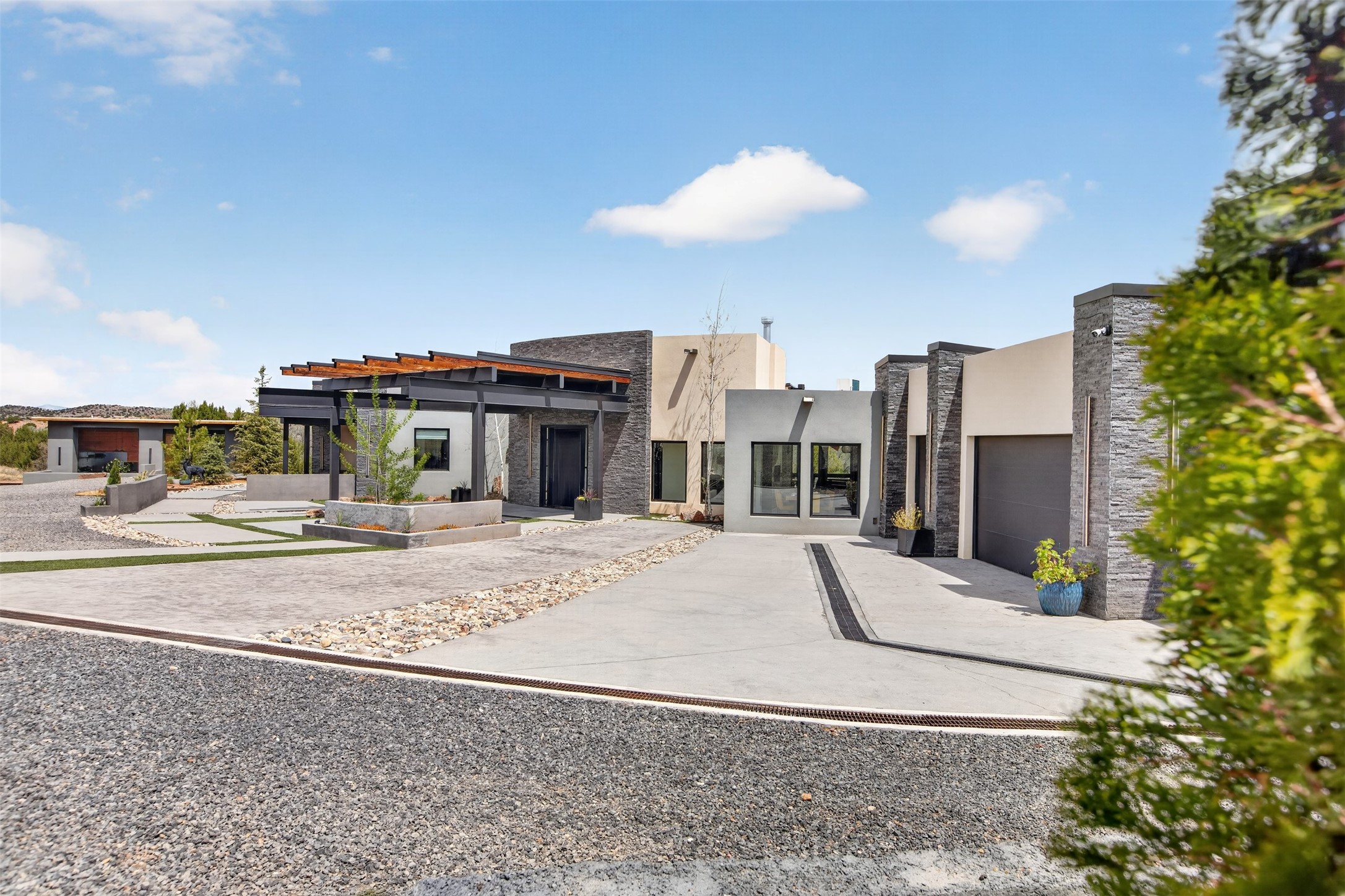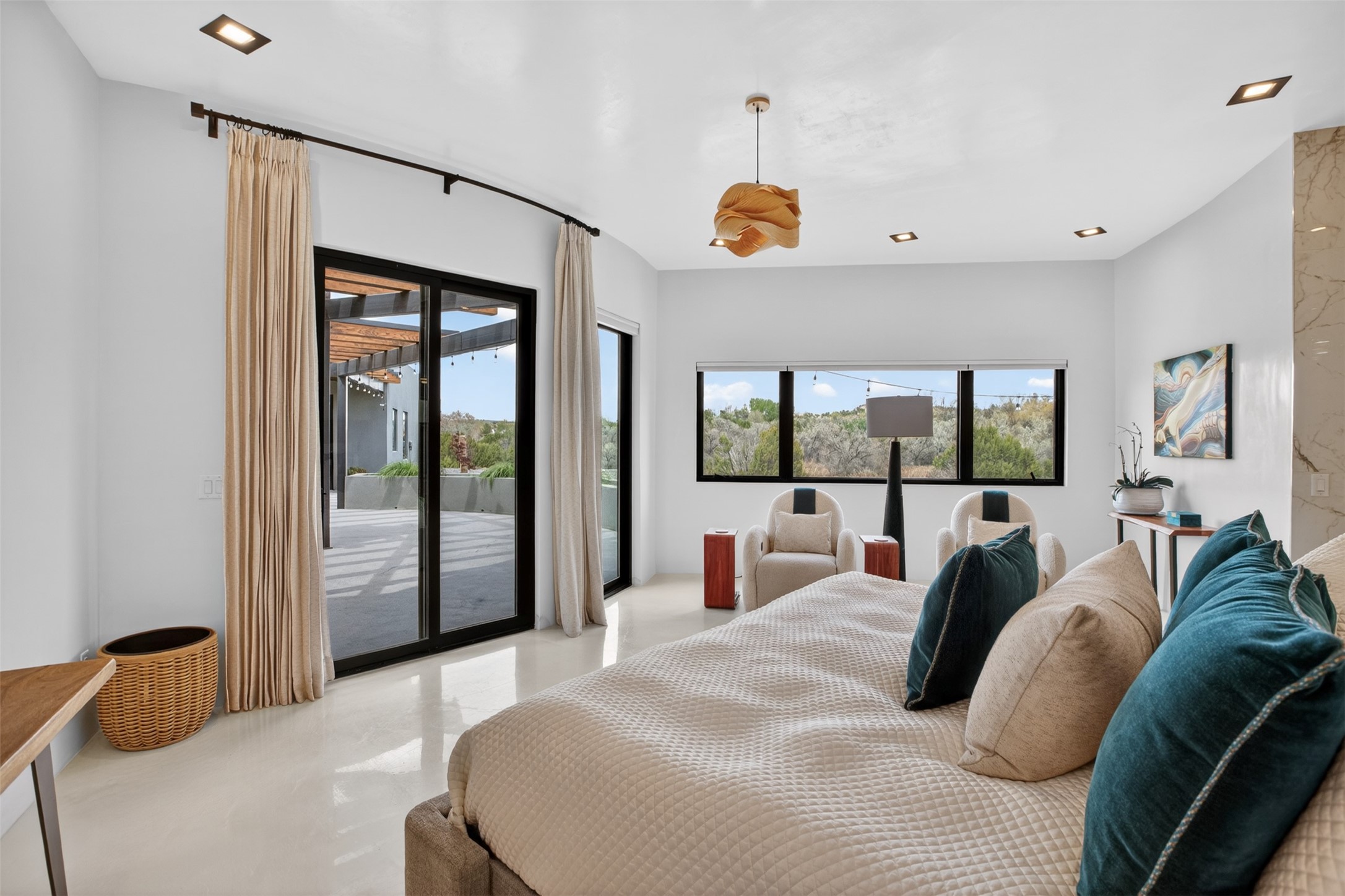 Experience a striking contemporary retreat where refined design meets the serenity of nature. Built between 2023–2024 and offering approximately 4,300 sq ft (est), this thoughtfully crafted frame home is nestled within the gated La Lagunitas community, managed by Aldea. Positioned along the northwest boundary, the property backs to wetlands and the Leonora Curtin area, creating a private sanctuary with seasonal greenery, abundant wildlife, and peaceful open views. Designed for both luxury and comfort, every room features its own private portal, seamlessly blending indoor and outdoor living. The interior showcases high-end finishes, including diamond and Venetian plaster walls, durable epoxy flooring, and radiant in-floor heating powered by PEX tubing. Each bedroom is equipped with its own mini-split system for personalized climate control. The chef’s kitchen is appointed with maple cabinetry and stone countertops installed by Finishing Touch. Outdoor living is elevated by a permitted, detached gazebo spanning approximately 1,300 sq ft (not included in living space), complete with a concrete interior, half bathroom, future pantry area, and a TPO roof with remaining warranty. The grounds are equally impressive, featuring a greenhouse, grapevines, and mature fruit trees including peach, apple, and apricot. Additional highlights include five bedrooms, four bathrooms, an oversized garage with an extra bay, and approximately two years of occupancy. Residents enjoy exclusive access to scenic ponds, docks, boating, and fishing, along with proximity to the Lenore Curtin Preserve and convenient access to I-25—offering an effortless connection to Albuquerque. This is a rare opportunity to own a modern luxury retreat immersed in nature, designed for elevated living and unforgettable entertaining.