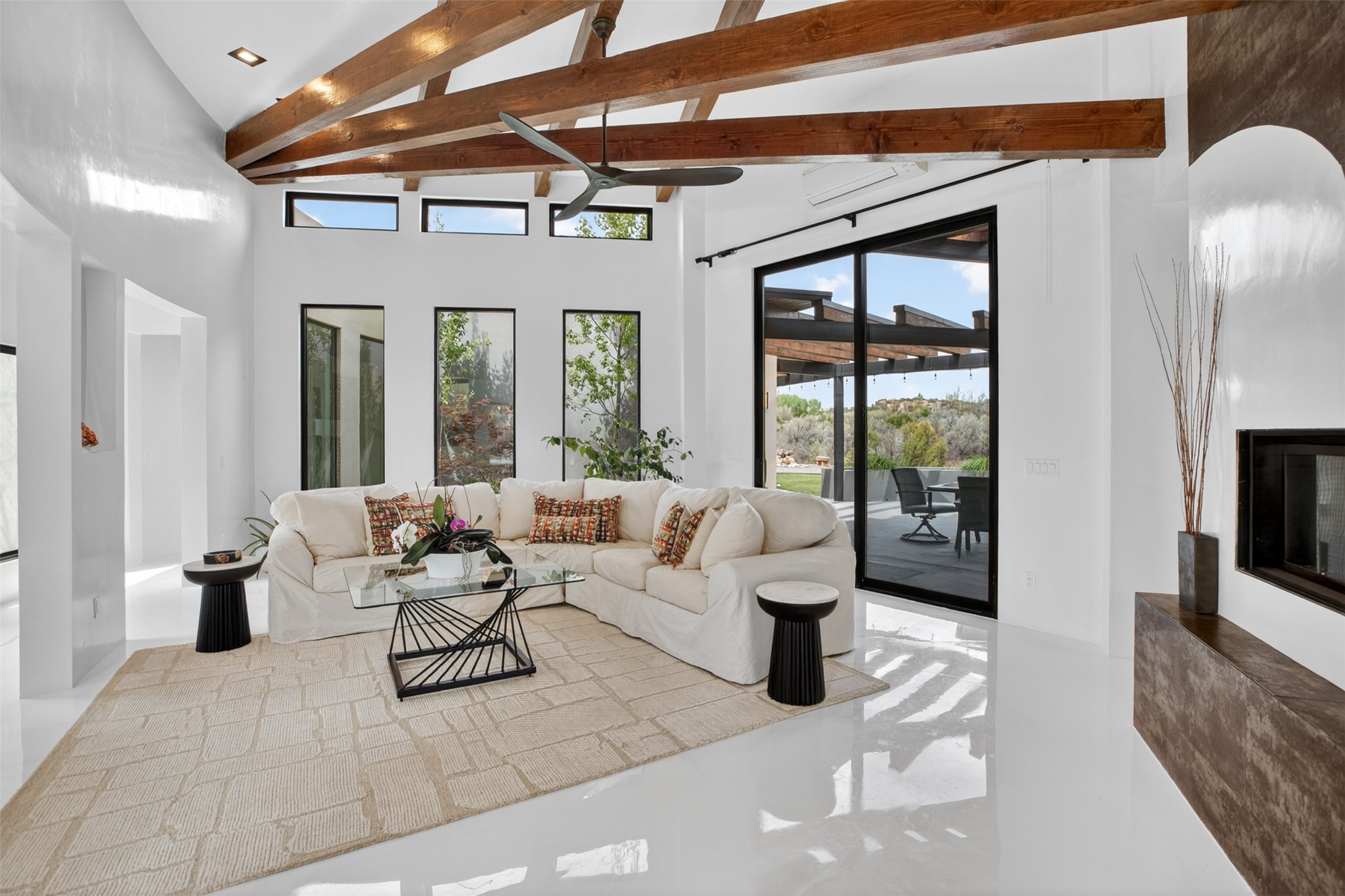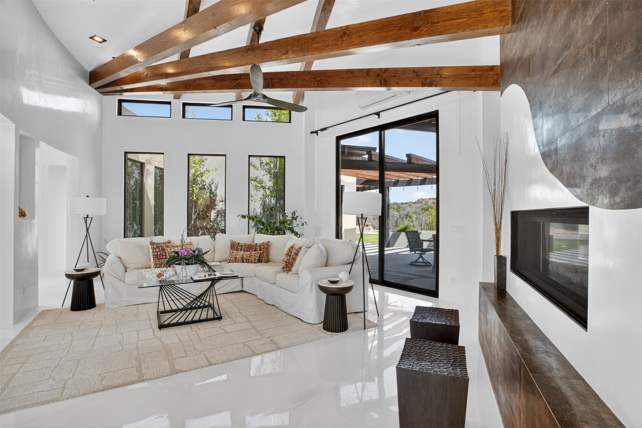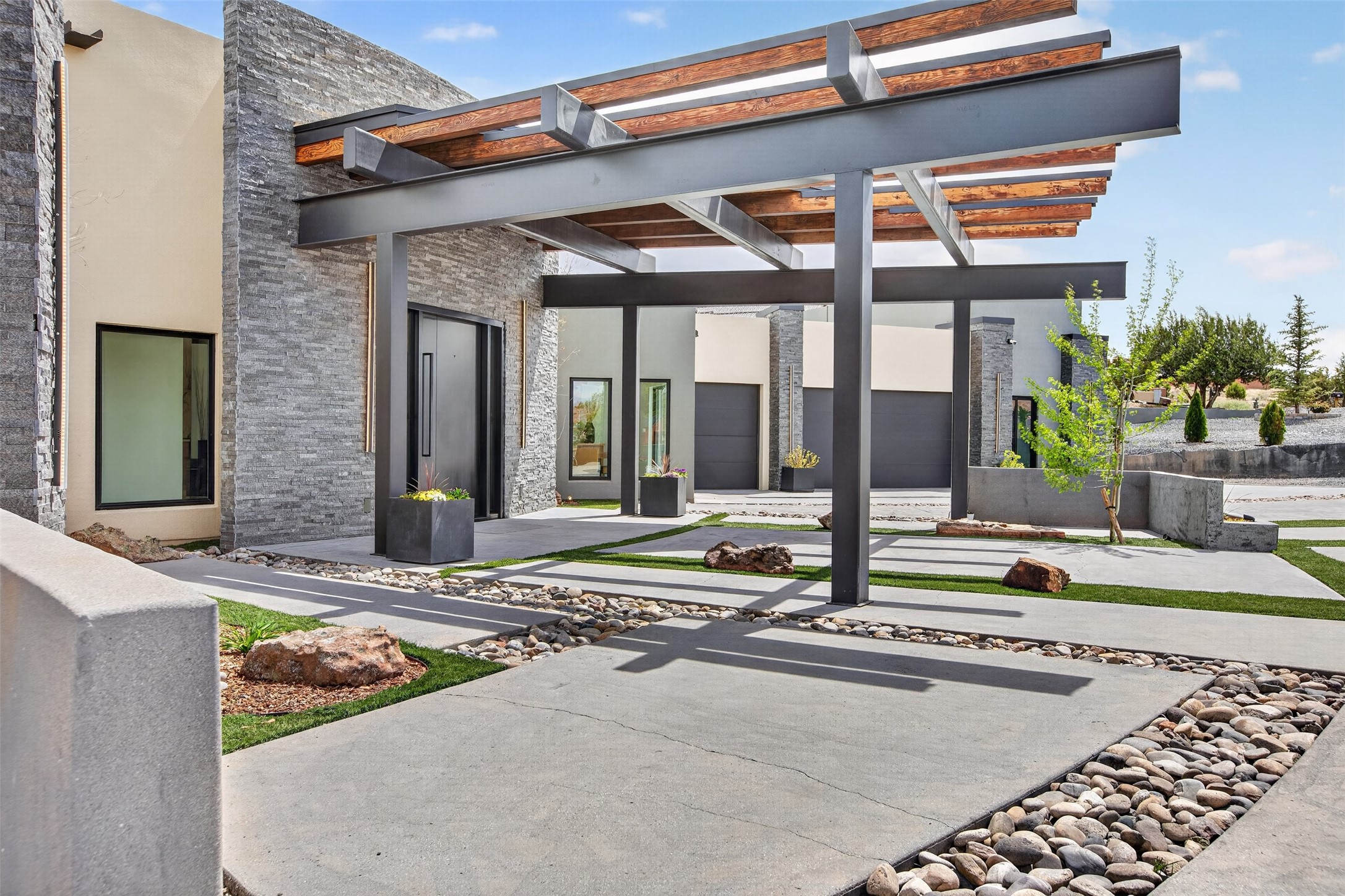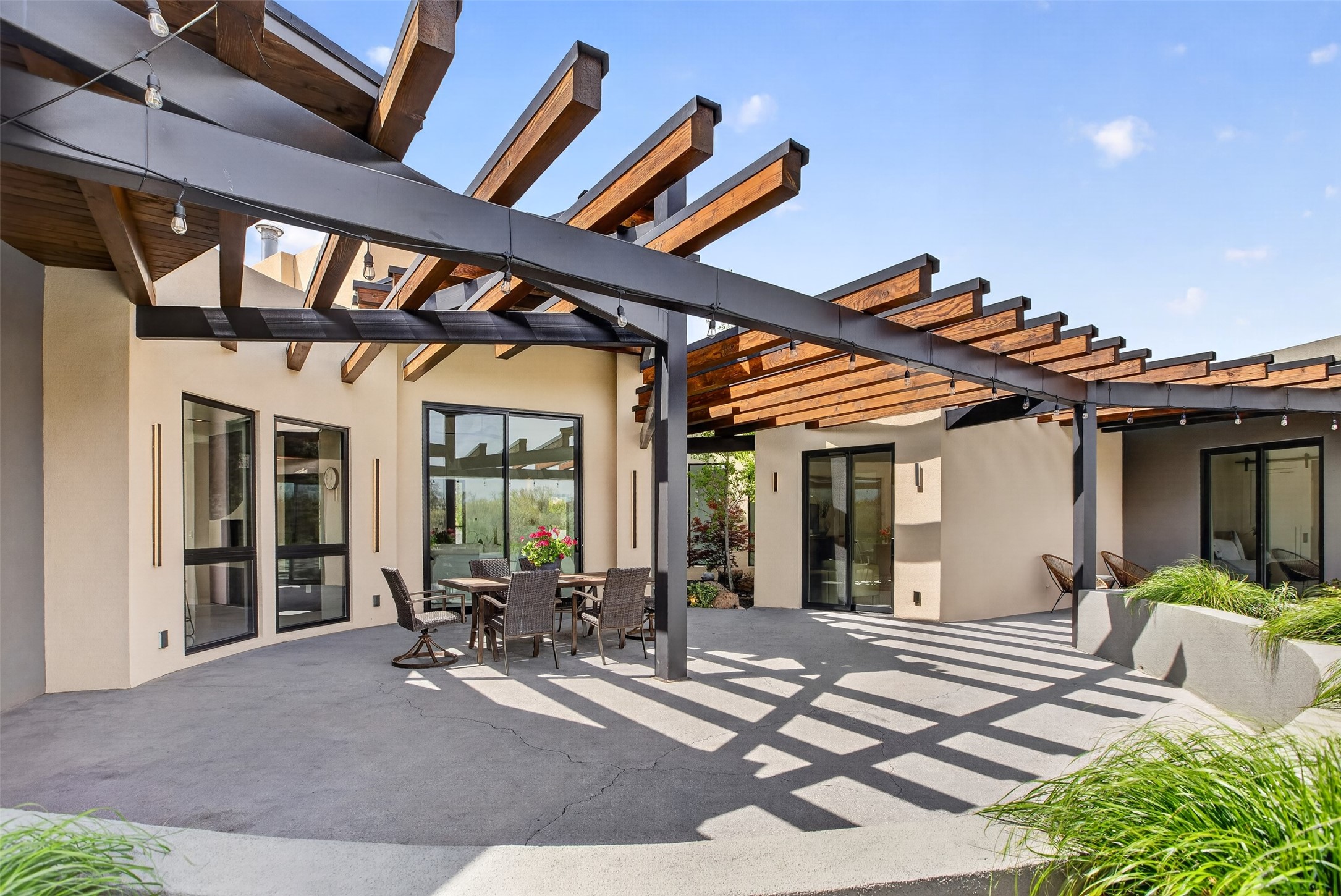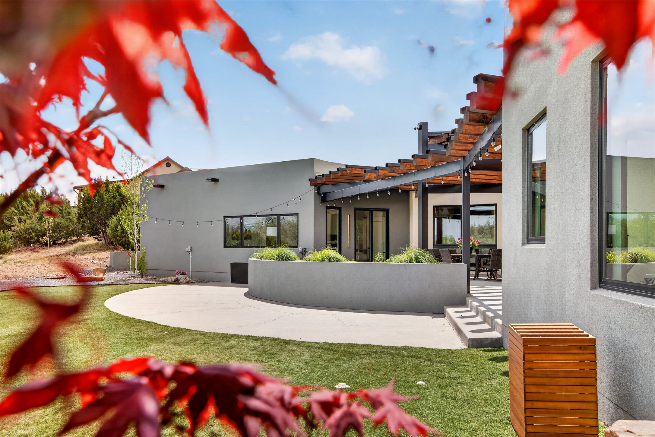 Experience a striking contemporary retreat where refined design meets the serenity of nature. Built between 2023–2024 and offering approximately 4,300 sq ft (est), this thoughtfully crafted frame home is nestled within the gated La Lagunitas community, managed by Aldea. Positioned along the northwest boundary, the property backs to wetlands and the Leonora Curtin area, creating a private sanctuary with seasonal greenery, abundant wildlife, and peaceful open views. Designed for both luxury and comfort, every room features its own private portal, seamlessly blending indoor and outdoor living. The interior showcases high-end finishes, including diamond and Venetian plaster walls, durable epoxy flooring, and radiant in-floor heating powered by PEX tubing. Each bedroom is equipped with its own mini-split system for personalized climate control. The chef’s kitchen is appointed with maple cabinetry and stone countertops installed by Finishing Touch. Outdoor living is elevated by a permitted, detached gazebo spanning approximately 1,300 sq ft (not included in living space), complete with a concrete interior, half bathroom, future pantry area, and a TPO roof with remaining warranty. The grounds are equally impressive, featuring a greenhouse, grapevines, and mature fruit trees including peach, apple, and apricot. Additional highlights include five bedrooms, four bathrooms, an oversized garage with an extra bay, and approximately two years of occupancy. Residents enjoy exclusive access to scenic ponds, docks, boating, and fishing, along with proximity to the Lenore Curtin Preserve and convenient access to I-25—offering an effortless connection to Albuquerque. This is a rare opportunity to own a modern luxury retreat immersed in nature, designed for elevated living and unforgettable entertaining.
