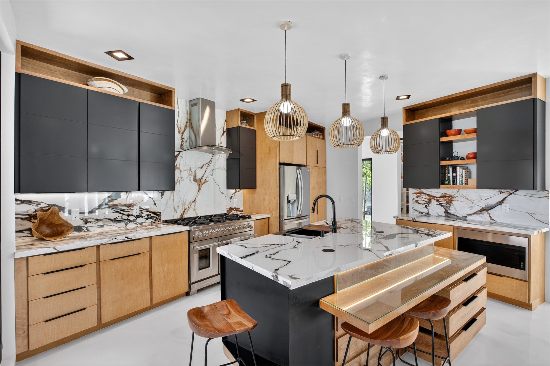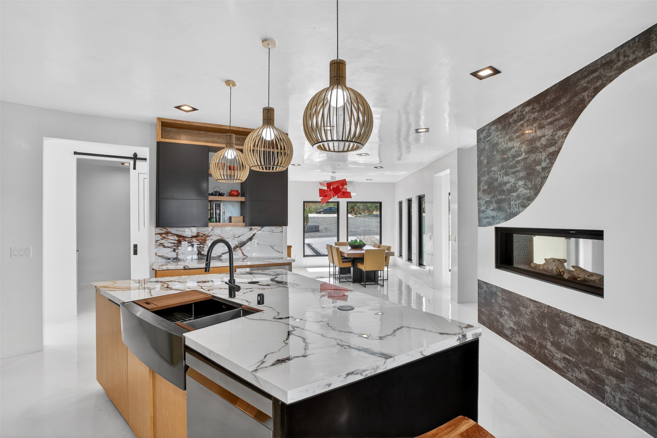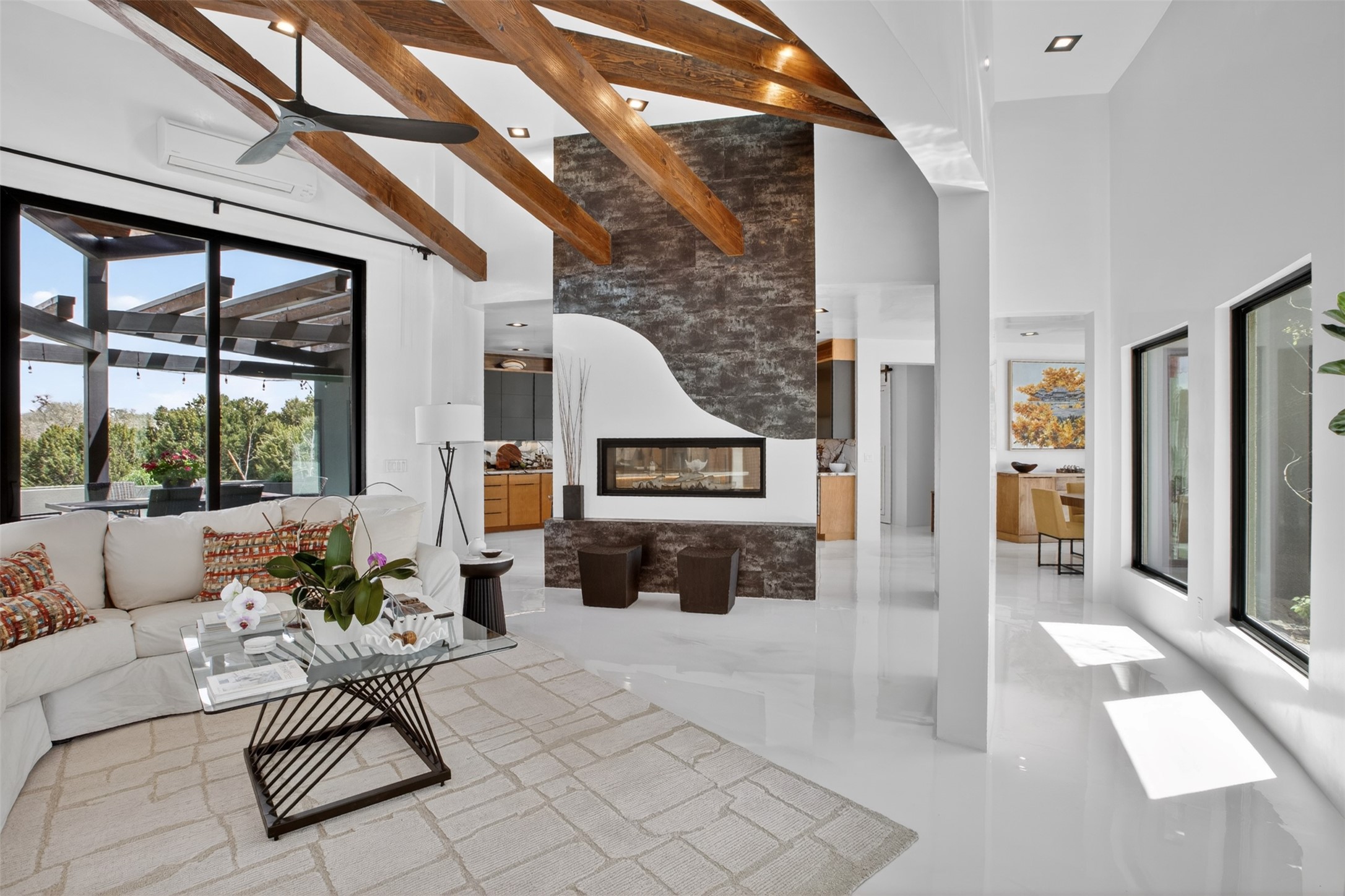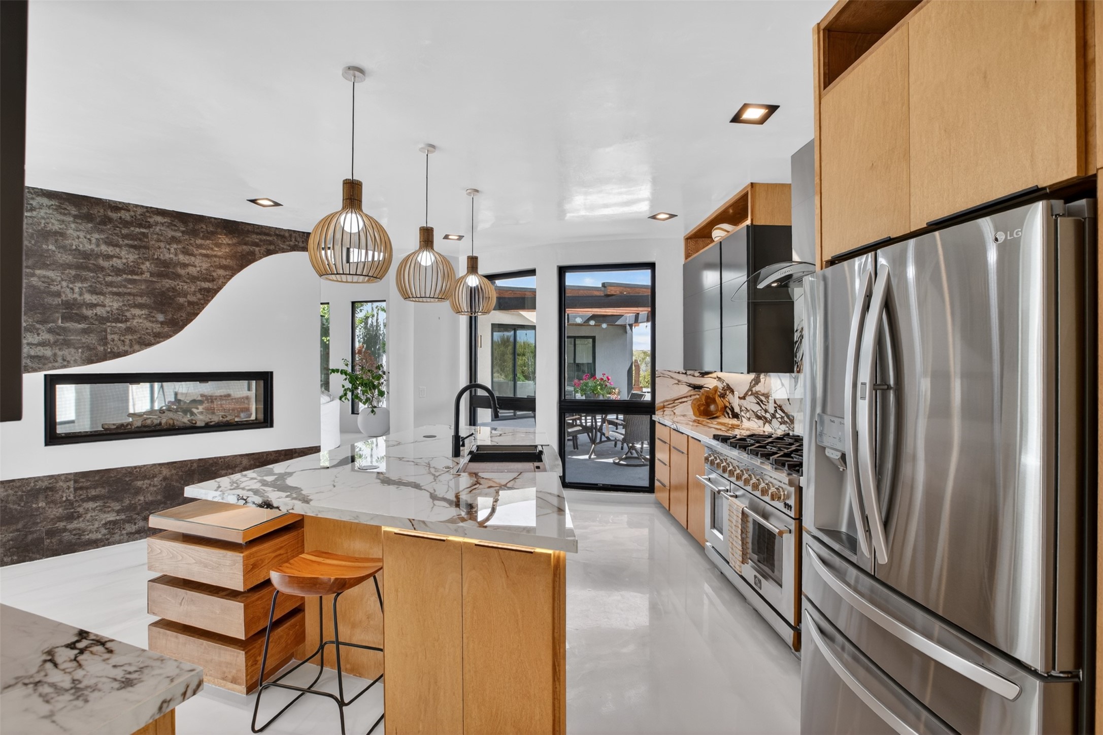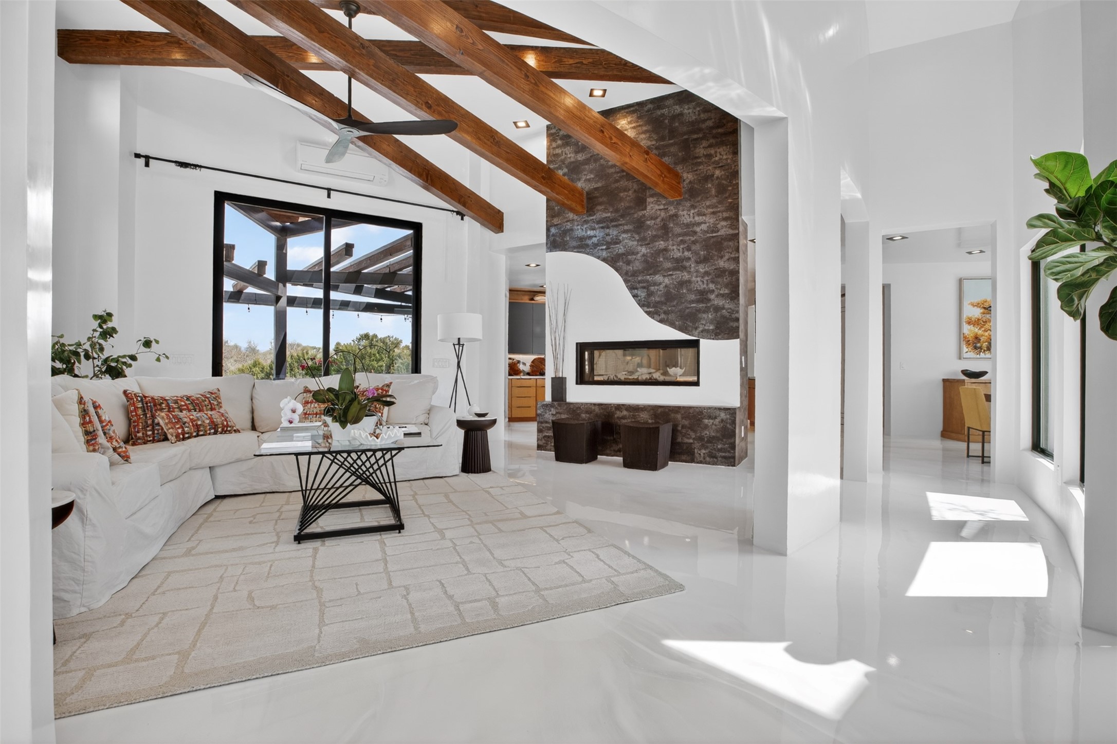 Experience a striking contemporary retreat where refined design meets the serenity of nature. Built between 2023–2024 and offering approximately 4,300 sq ft (est), this thoughtfully crafted frame home is nestled within the gated La Lagunitas community, managed by Aldea. Positioned along the northwest boundary, the property backs to wetlands and the Leonora Curtin area, creating a private sanctuary with seasonal greenery, abundant wildlife, and peaceful open views. Designed for both luxury and comfort, every room features its own private portal, seamlessly blending indoor and outdoor living. The interior showcases high-end finishes, including diamond and Venetian plaster walls, durable epoxy flooring, and radiant in-floor heating powered by PEX tubing. Each bedroom is equipped with its own mini-split system for personalized climate control. The chef’s kitchen is appointed with maple cabinetry and stone countertops installed by Finishing Touch. Outdoor living is elevated by a permitted, detached gazebo spanning approximately 1,300 sq ft (not included in living space), complete with a concrete interior, half bathroom, future pantry area, and a TPO roof with remaining warranty. The grounds are equally impressive, featuring a greenhouse, grapevines, and mature fruit trees including peach, apple, and apricot. Additional highlights include five bedrooms, four bathrooms, an oversized garage with an extra bay, and approximately two years of occupancy. Residents enjoy exclusive access to scenic ponds, docks, boating, and fishing, along with proximity to the Lenore Curtin Preserve and convenient access to I-25—offering an effortless connection to Albuquerque. This is a rare opportunity to own a modern luxury retreat immersed in nature, designed for elevated living and unforgettable entertaining.