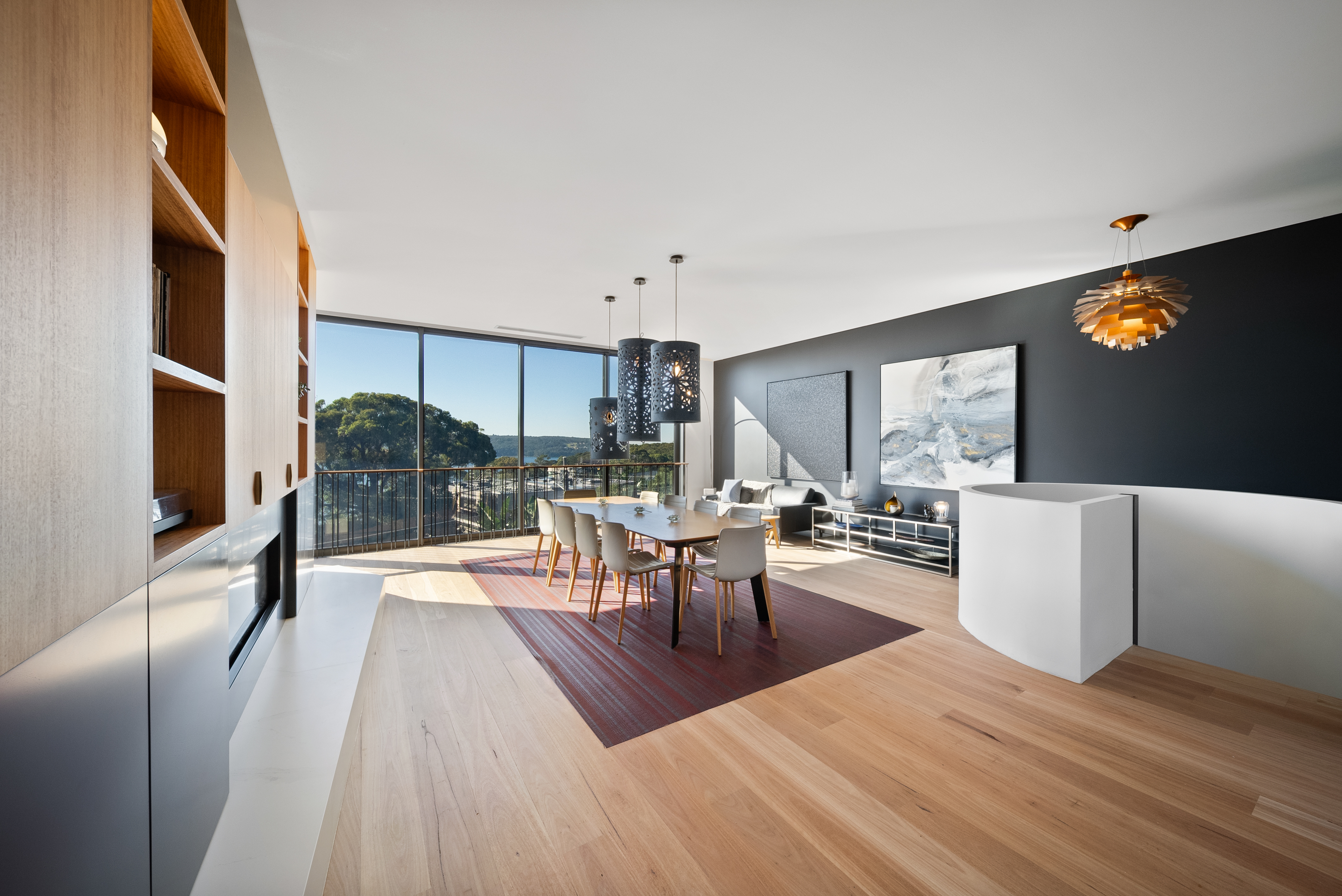 - Wide-format blackbutt timber flooring complemented by plush carpeting and bespoke finishes