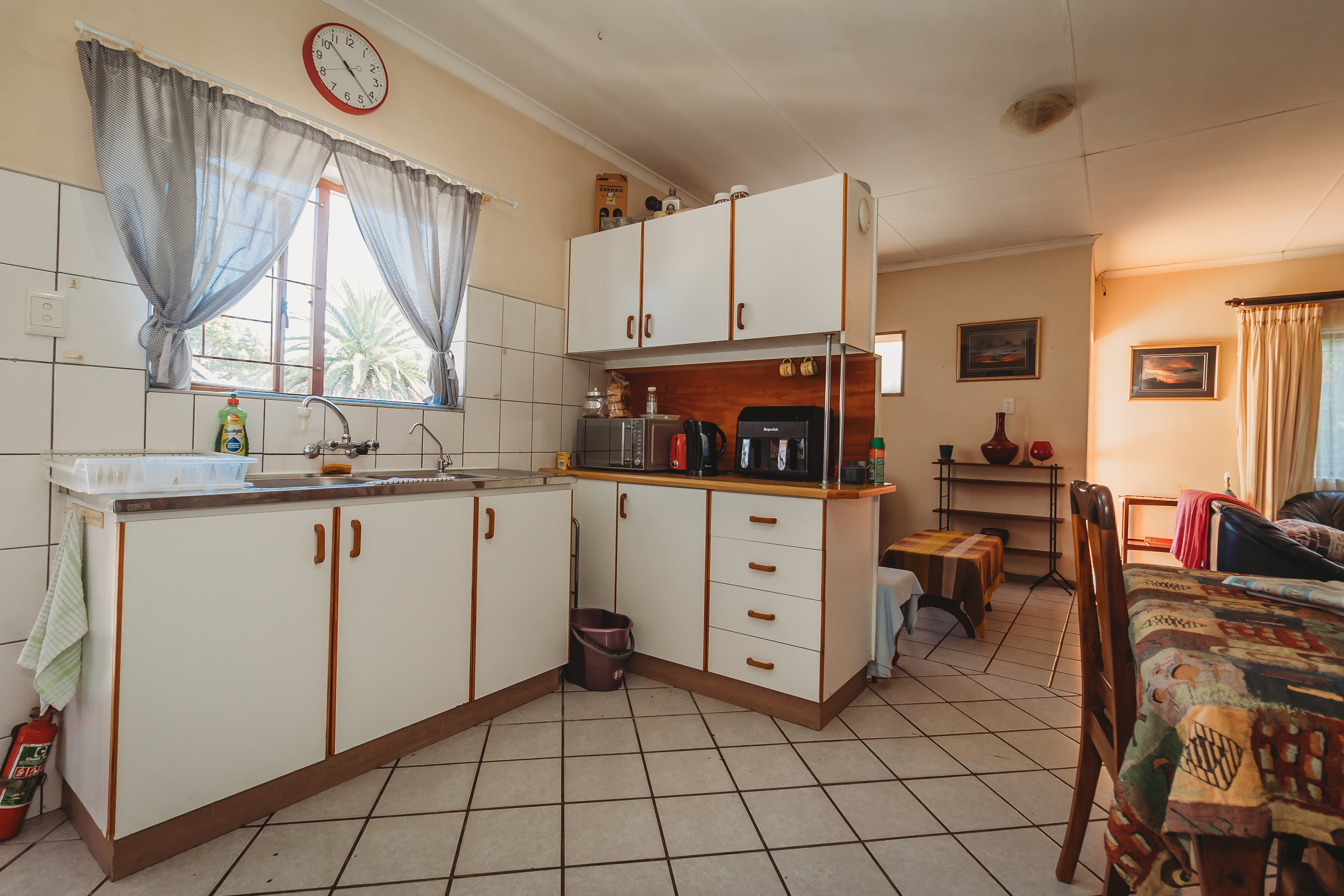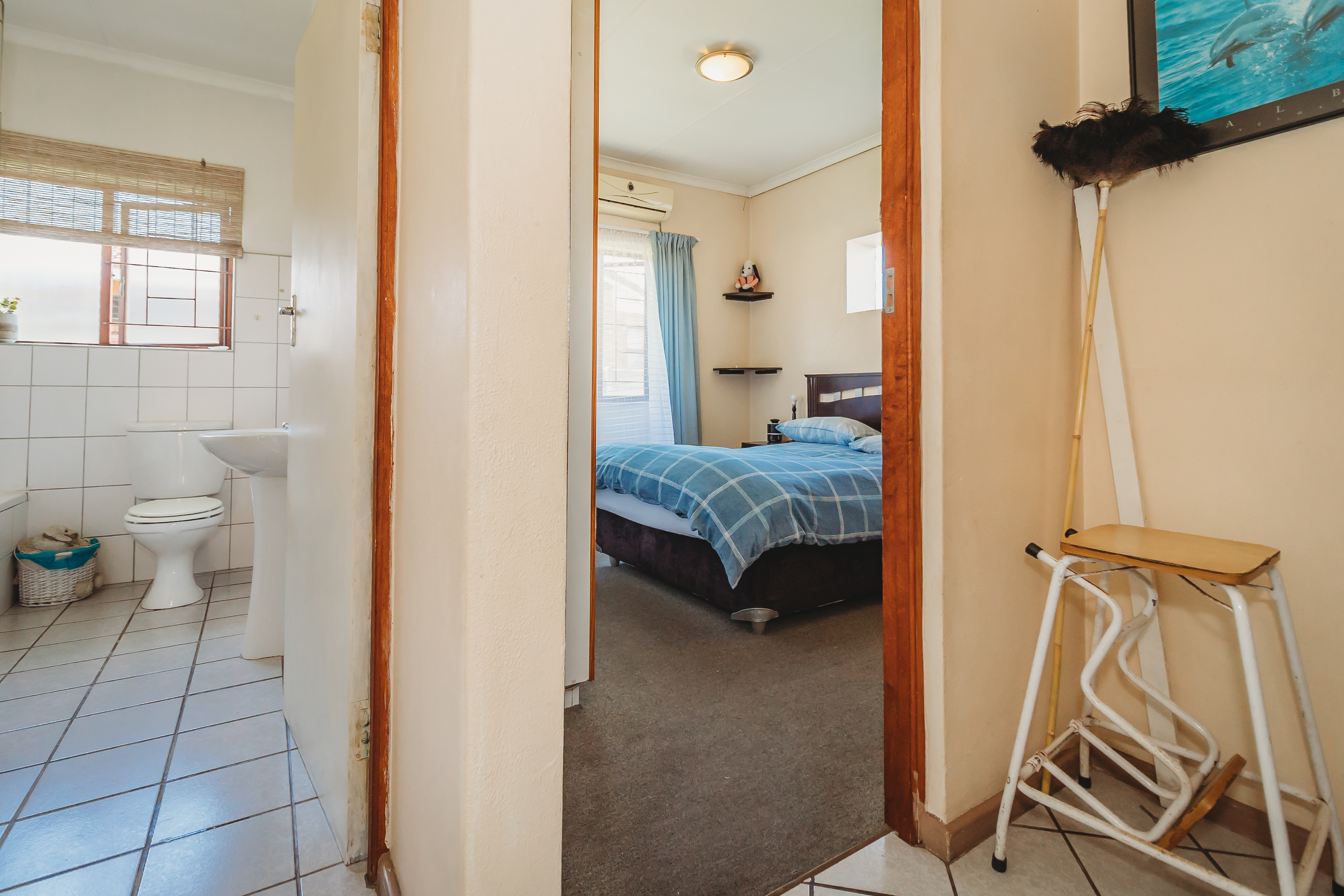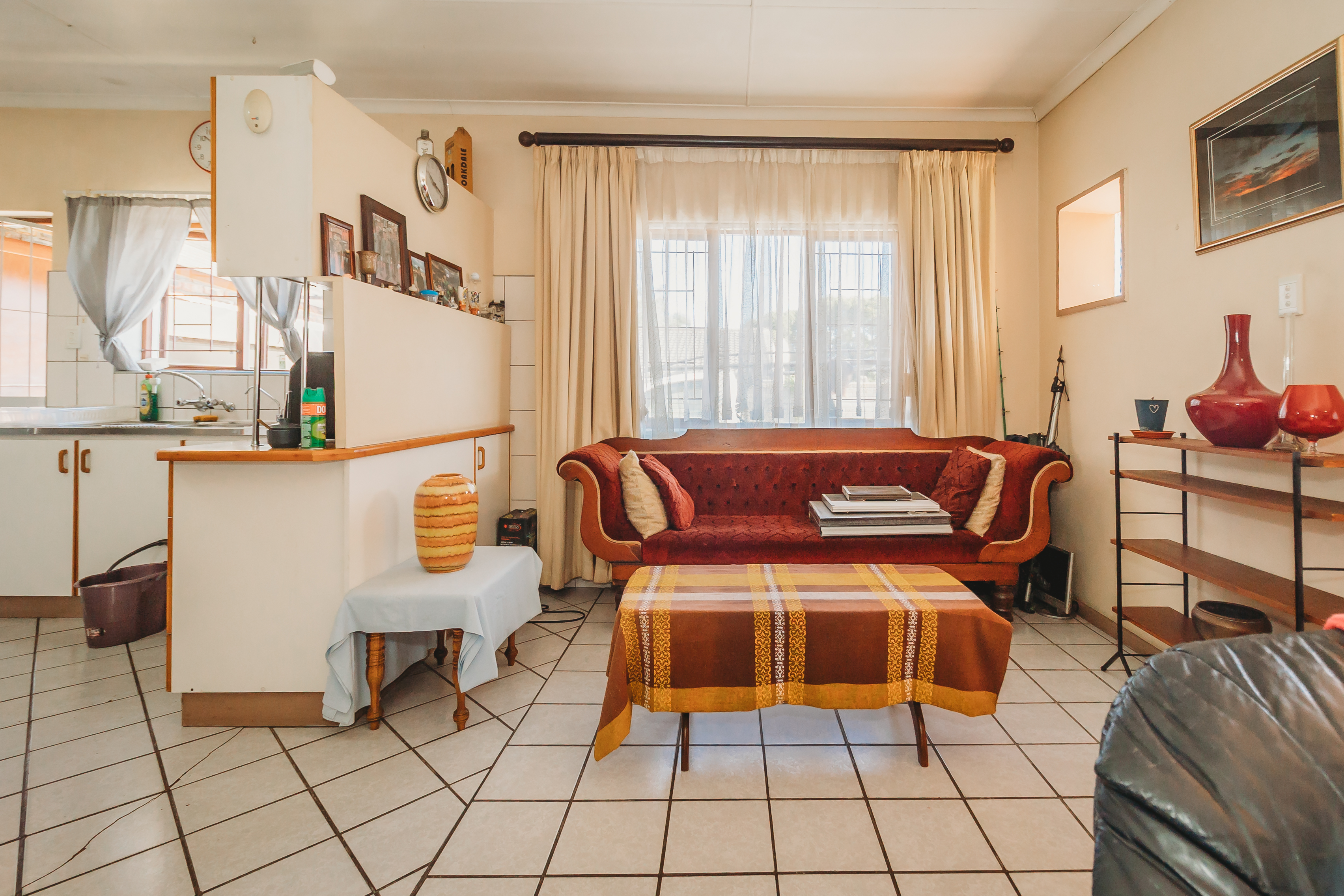 The primary home is thoughtfully designed for comfortable, everyday living. It offers three well-proportioned, carpeted bedrooms with built-in cabinetry, complemented by a full bathroom and a separate guest cloakroom. Light-filled, open-plan interiors create a natural flow between the lounge, dining area, and kitchen, forming a welcoming space for both relaxed family life and entertaining. A single automated garage with integrated laundry facilities provides direct practicality, while comprehensive security features—including controlled access, security gates, and burglar bars—ensure peace of mind.