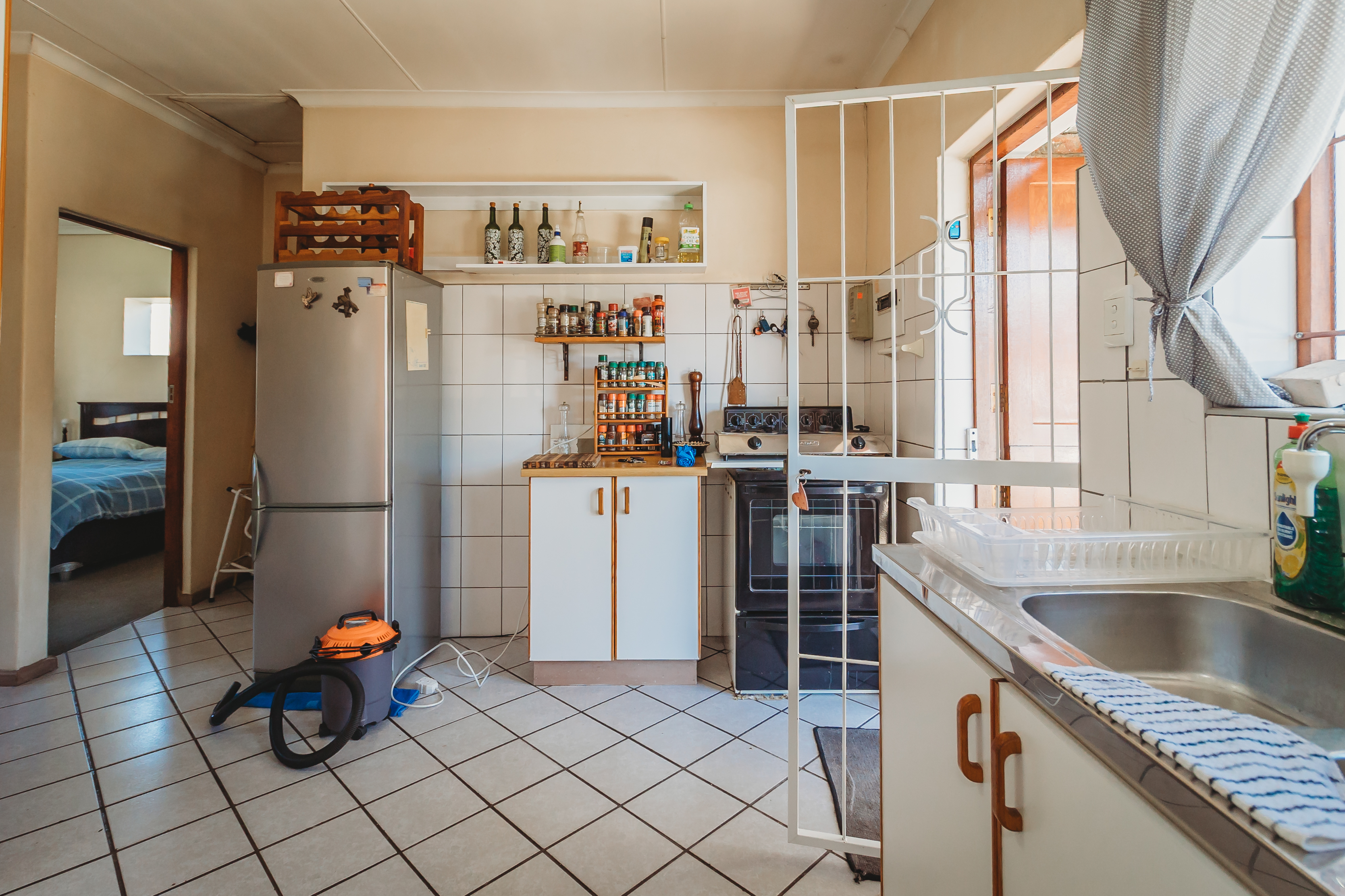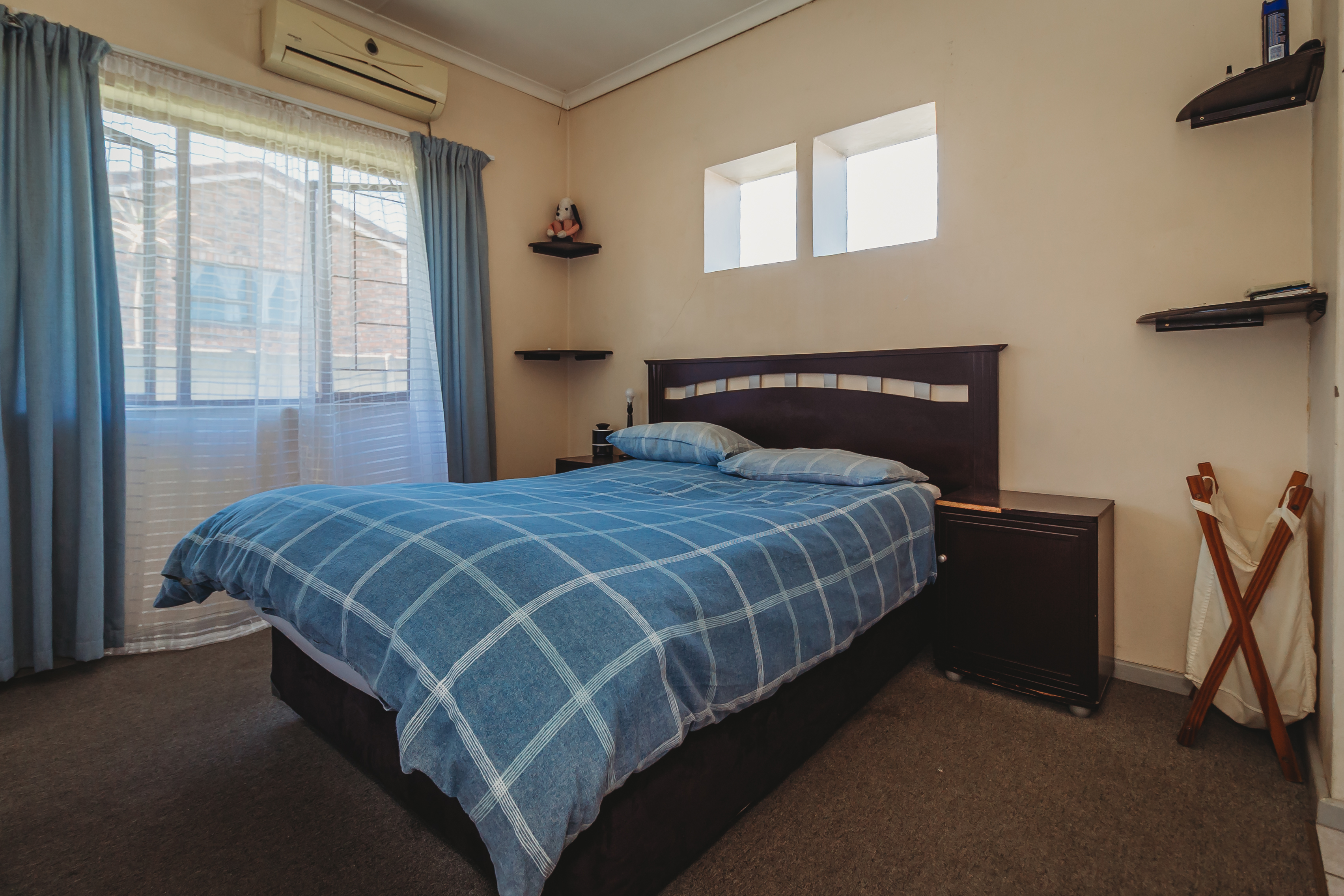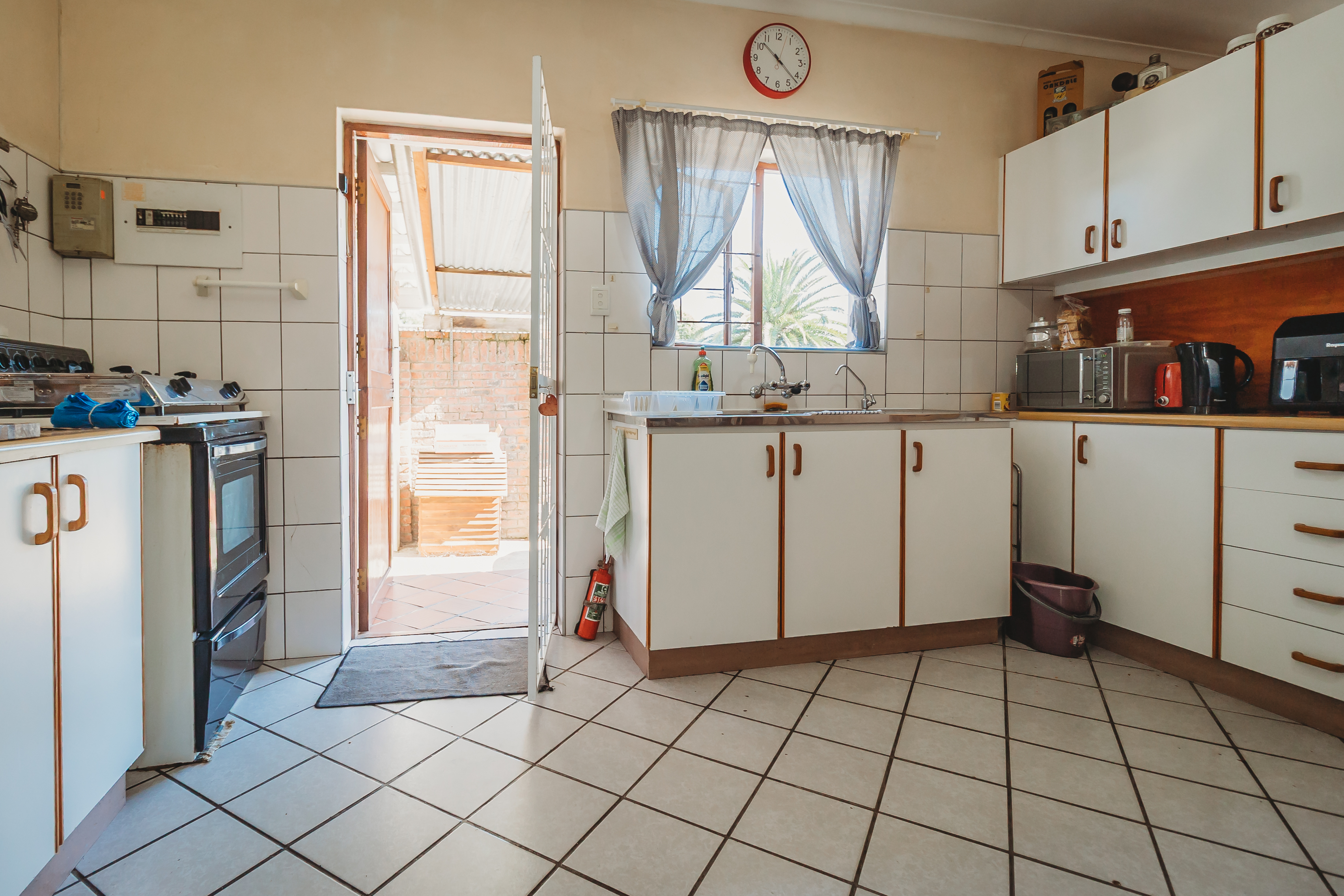 The primary home is thoughtfully designed for comfortable, everyday living. It offers three well-proportioned, carpeted bedrooms with built-in cabinetry, complemented by a full bathroom and a separate guest cloakroom. Light-filled, open-plan interiors create a natural flow between the lounge, dining area, and kitchen, forming a welcoming space for both relaxed family life and entertaining. A single automated garage with integrated laundry facilities provides direct practicality, while comprehensive security features—including controlled access, security gates, and burglar bars—ensure peace of mind.
