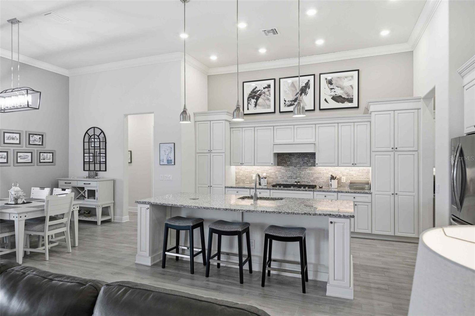Welcome to an extraordinary residence in Terra Vista's exclusive Roberts Ridge, where luxury, privacy, and sweeping golf course views define everyday living. This meticulously designed estate spans over 4,000 square feet, delivering a seamless blend of elegance and functionality. From the moment you arrive, the home's architectural presence stands out - enhanced by stacked stone accents and a decorative architectural concrete driveway that sets the tone for what lies beyond. Inside, soaring ceilings and expansive living spaces create an open, airy feel, anchored by a stunning chef's kitchen featuring quartz countertops, custom cabinetry, an oversized island, and a dedicated coffee bar/butler's pantry. A large walk-in pantry and additional custom cabinetry ensure exceptional storage, while thoughtful design touches elevate every corner. The main-level owner's suite offers a private retreat, while the upper level provides two spacious bedrooms, each with its own ensuite bath, ideal for guests seeking comfort and privacy. The fourth bedroom suite, also on the main level, offers dual sinks, a large walk in shower and large california closet. A formal dining room, spacious den and a dedicated office with a half bath make this home the perfect mix of effortless entertaning and ease for working from home. Step outisde to your personal esort style oasis. The expansive screened lanai features an outdoor kitchen and inground pool overlooking sweeping golf course views.