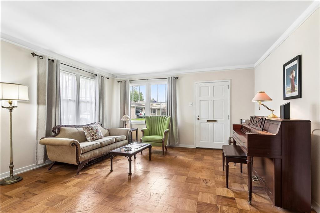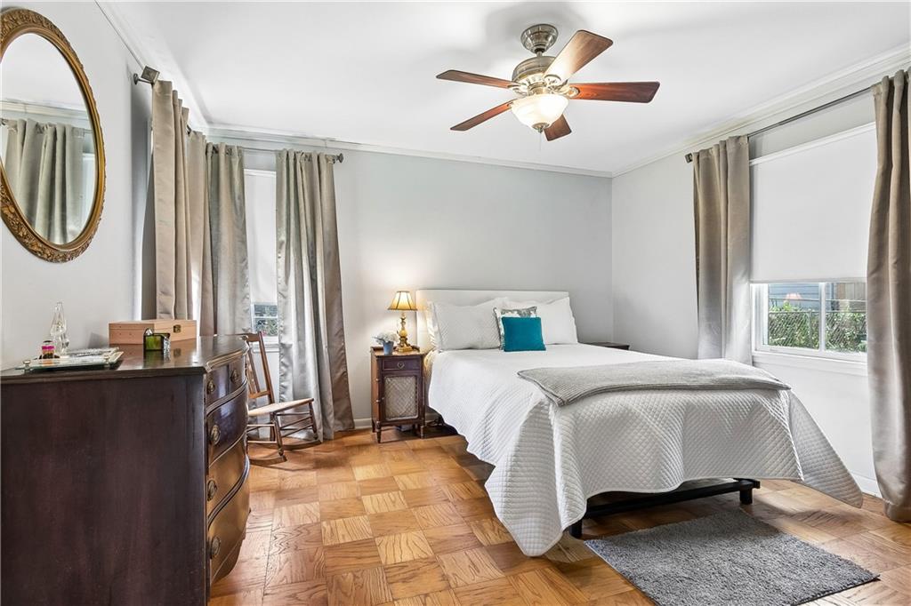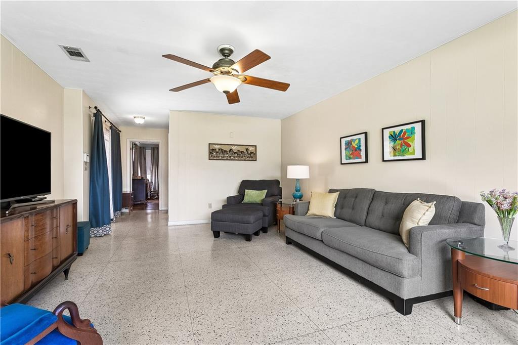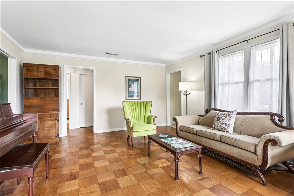 Original oak parquet wood flooring graces the living room and bedrooms, while terrazzo flooring - a hallmark of mid-century American architecture - anchors the spacious family room/den - sleek and enduring. Both bathrooms feature iconic vintage tilework, thoughtfully maintained in the distinctive colors of the era.