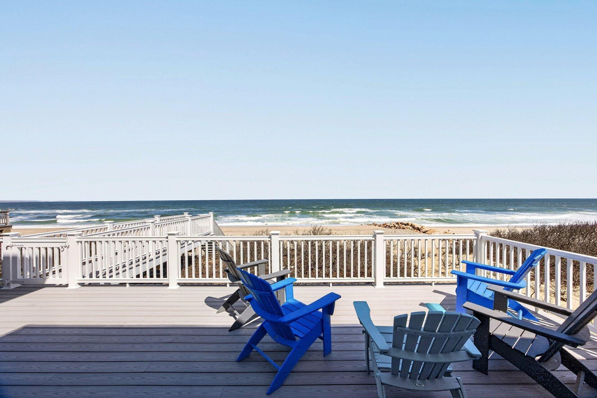 Perched directly on the dunes of East Sandwich with the shimmering expanse of Cape Cod Bay as its backyard, this striking residence is offered fully furnished and ready to be enjoyed. The architectural heart of the home is a soaring, double-height great room, where a dramatic clerestory window and a wall of glass windows frame picturesque beach and water views. Wide plank oak floors and a Town & Country gas fireplace with an integrated window seat anchor the space, while a second-floor mezzanine with stainless steel cable railings maintains a sense of airy transparency. The open-concept layout extends into a gourmet kitchen defined by custom cabinetry with black walnut interiors, natural quartz countertops, and professional-grade appliances, creating a space that is as much a social hub as it is a culinary sanctuary for watching the tide move across the iconic Sandwich flats. Sliding glass doors open onto a sprawling deck overlooking the bay, encouraging the comfortable indoor/outdoor flow of the home. Private bedrooms offer a refined blend of whimsical character and spa-like luxury, each with its own en suite bathrooms finished with Carrara marble. In the first-floor primary suite, the focus remains on the water, complemented by an en suite bathroom featuring a glass-enclosed shower and a hammered nickel soaking tub set against plantation-shuttered windows. Three upstairs bedrooms provide space and comfort for family or friends. From the custom California Closets to the natural cedar roof with copper flashing, thoughtful design is woven into every detail of the home, inside and out. Private stairs off of the outdoor deck lead directly through the dunes to the sand, offering an unparalleled lifestyle of "barefoot luxury" on one of the Cape's most beautiful stretches of coastline.