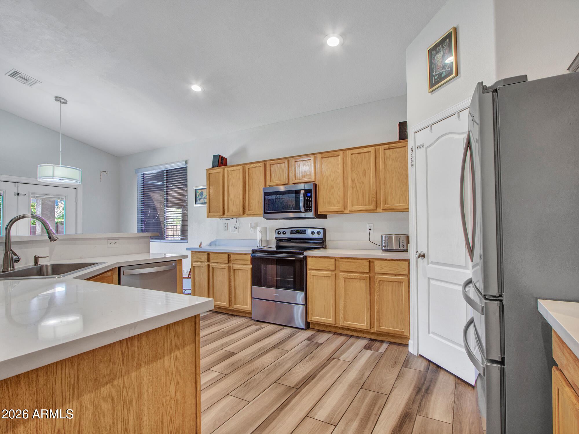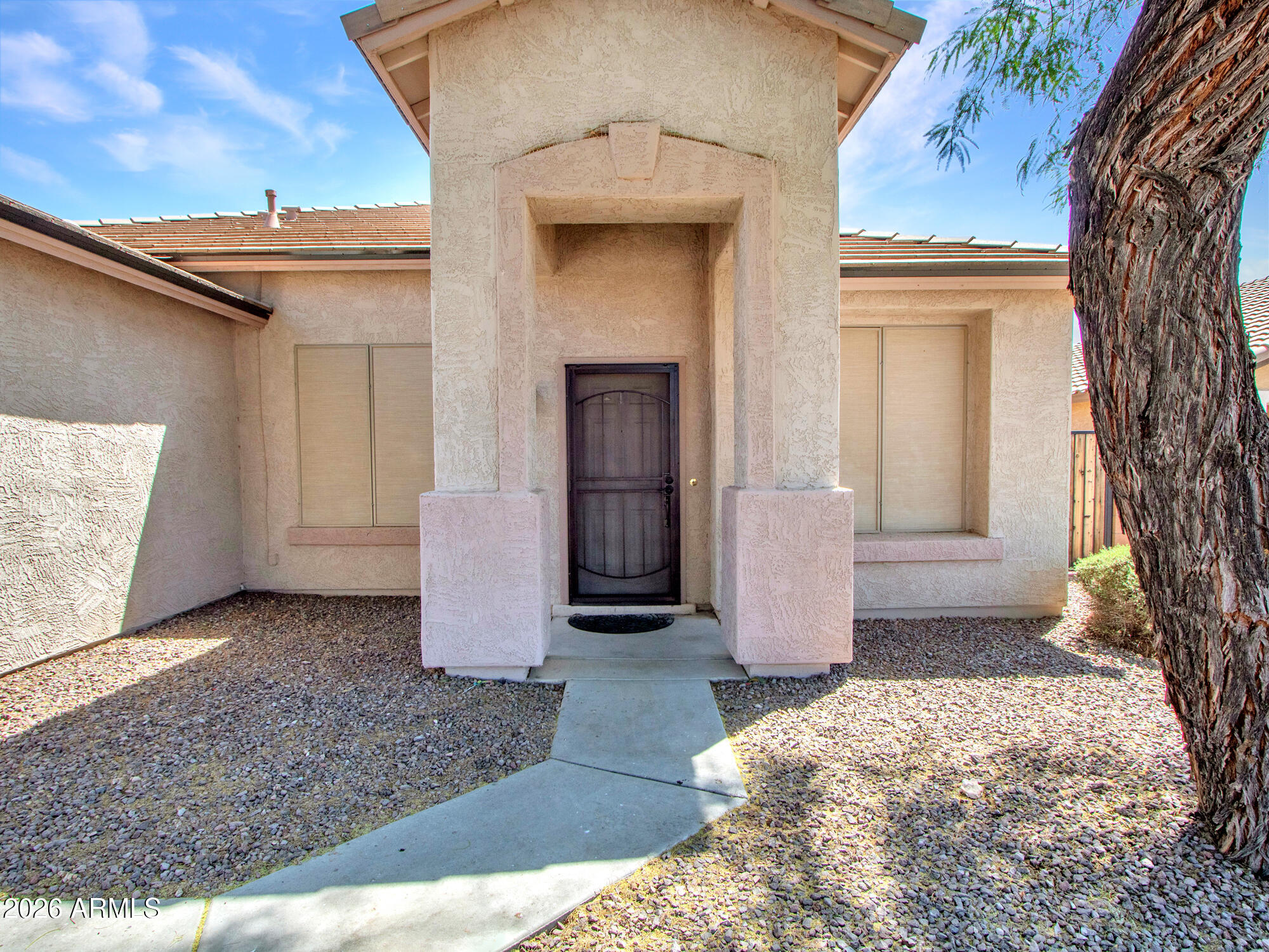 Upgraded single-level with a new roof (2021) & new Trane AC (2019). Enjoy a resort-style backyard with a newer pool (2021) with water feature, paver patio, covered patio with pull-down shade, artificial turf, and firepit--perfect for entertaining.Inside features vaulted ceilings and wood-look tile flooring. Updated kitchen with oak cabinets, new quartz countertops, island, walk-in pantry, and stainless steel appliances. New carpet in all bedrooms, sunscreens & owned alarm system.The primary suite showcases a beautifully updated bathroom with a freestanding soaking tub, a custom tiled walk-in shower, new cabinetry, and modern light fixtures--creating a true spa-like retreat. Move-in ready with all the right upgrades. Conveniently located near shopping, dining & good schools & entertainment.