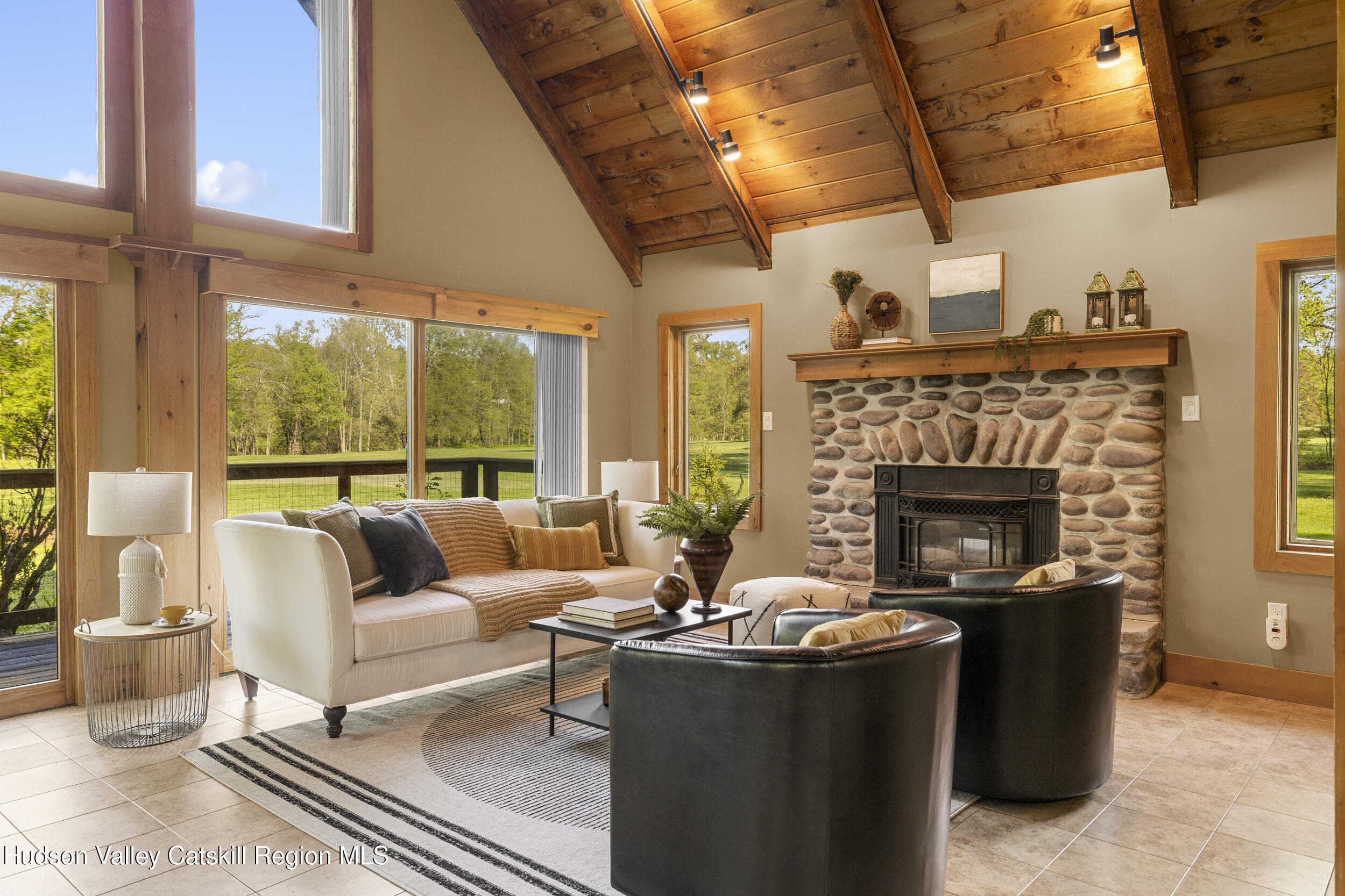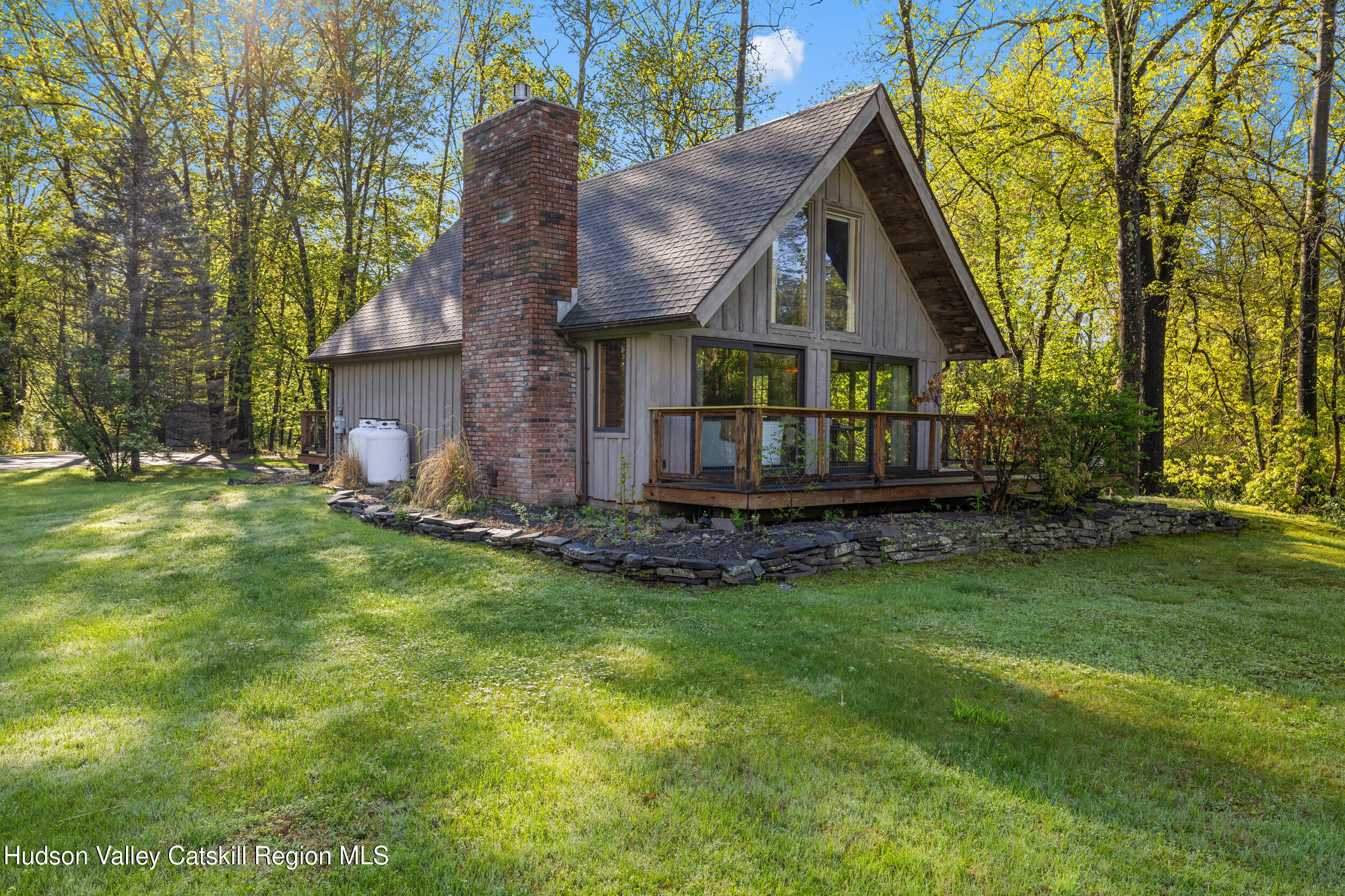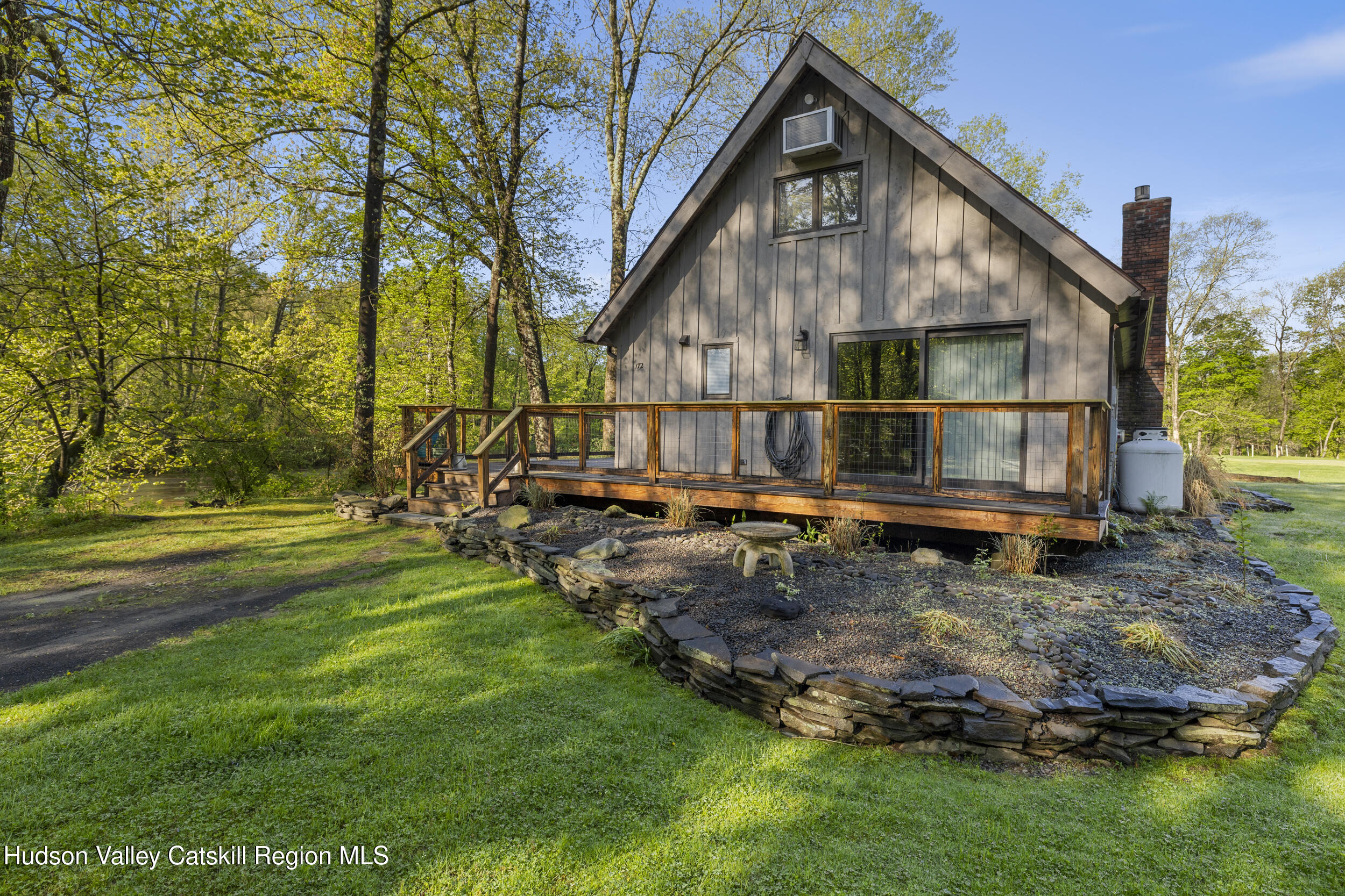 Waterfront and on a golf course! Just 90 minutes from Metro NY, this two-bedroom chalet style home with 2.3 acres and expansive frontage on the Rondout Creek is also sited on the 7th green and at the end of a cul-de-sac. The wrap around deck allows for seasonal dining and enjoyment of the outdoors, including sunsets and the lovely creek. The great room includes a generous sized living room and dining area with floor to ceiling windows, vaulted ceiling and stone fireplace with propane stove insert. Smartly designed kitchen with new quartz countertops and sink, ample cabinets and pantry. Truly a bird watcher's paradise, there is a view from almost every window - either the creek for wildlife or the bright green golf course! Any anglers in your group? Bring your fishing pole to take advantage of the direct Rondout Creek frontage and hook a nice small mouth bass. The main floor bedroom is well-sized with two closets and adjacent full bath. The second story sleeping loft also has a vaulted ceiling and is open to the common space. The 14X8 storage shed is great for your belongings and two kayaks are included in the sale! Take advantage of this rare opportunity to make your own memories in a home that is ready for a new chapter, having been cherished by the same family for decades. So well located - just two minutes to High Falls for Ollie's Pizza, Blue Heron Books and vintage shopping. Ten minutes to Mohonk Preserve's Spring Farm Trailhead, 20 minutes to Kingston and New Paltz for easy access to the NYS Thruway and all the area has to offer. Enjoy our local venues such as Innes for world class dining and spa, Arrowood for local cider and spirits, Kelder's Farm to pick fresh produce and join the Stone Dock Golf Course for a great nine holes of golf. For either full or part time use, this location and house is a true gem.