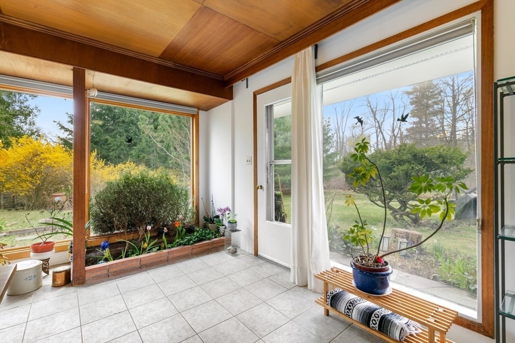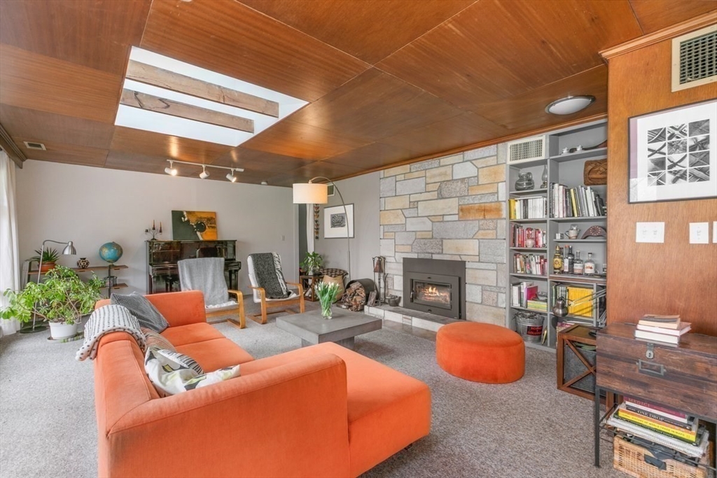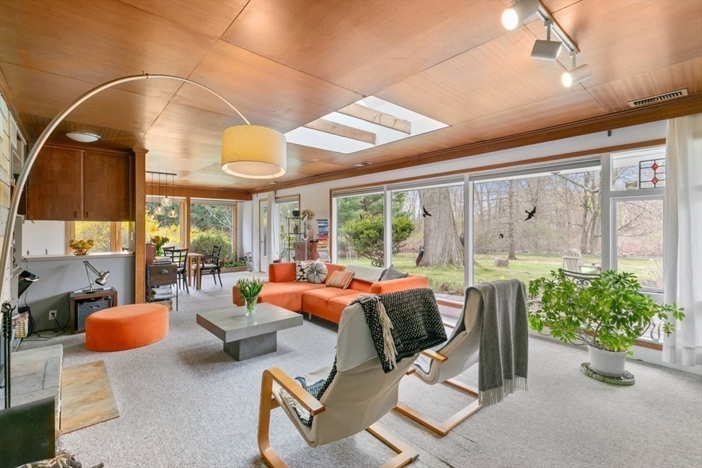 Midcentury modern 4-bedroom ranch set on a spectacular lot in a highly desirable location, 23 Alden Rd offers easy one-level living with an open, light-filled layout featuring walls of glass connecting the living, dining, and kitchen spaces. Designed/built by Harry Axelrod, inspired by architect Frank Lloyd Wright, this home emphasizes indoor-outdoor living through large windows and built-ins, creating warm, flowing spaces centered by the living room's stone wood burning fireplace with insert and overlooking the stunning backyard - truly a gardener's paradise. The tranquil, nature-inspired primary suite offers an en suite bath with serene views. A separate private den/office provides ideal work-from-home space. Additional highlights include a 2-car garage, owned solar panels, newer roof, windows, skylights, and central air/heat pump for excellent energy efficiency & low utility costs. Ideally located near downtown, Phillips Academy, Pike School, highways and the train. A must see home!