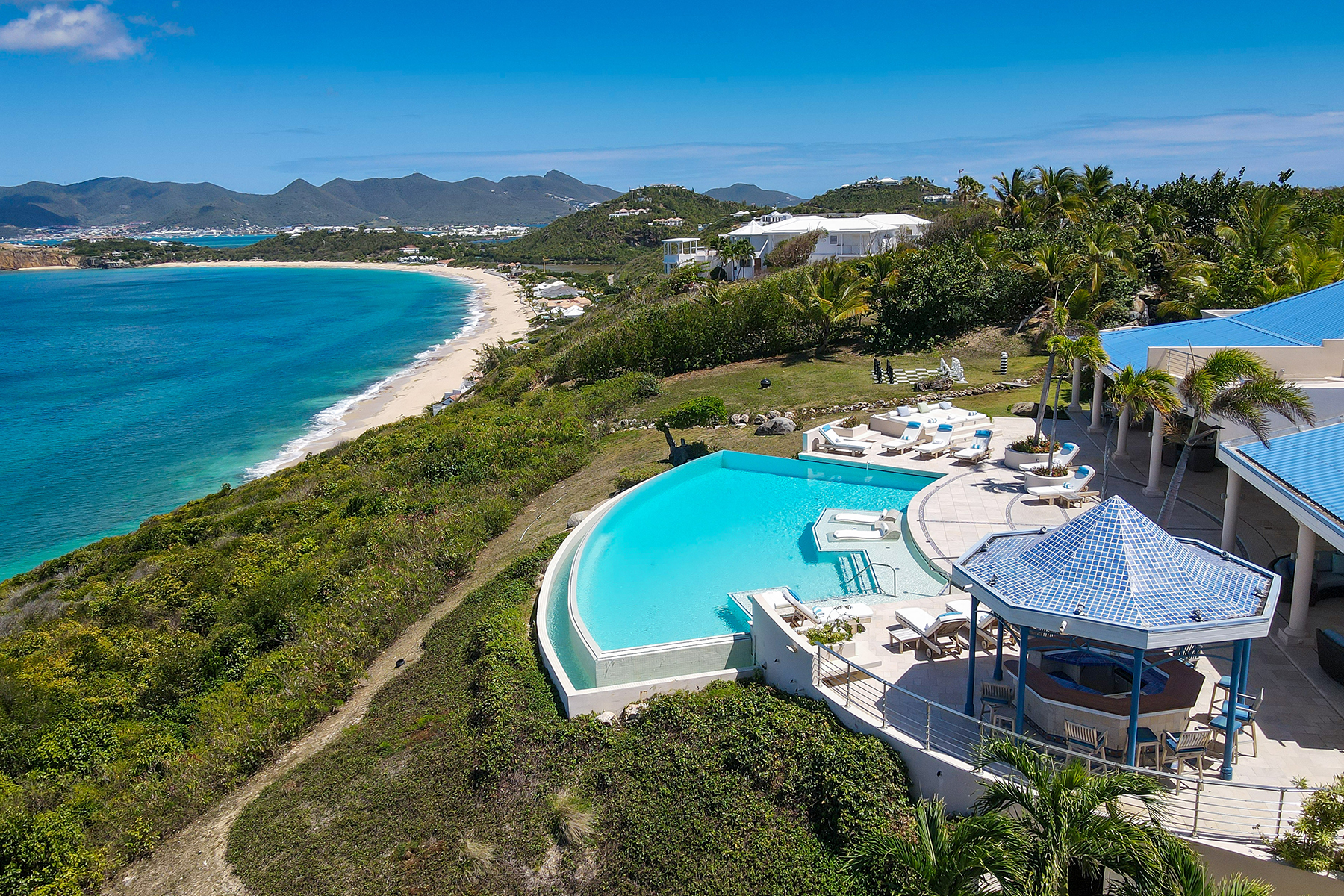 Perched atop a commanding five-acre promontory within the private, guarded enclave of Terres Basses, this thirteen-bedroom cliffside estate stands among the most singular residences in the Caribbean. Terres Basses has long been regarded as Saint Martin's most coveted address — a discreet collection of world-class villas set between the turquoise bays of Baie Rouge, Baie aux Prunes, and Baie Longue, where privacy is absolute, the architecture refined, and the sea ever-present.