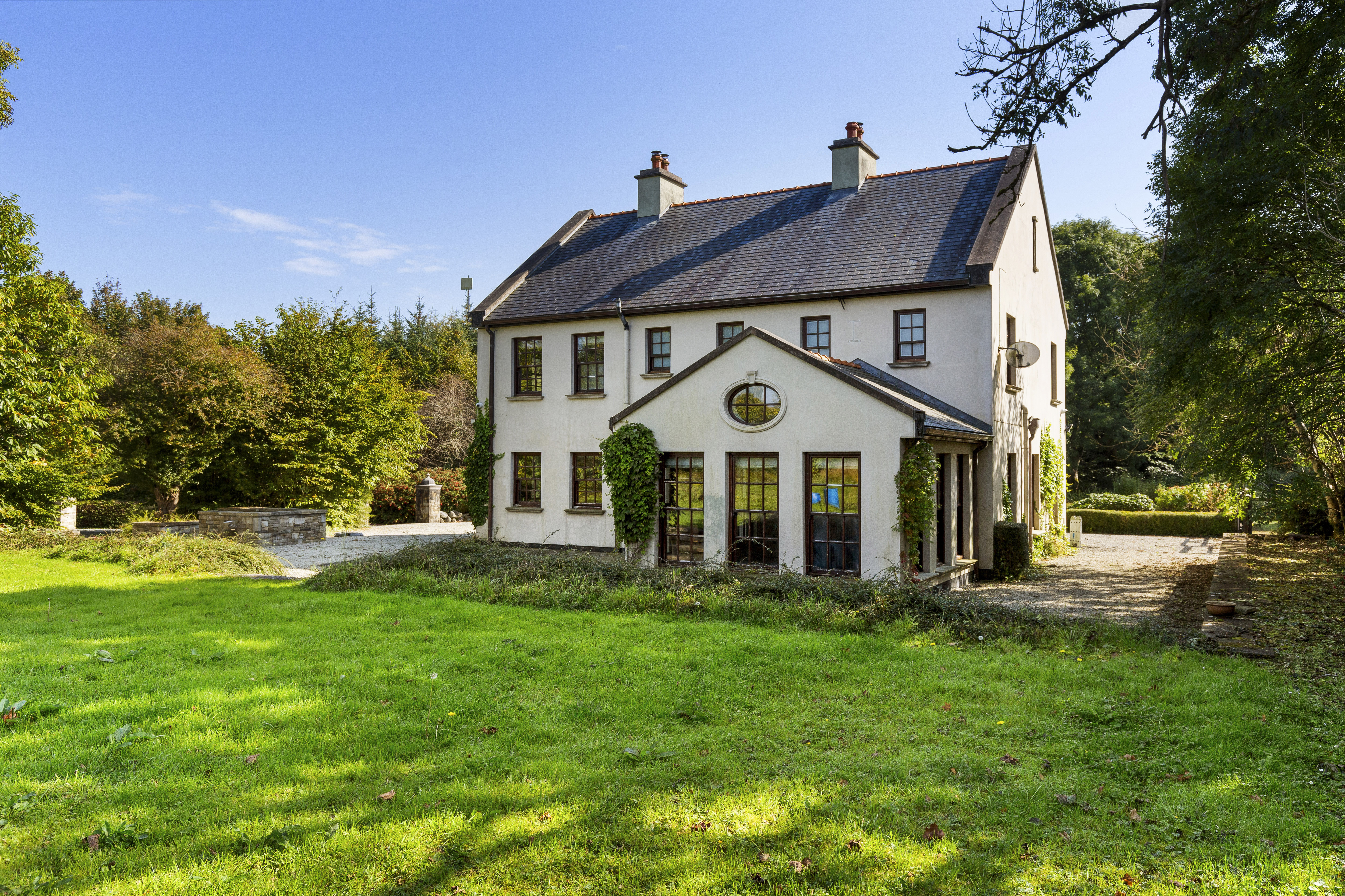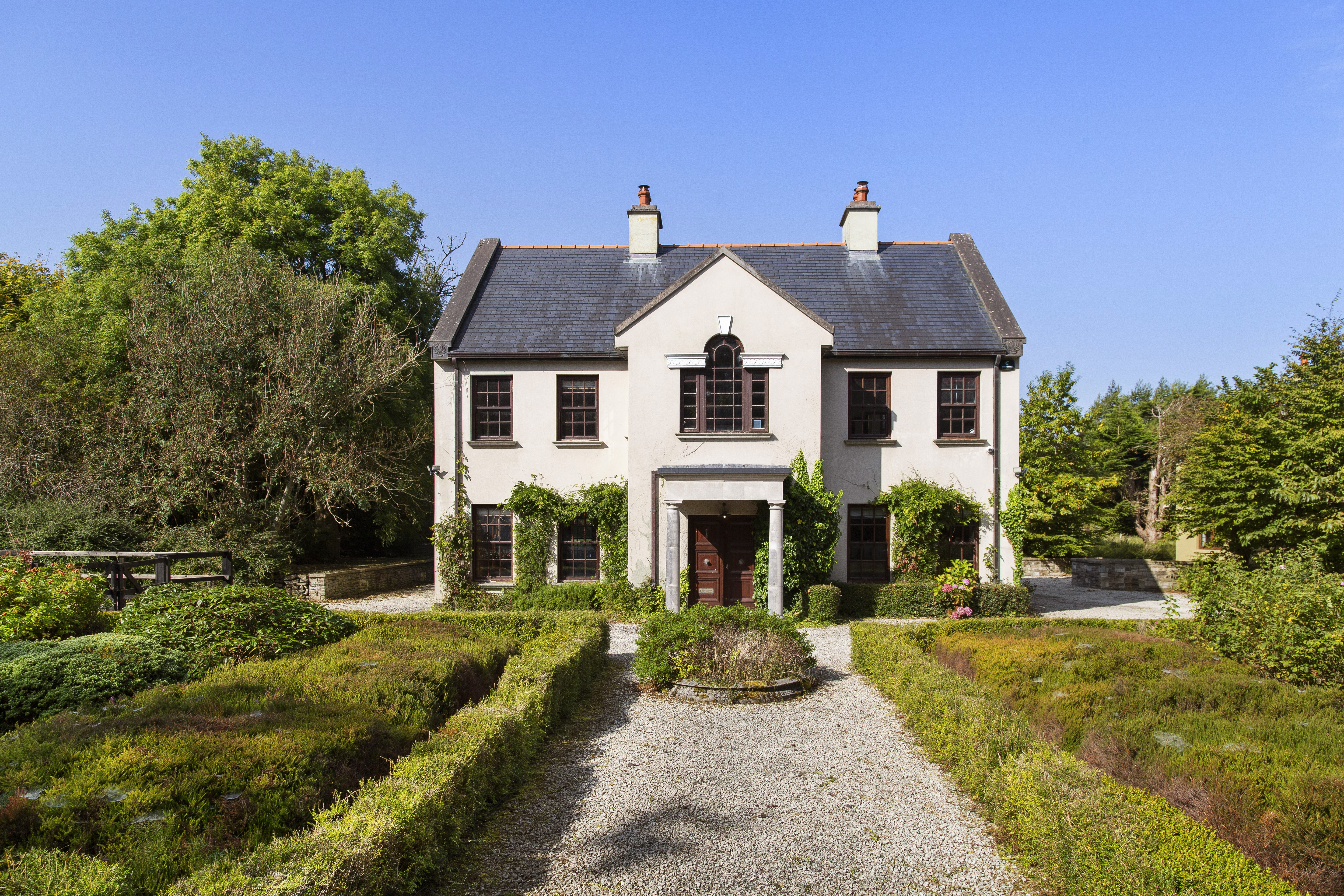 Upstairs, a large front lounge with a vaulted ceiling and coving overlooks the rose garden, the surrounding woodland and the distant Ox Mountains. The southeast-facing picture window floods the space with natural light, making it a perfect retreat to unwind.
