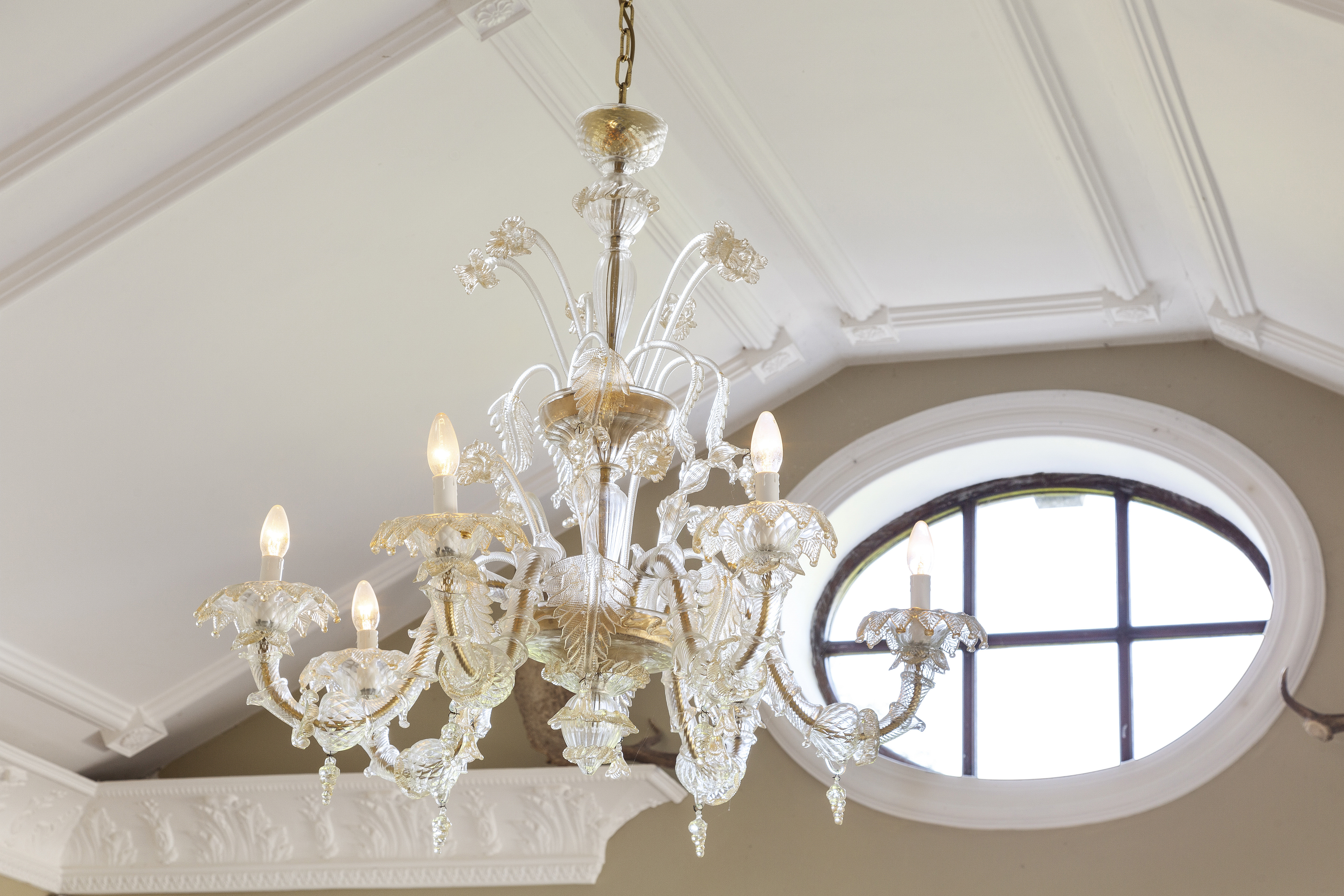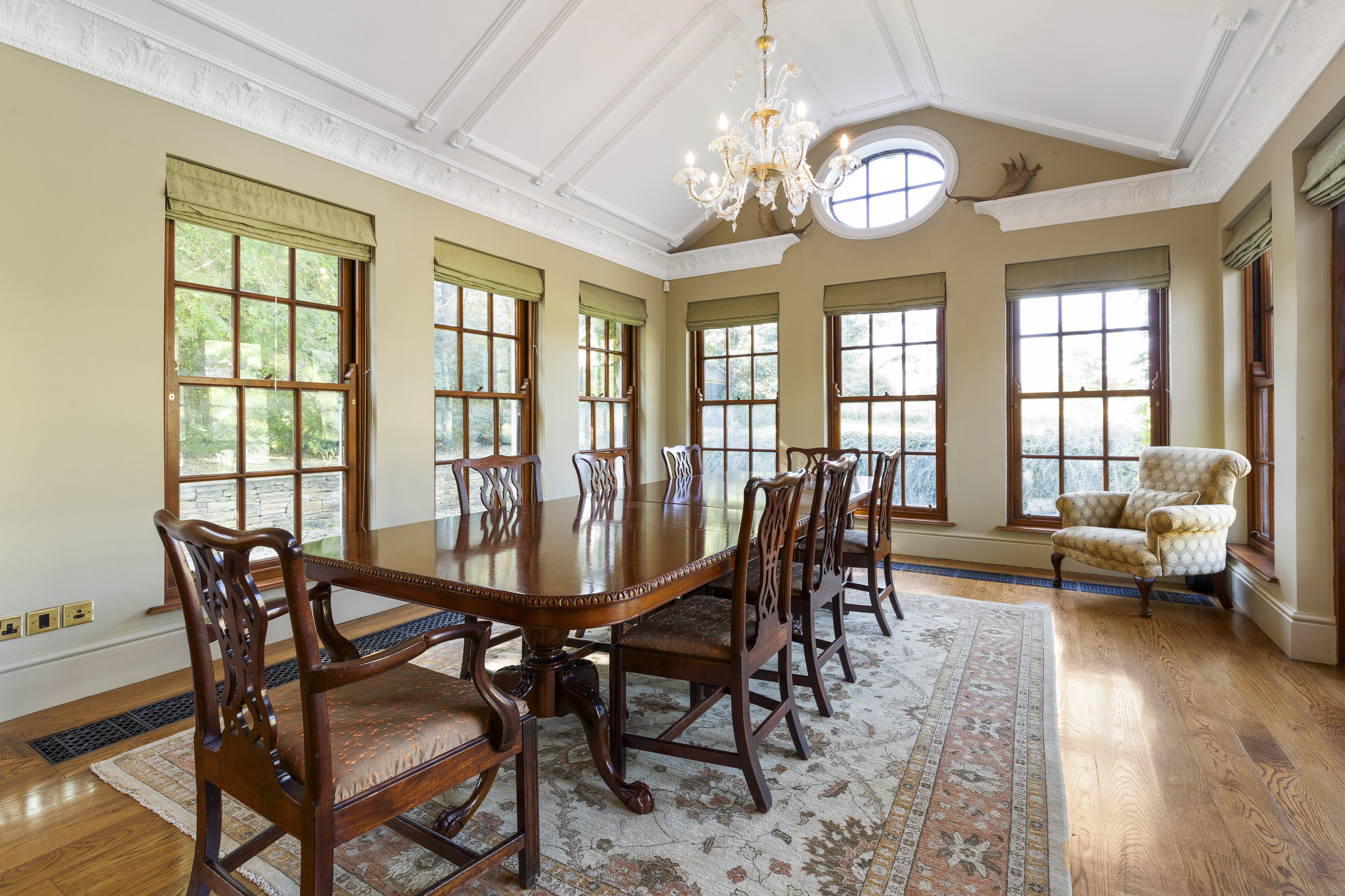 The dining room, with its vaulted ceiling, overlooks the meticulously landscaped rear garden. A ‘secret’ door connects this space to the kitchen, making it ideal for hosting formal dinners or intimate gatherings. The kitchen itself is a country-style masterpiece, boasting marble countertops, a Belfast sinks, high-end appliances, and a hardwood-burning stove. A spacious boot room, complete with ample storage, provides practicality.