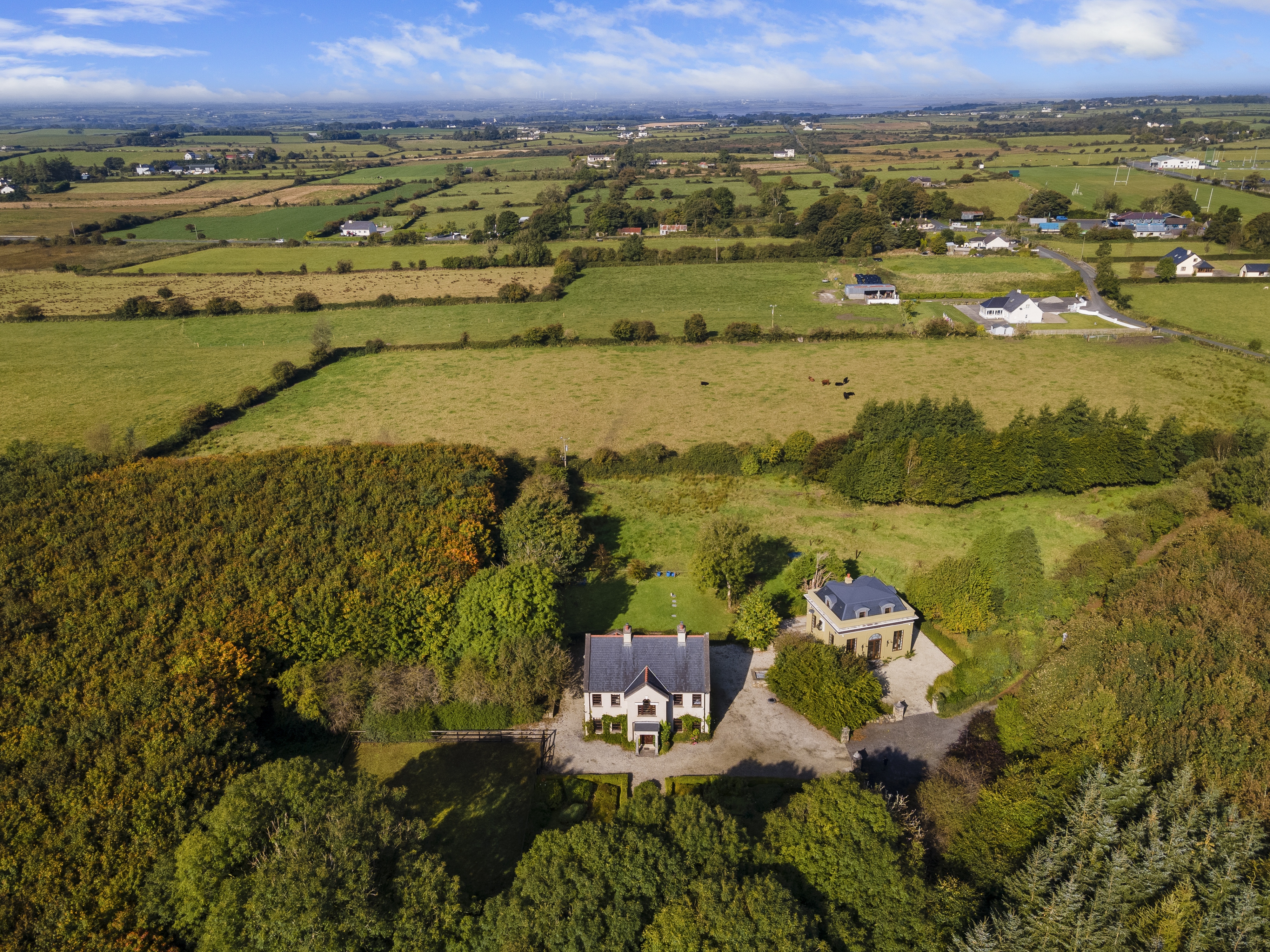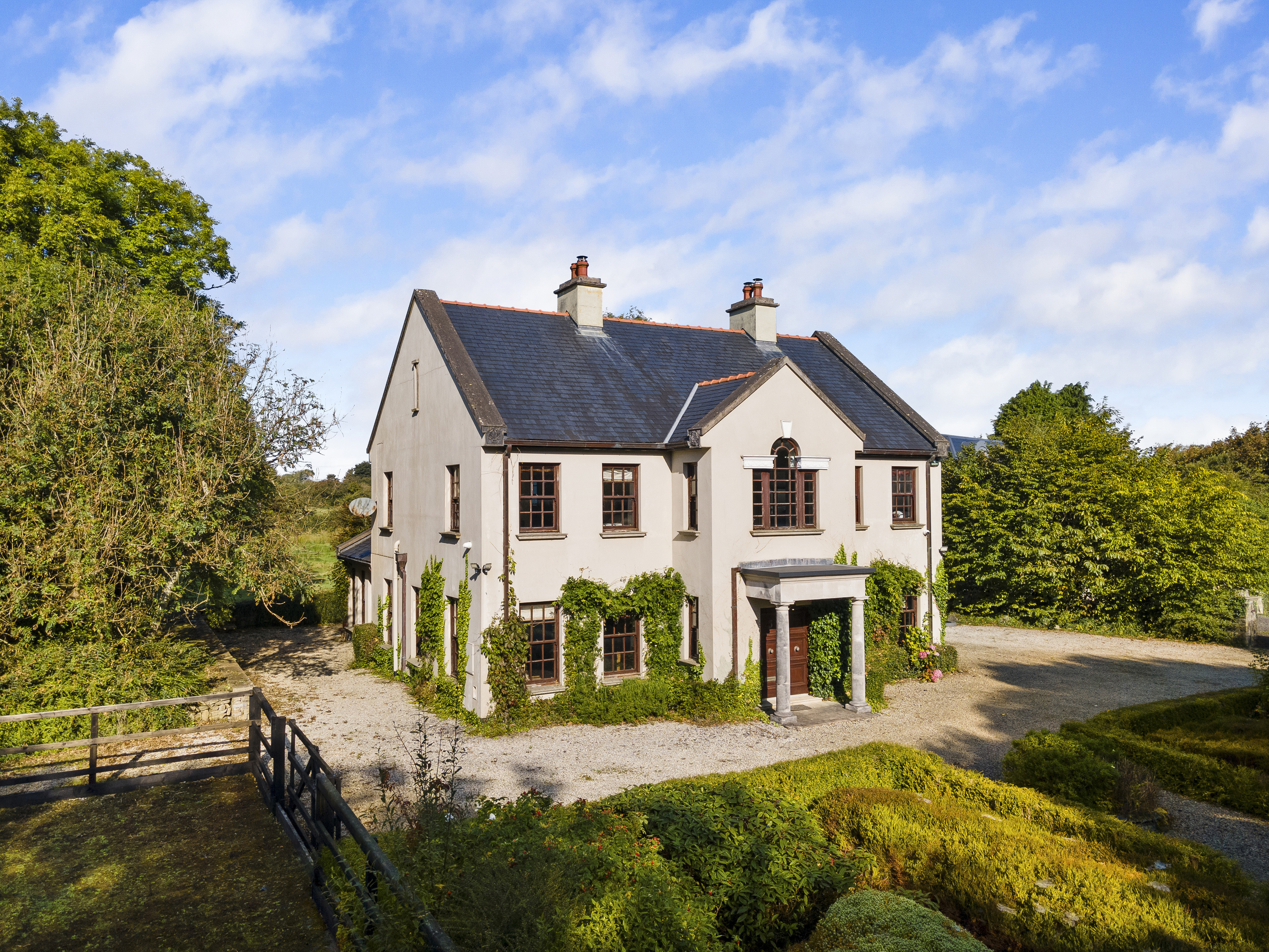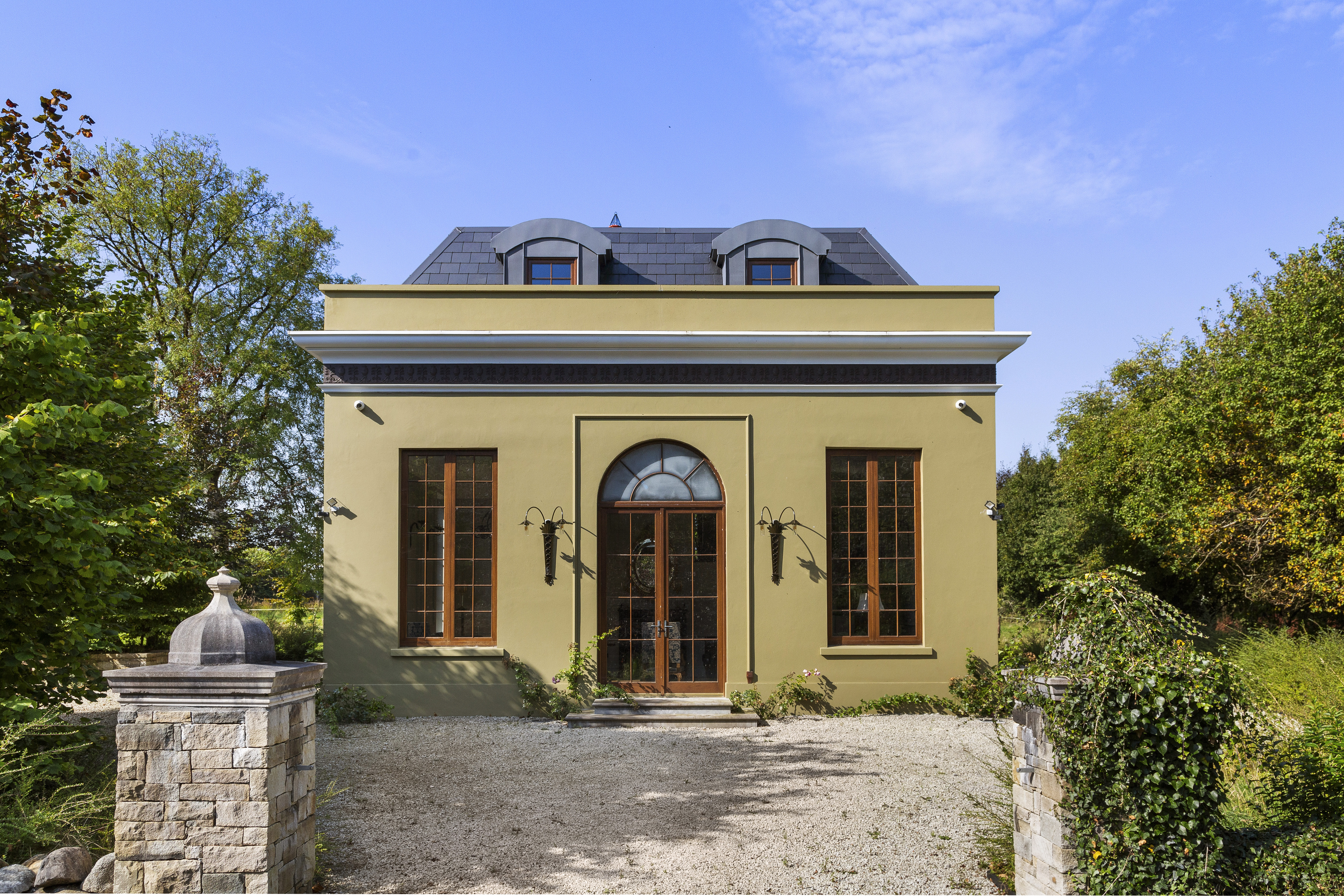 Set on 55 acres just five minutes from Enniscrone Beach: Owenerragh, House & Pavillion is a magnificent estate offering unparalleled privacy, luxury, and grandeur. A stately tree-lined drive, accessed through double electric gates, sets the tone as it leads you to the concealed heart of the property. As you approach, the first striking feature is the secondary Palladian-style residence, standing tall and commanding, followed by the breathtaking main house.
