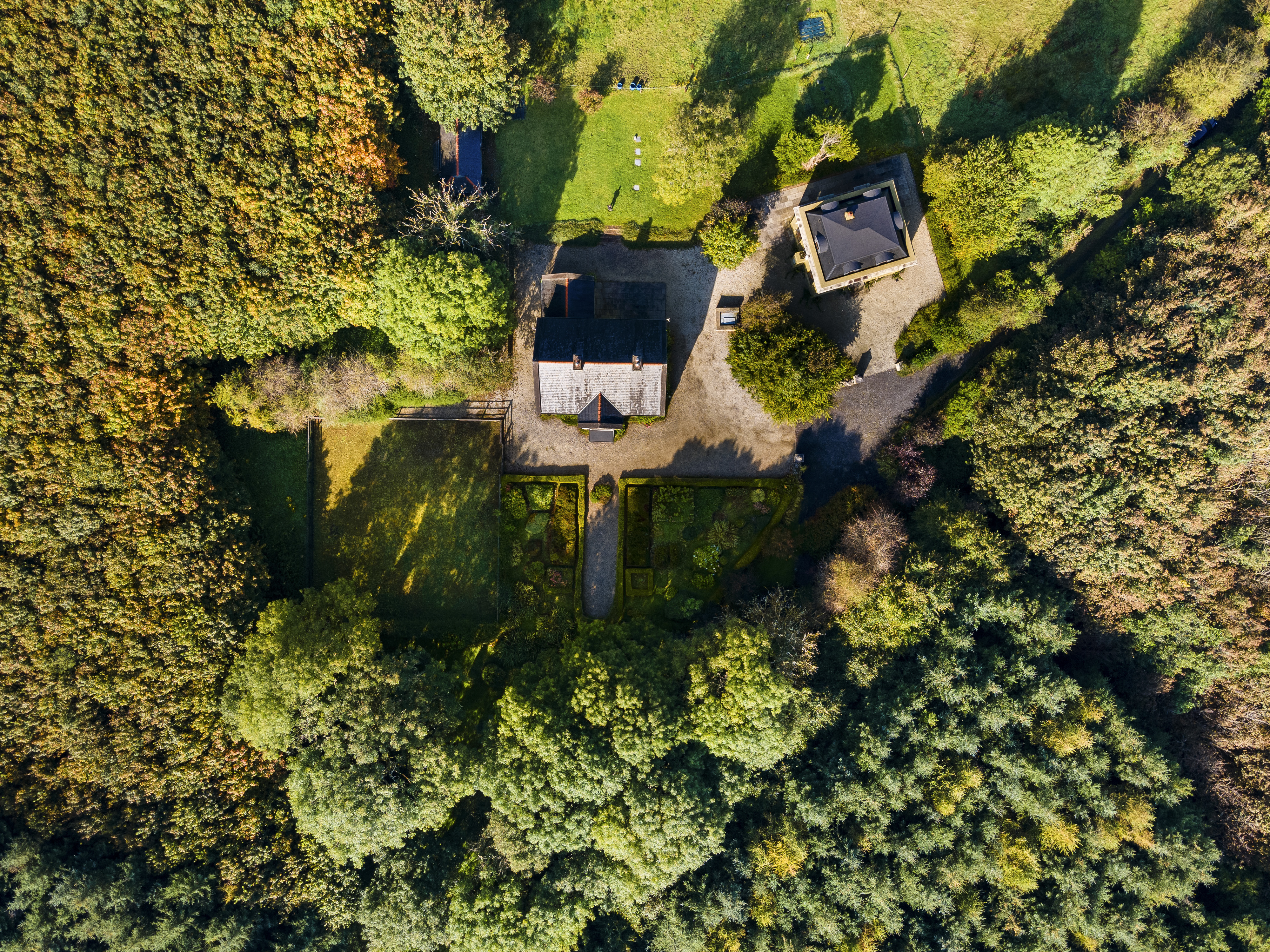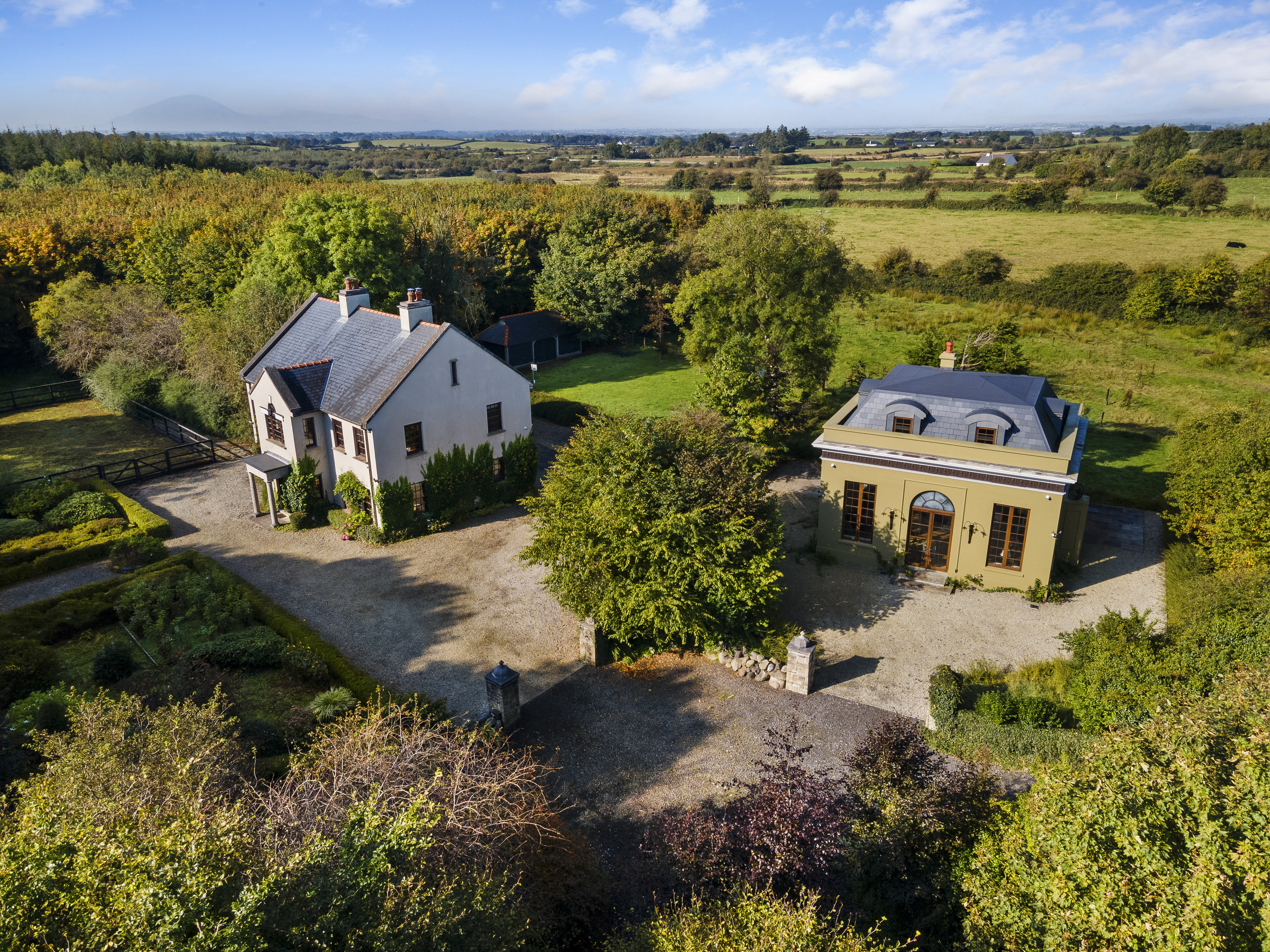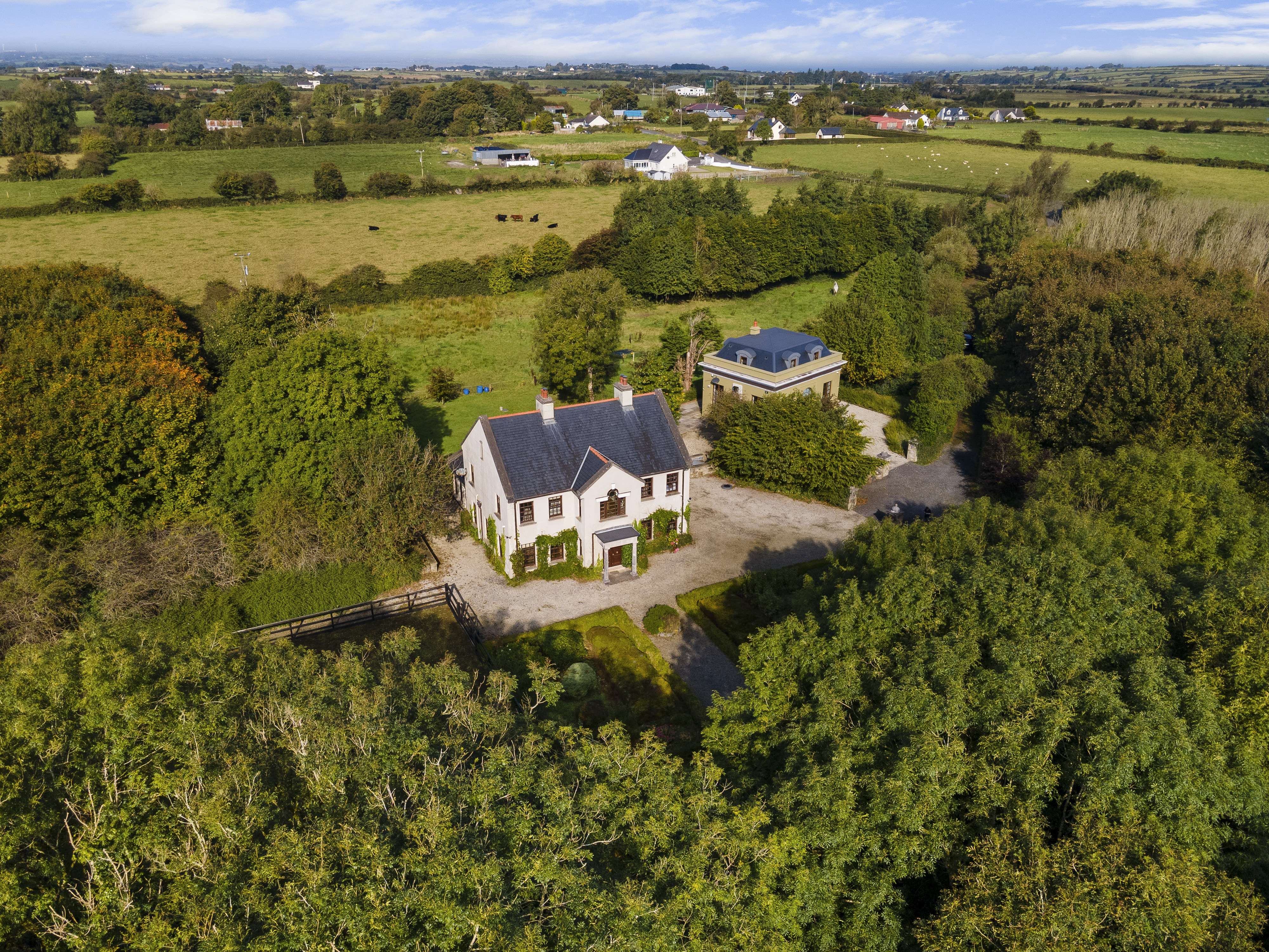 Set on 55 acres just five minutes from Enniscrone Beach: Owenerragh, House & Pavillion is a magnificent estate offering unparalleled privacy, luxury, and grandeur. A stately tree-lined drive, accessed through double electric gates, sets the tone as it leads you to the concealed heart of the property. As you approach, the first striking feature is the secondary Palladian-style residence, standing tall and commanding, followed by the breathtaking main house.