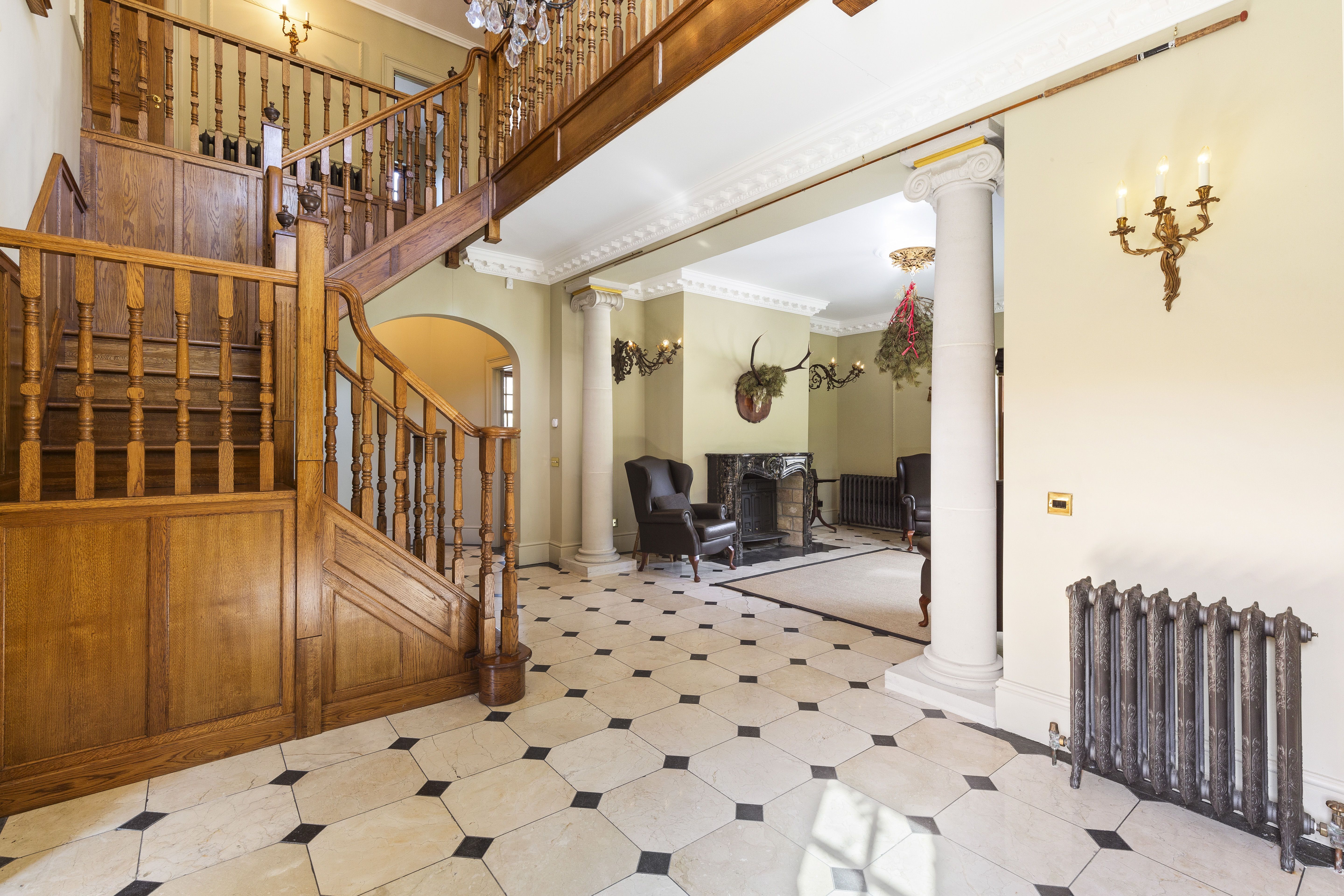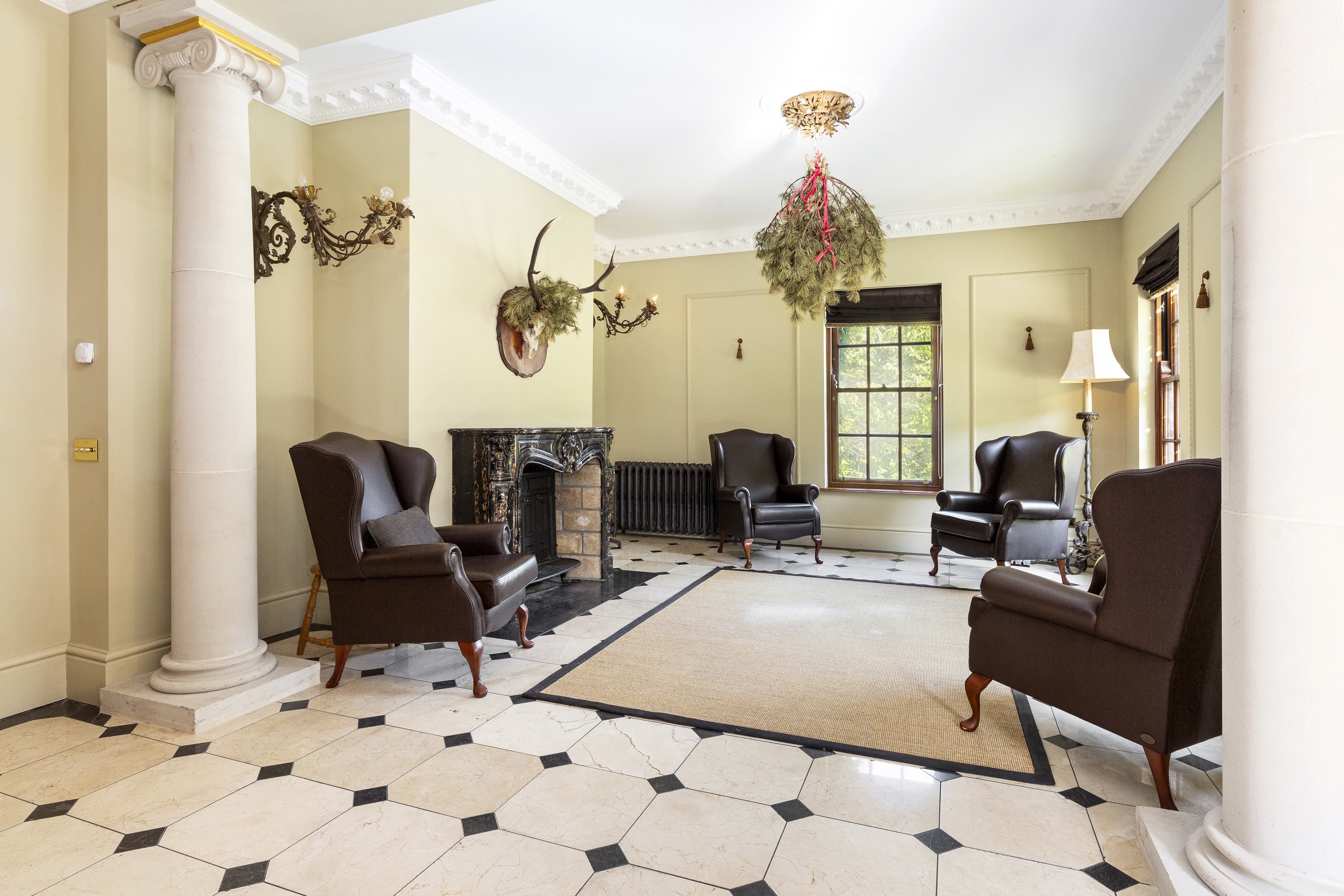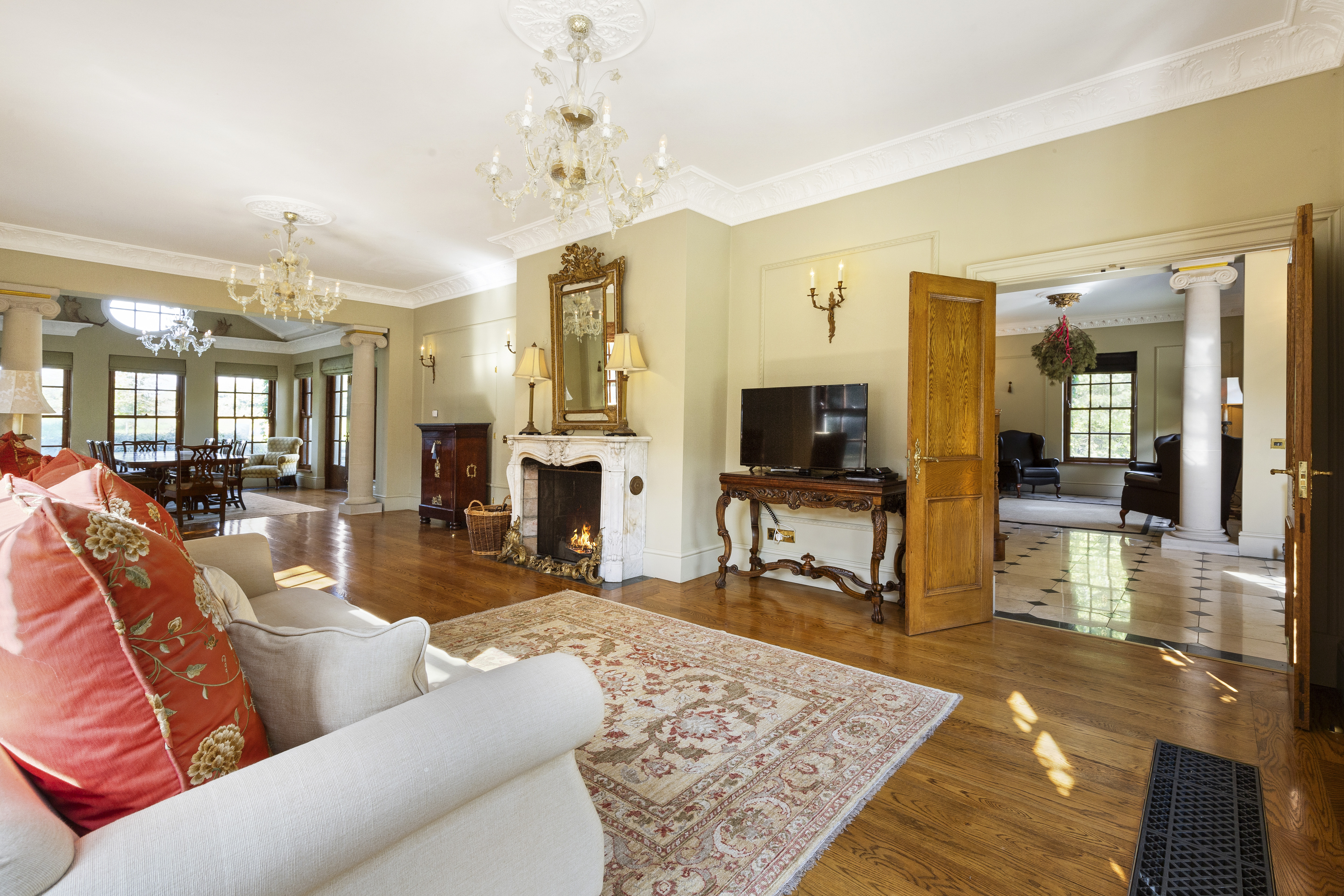 The house exudes character and refined craftsmanship, from the classic sash windows and limestone window sills to the copper gutters and downpipes. Inside, opulent details abound, including black-and-gold marble feature fireplaces, a stunning mahogany staircase, oak flooring, underfloor heating, and cast-iron period-style radiators. All of the rooms are dual-aspect, maximising light and offering panoramic views of the surrounding landscape. The grand reception room, accented with limestone columns, features several sets of double doors that open to the gardens, offering seamless indoor-outdoor living, perfect for entertaining.