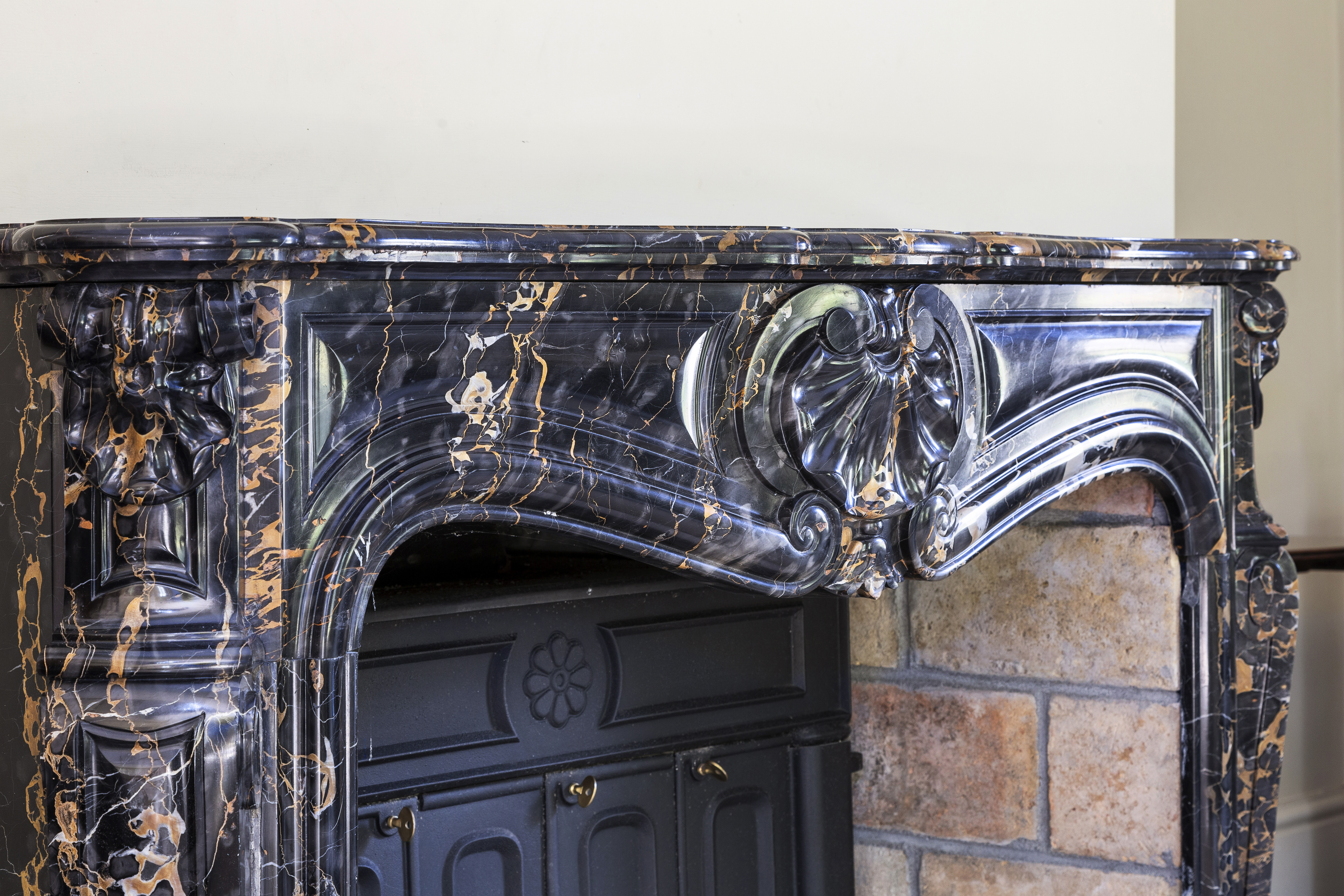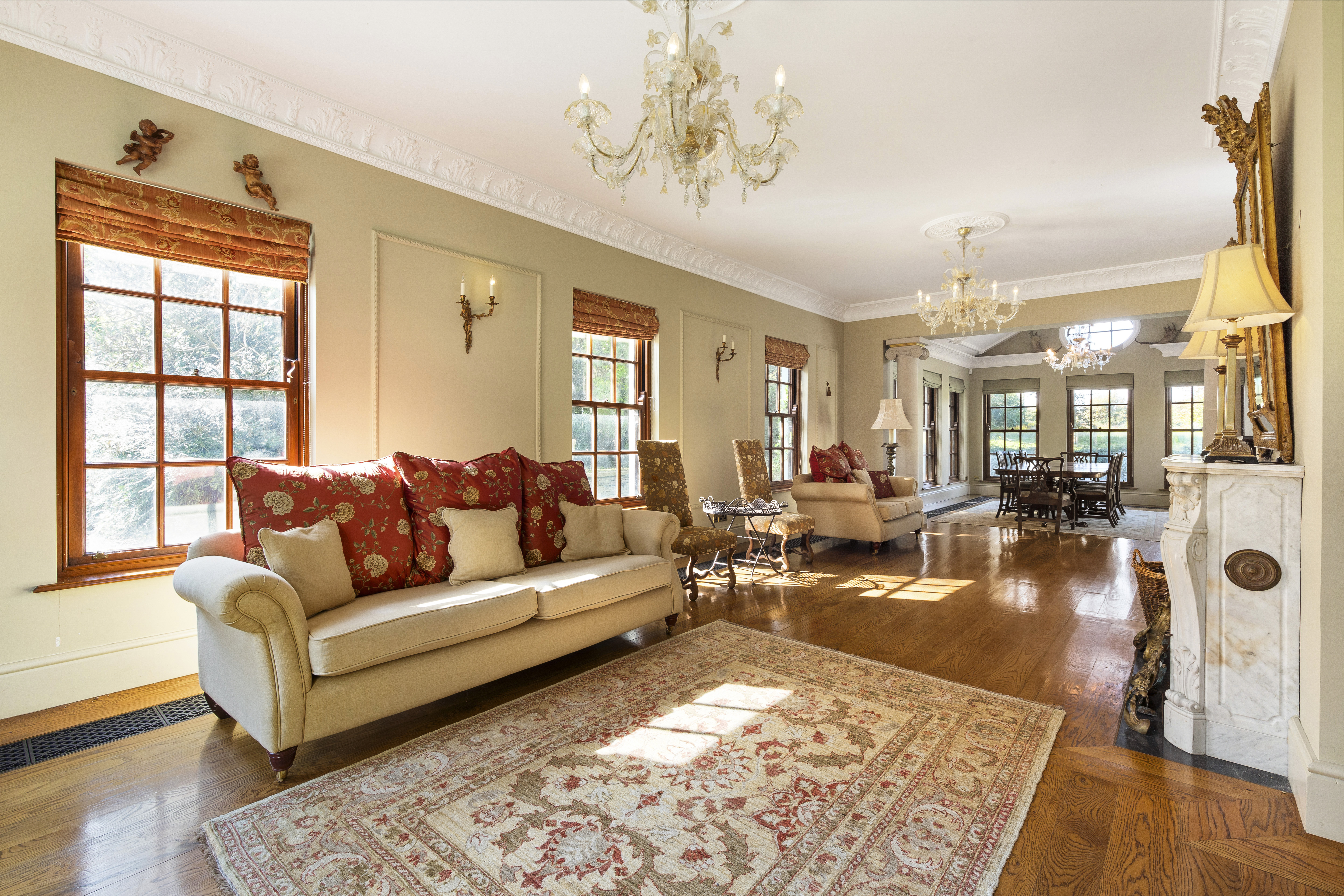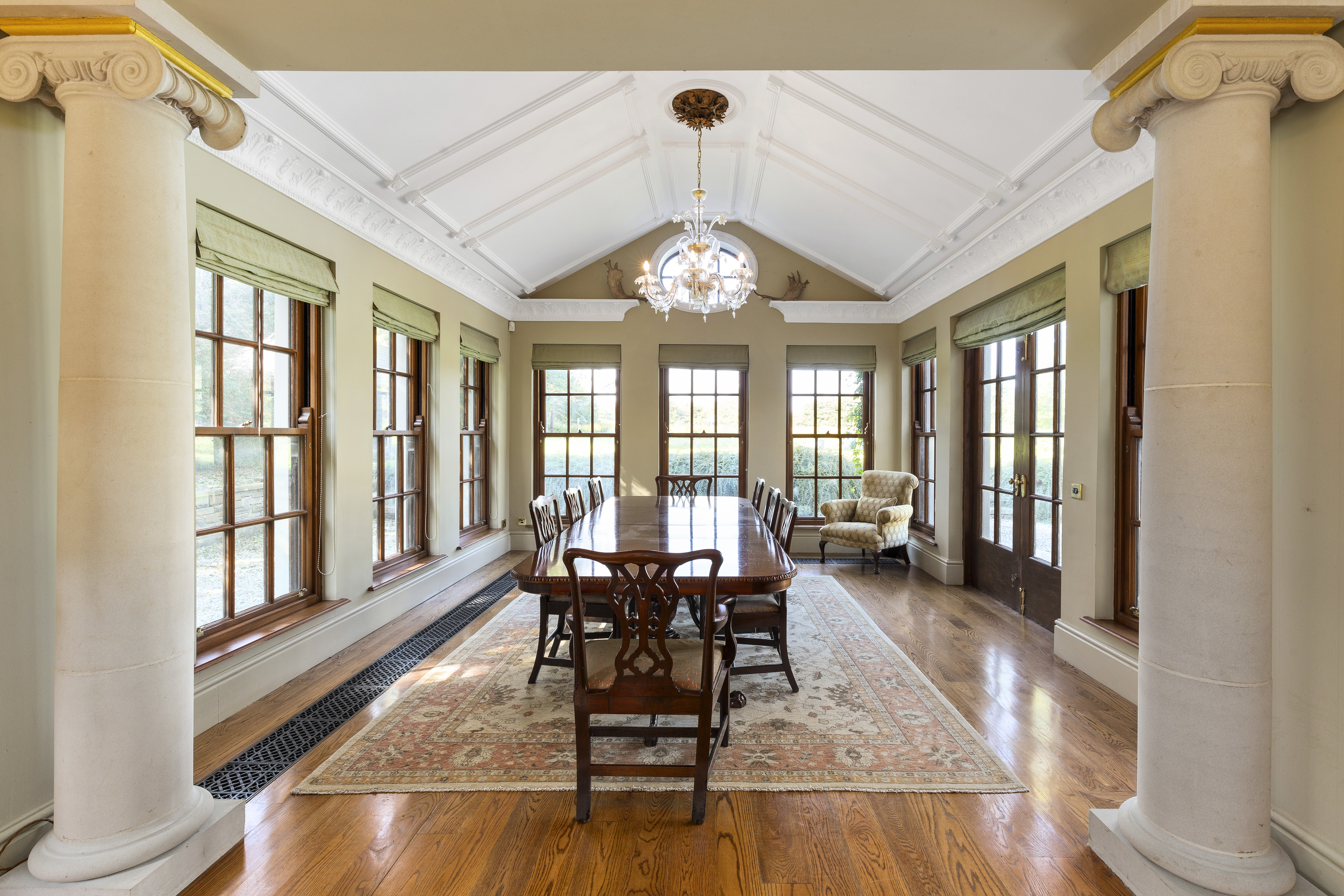 The house exudes character and refined craftsmanship, from the classic sash windows and limestone window sills to the copper gutters and downpipes. Inside, opulent details abound, including black-and-gold marble feature fireplaces, a stunning mahogany staircase, oak flooring, underfloor heating, and cast-iron period-style radiators. All of the rooms are dual-aspect, maximising light and offering panoramic views of the surrounding landscape. The grand reception room, accented with limestone columns, features several sets of double doors that open to the gardens, offering seamless indoor-outdoor living, perfect for entertaining.