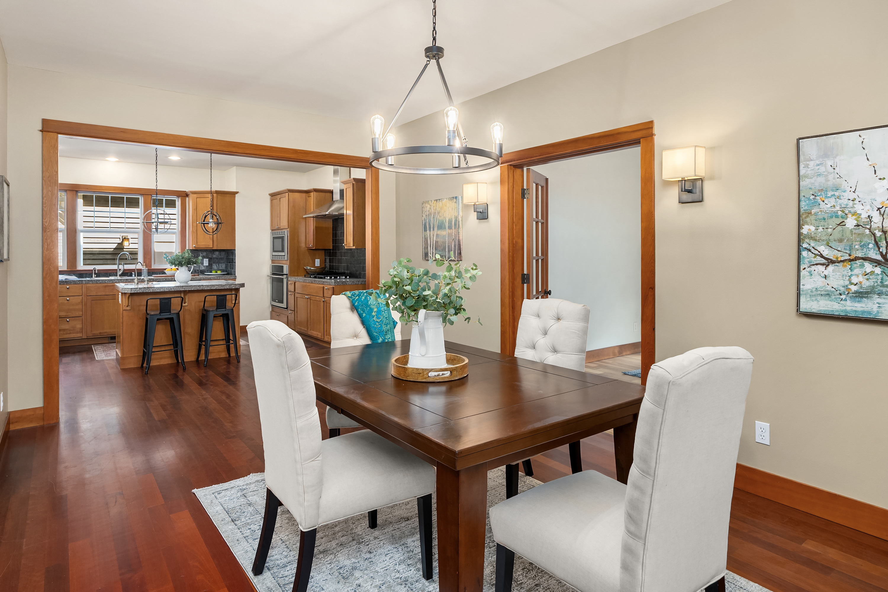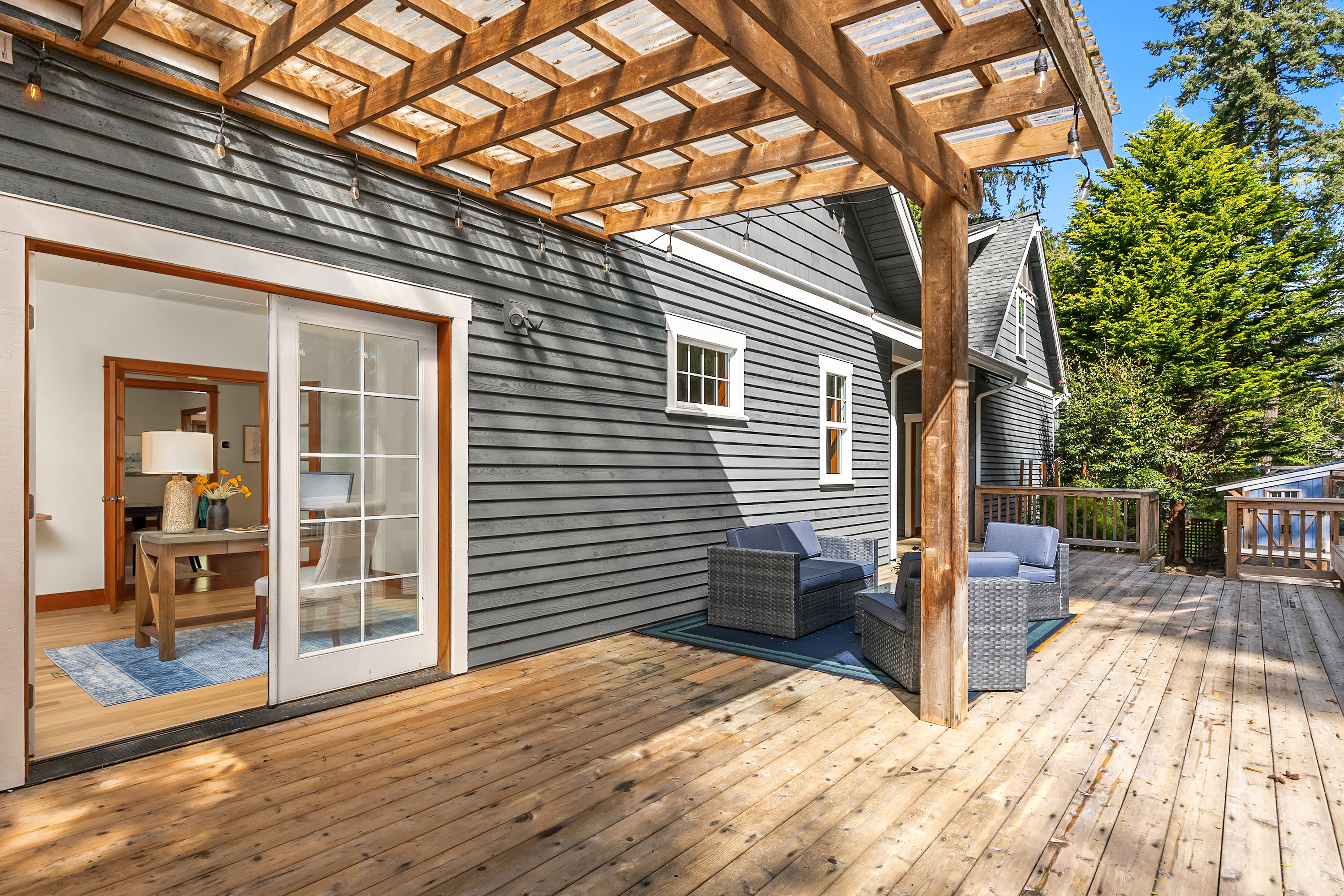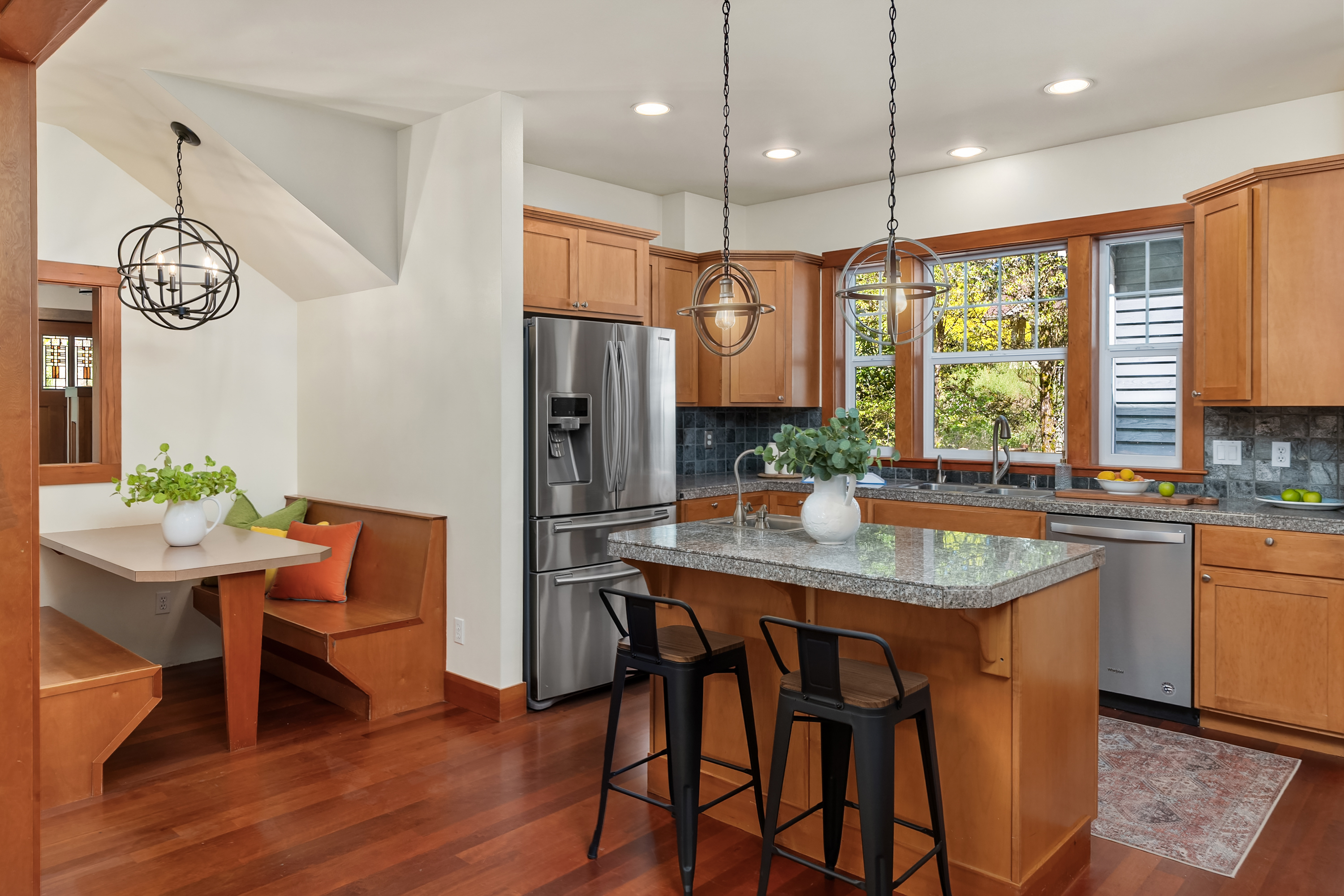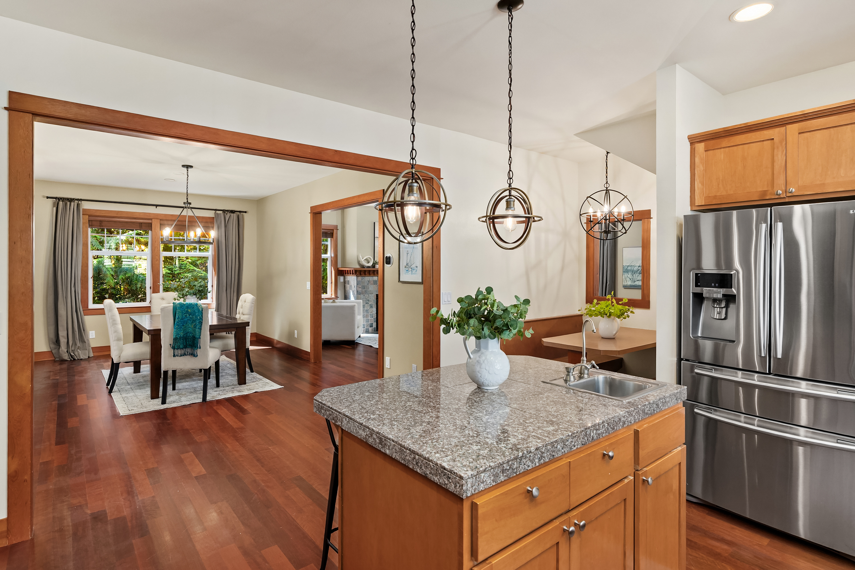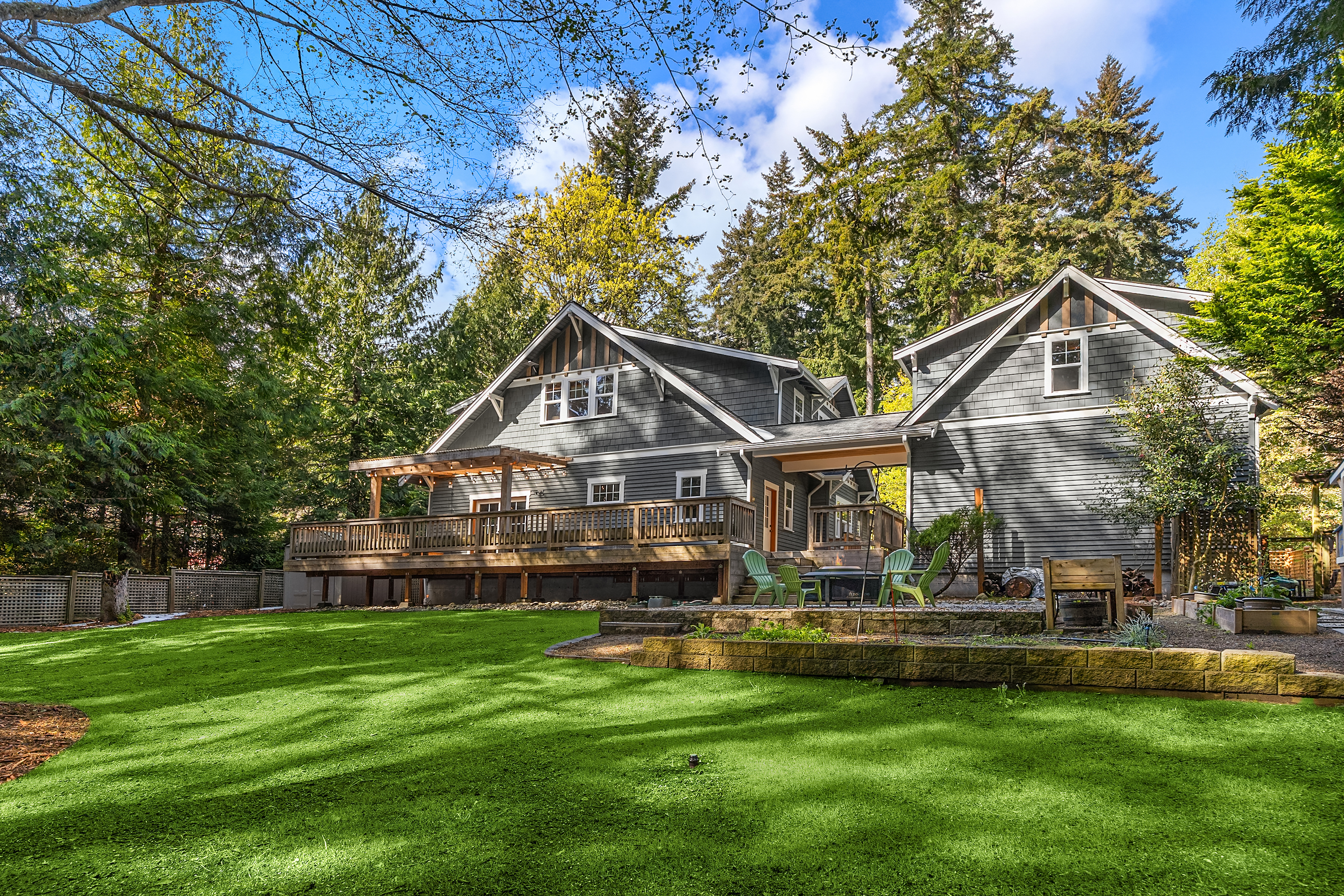 Set on just under an acre in a peaceful, quiet location, less than a mile from Fay Bainbridge Park and only minutes from Rolling Bay, this thoughtfully designed Craftsman offers timeless character, flexible living, and a beautiful Bainbridge Island setting. A classic covered front porch welcomes you into interiors defined by tall ceilings, a slate foyer, stained glass front door, solid-core wood doors, wood-framed windows, and rich Moabi hardwood floors through the main living areas. The inviting living room centers around a gas fireplace, while the spacious kitchen features cherry cabinetry, granite countertops, a center island with prep sink, propane cooktop, wall oven, and a charming breakfast nook. Formal and informal spaces connect easily for everyday living and entertaining, and the office/den offers built-in bookcases and French doors opening to the deck. Above the detached two-car garage, approximately 460 sqft of finished space with a kitchenette and 3/4 bath offers exceptional flexibility for guests, a studio, media room, or private workspace. Outside, the lifestyle continues with a large back deck, stone patio and fire pit, raised garden beds, a spacious private yard, trails through the forest, chicken coop, and a covered walkway connecting the garage and house.