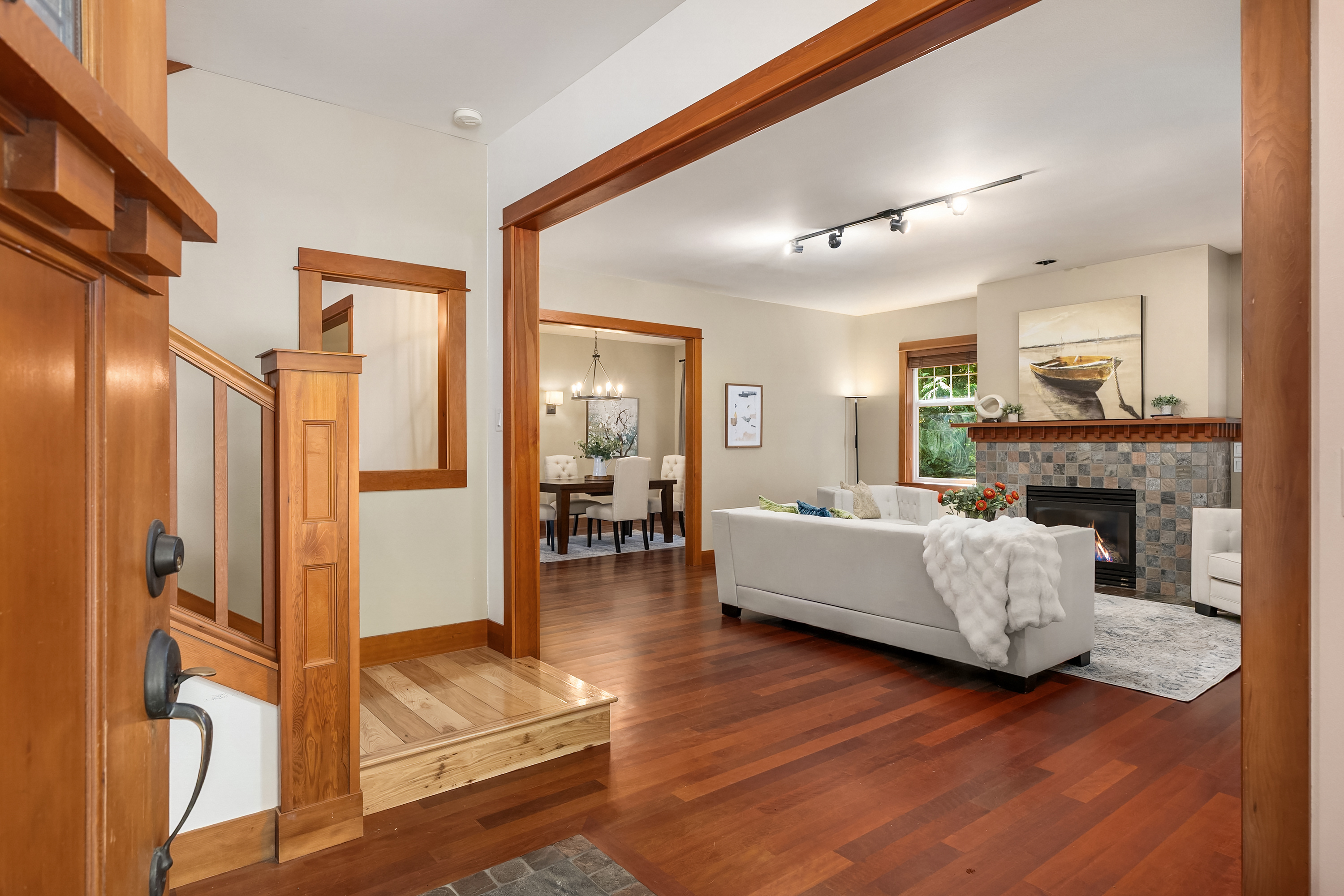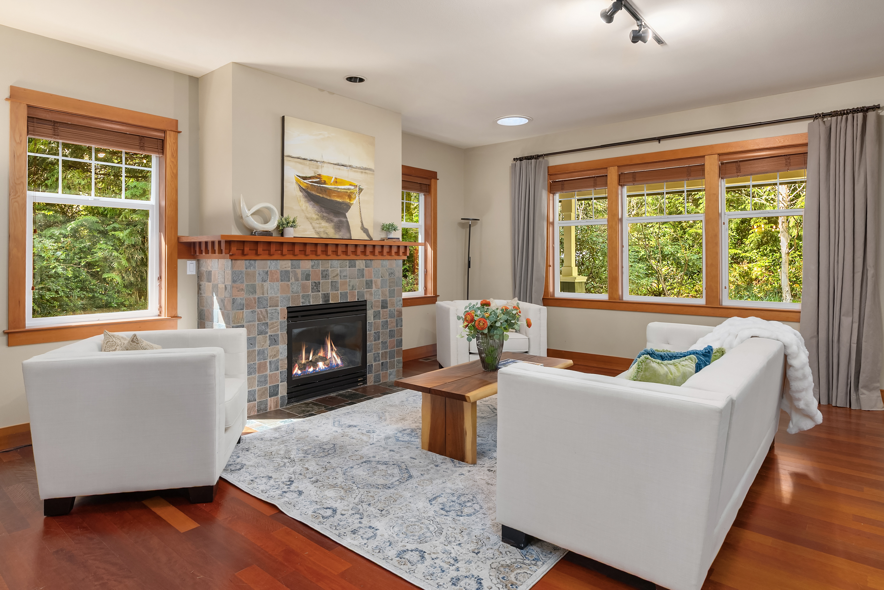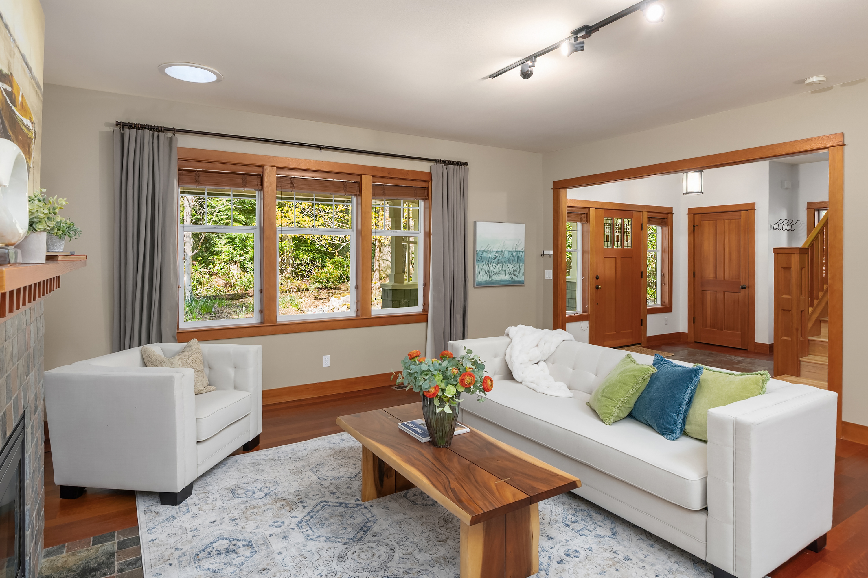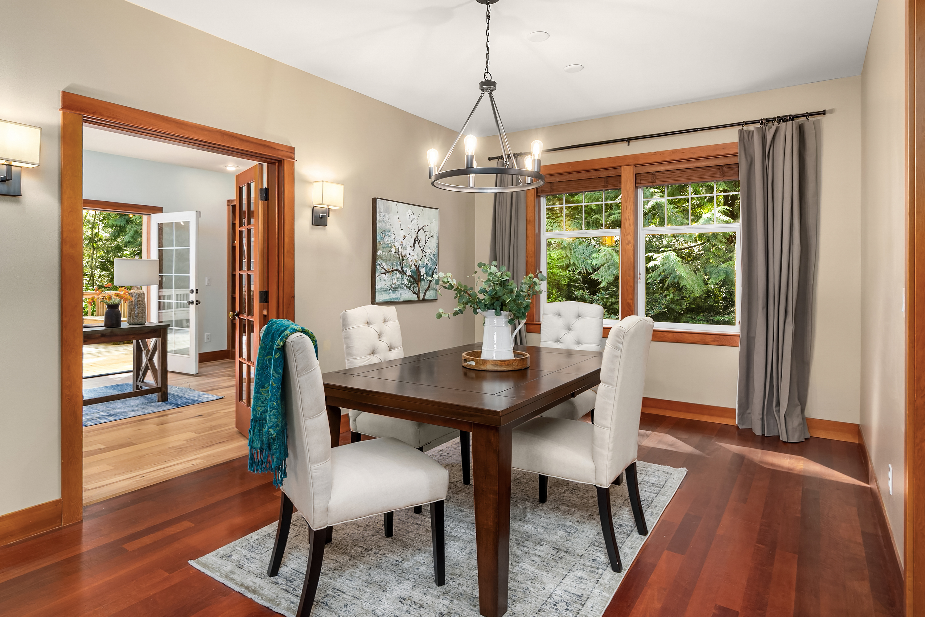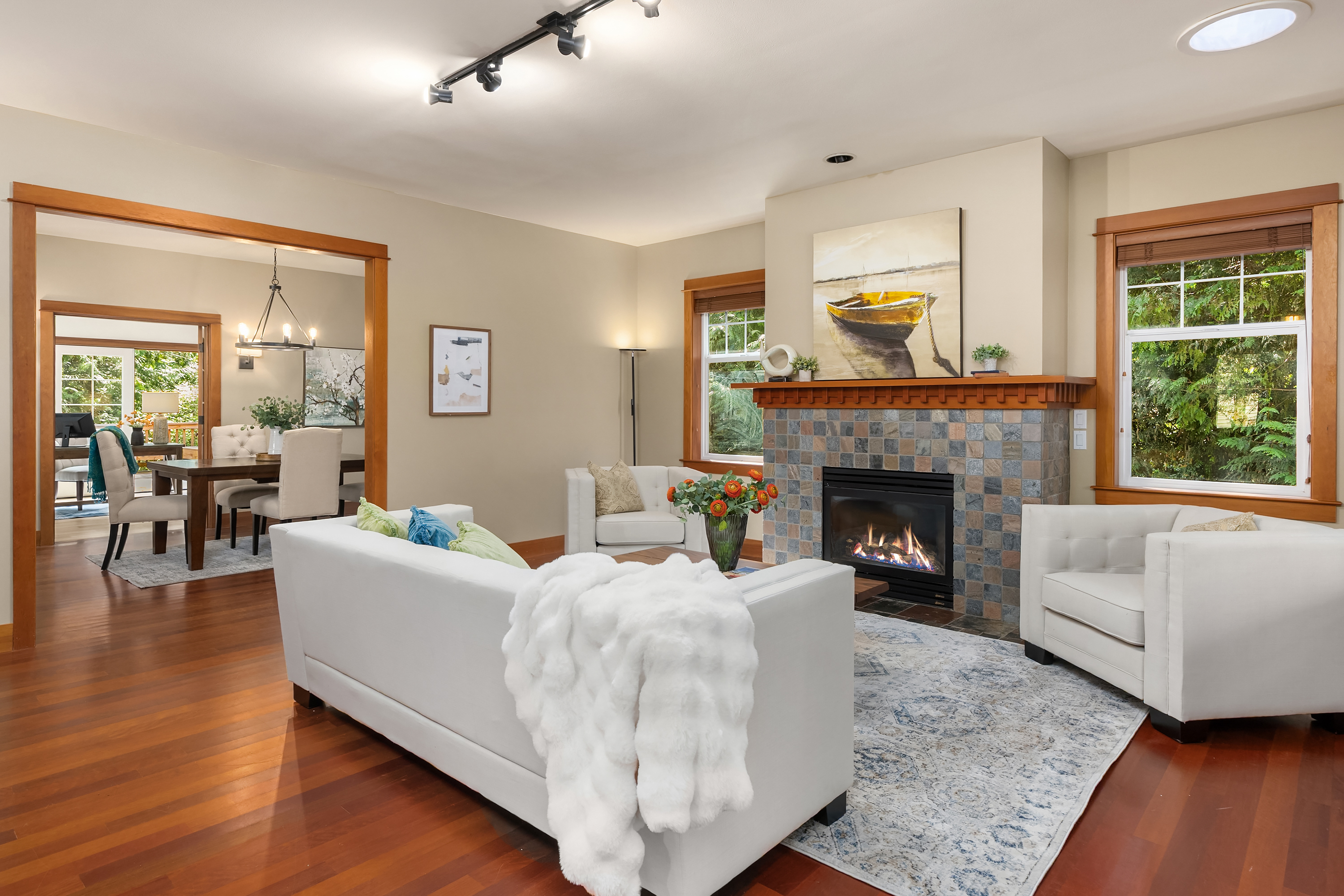 Set on just under an acre in a peaceful, quiet location, less than a mile from Fay Bainbridge Park and only minutes from Rolling Bay, this thoughtfully designed Craftsman offers timeless character, flexible living, and a beautiful Bainbridge Island setting. A classic covered front porch welcomes you into interiors defined by tall ceilings, a slate foyer, stained glass front door, solid-core wood doors, wood-framed windows, and rich Moabi hardwood floors through the main living areas. The inviting living room centers around a gas fireplace, while the spacious kitchen features cherry cabinetry, granite countertops, a center island with prep sink, propane cooktop, wall oven, and a charming breakfast nook. Formal and informal spaces connect easily for everyday living and entertaining, and the office/den offers built-in bookcases and French doors opening to the deck. Above the detached two-car garage, approximately 460 sqft of finished space with a kitchenette and 3/4 bath offers exceptional flexibility for guests, a studio, media room, or private workspace. Outside, the lifestyle continues with a large back deck, stone patio and fire pit, raised garden beds, a spacious private yard, trails through the forest, chicken coop, and a covered walkway connecting the garage and house.