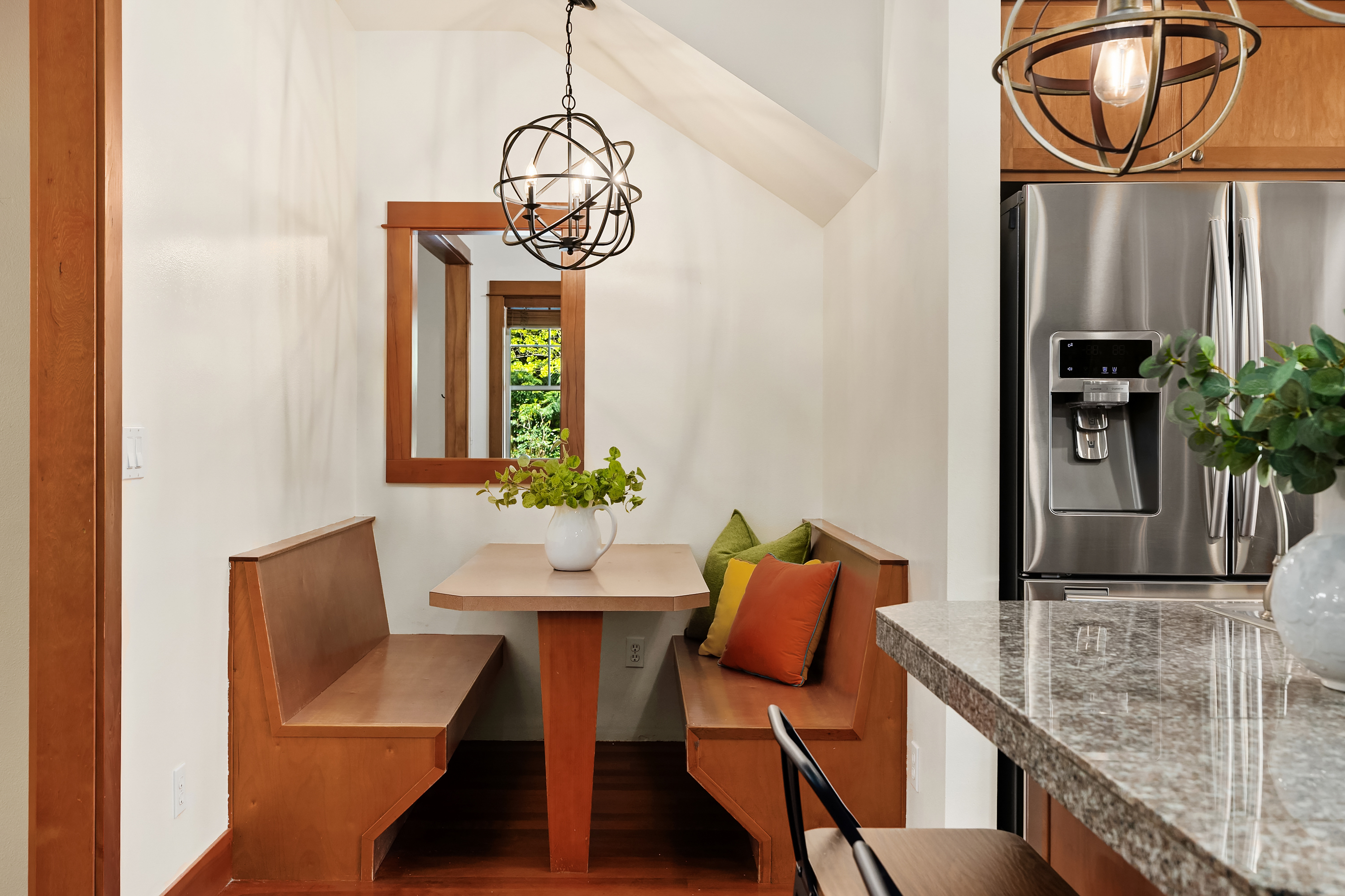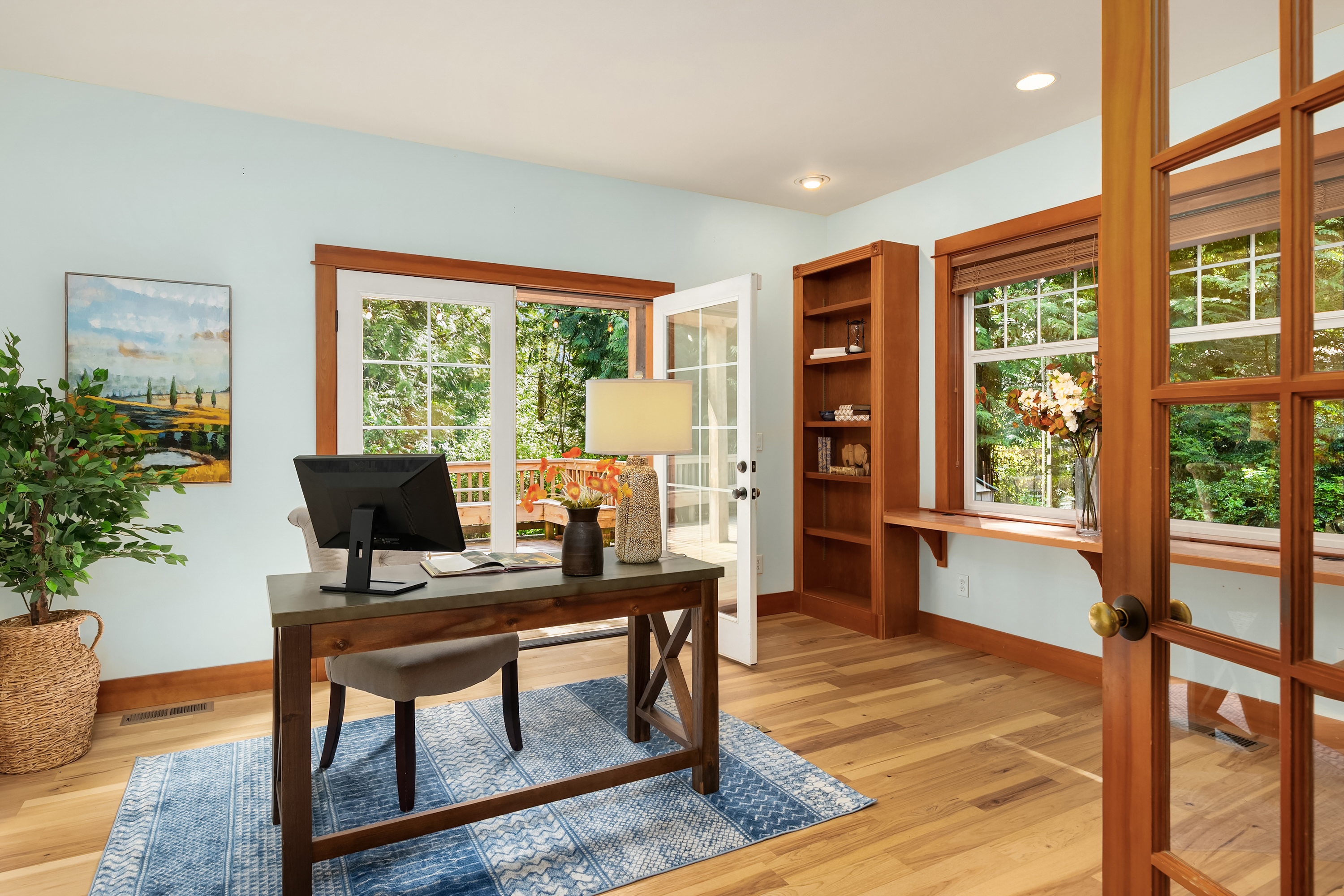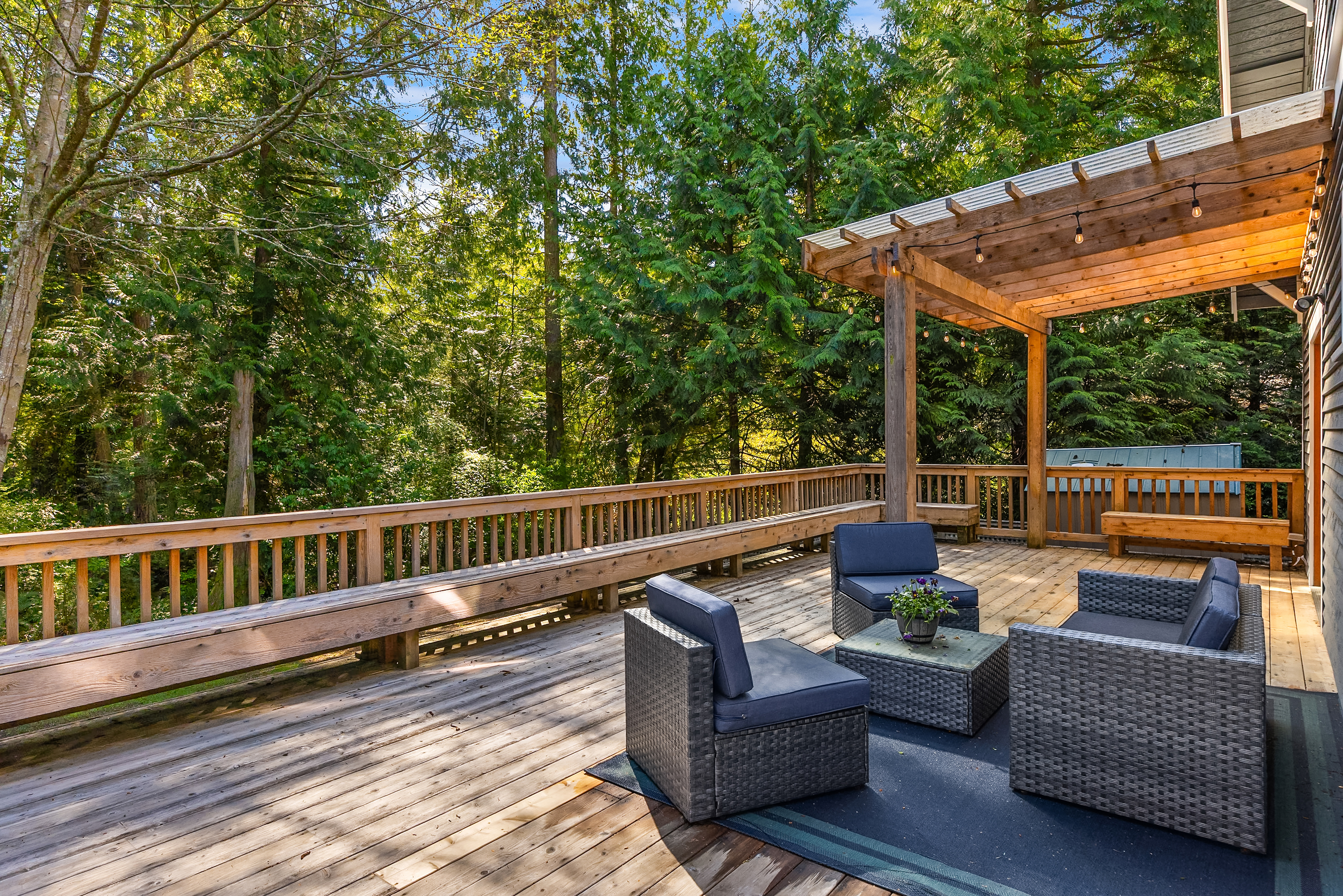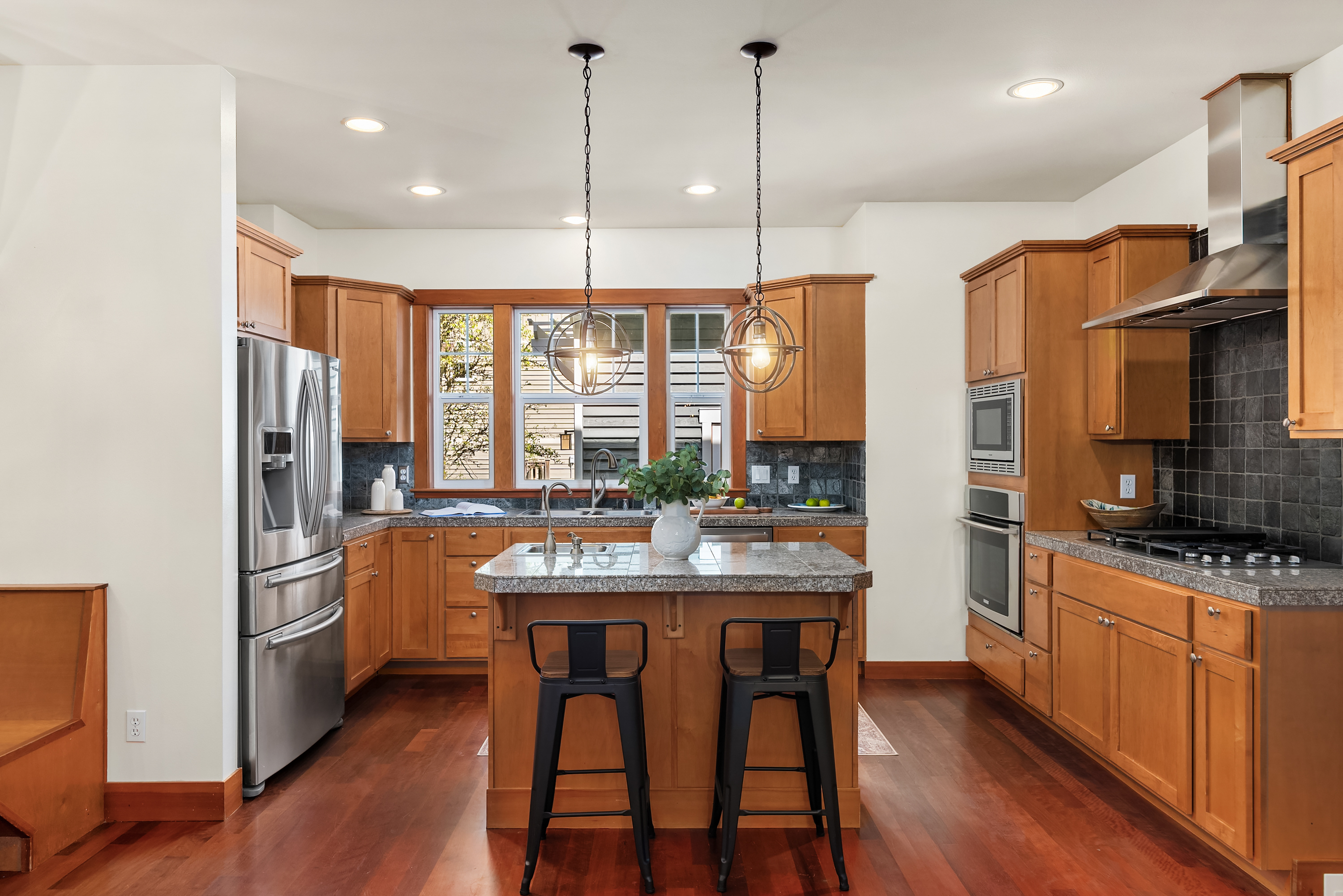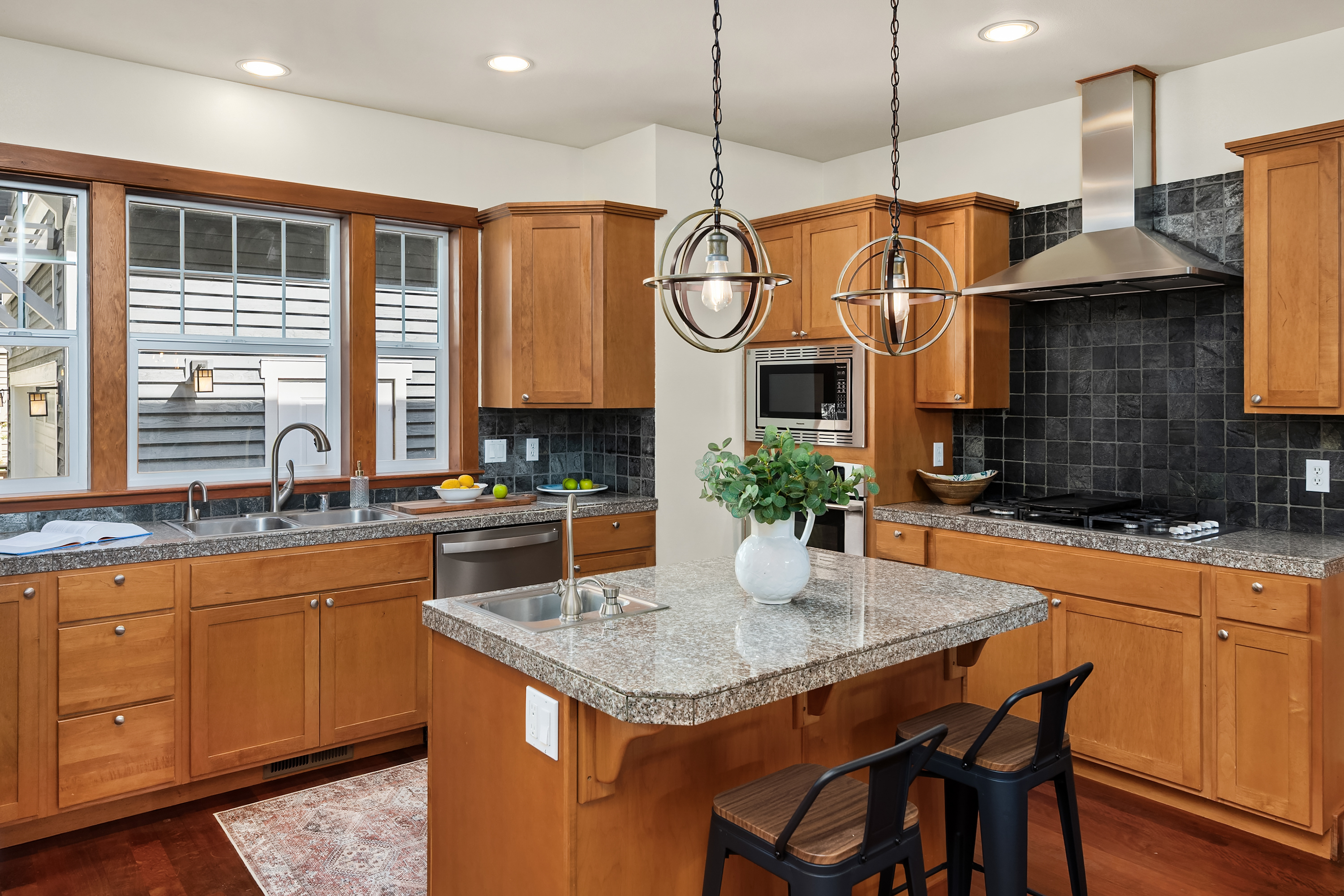 Set on just under an acre in a peaceful, quiet location, less than a mile from Fay Bainbridge Park and only minutes from Rolling Bay, this thoughtfully designed Craftsman offers timeless character, flexible living, and a beautiful Bainbridge Island setting. A classic covered front porch welcomes you into interiors defined by tall ceilings, a slate foyer, stained glass front door, solid-core wood doors, wood-framed windows, and rich Moabi hardwood floors through the main living areas. The inviting living room centers around a gas fireplace, while the spacious kitchen features cherry cabinetry, granite countertops, a center island with prep sink, propane cooktop, wall oven, and a charming breakfast nook. Formal and informal spaces connect easily for everyday living and entertaining, and the office/den offers built-in bookcases and French doors opening to the deck. Above the detached two-car garage, approximately 460 sqft of finished space with a kitchenette and 3/4 bath offers exceptional flexibility for guests, a studio, media room, or private workspace. Outside, the lifestyle continues with a large back deck, stone patio and fire pit, raised garden beds, a spacious private yard, trails through the forest, chicken coop, and a covered walkway connecting the garage and house.