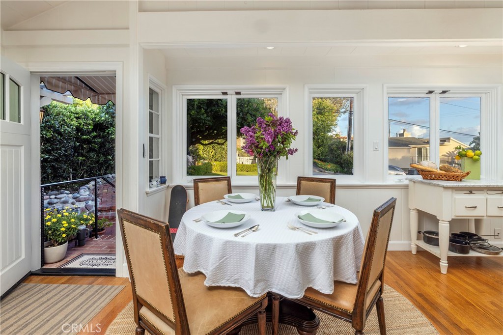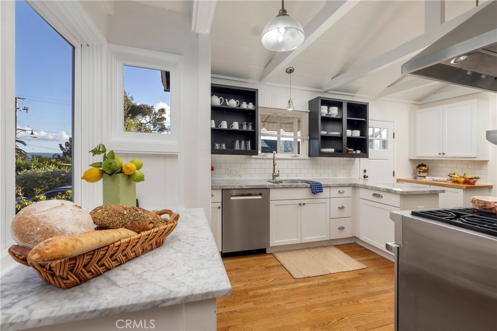 This delightful home is located on a large lot with ocean views and a secluded backyard. The entry welcomes one via a landscaped pathway past an ocean view patio with inviting seating to enjoy the views. The kitchen is equipped with newer Bosch and Wolf appliances, Kohler faucets, and hardware set off by Brazilian granite countertops. This home also features upgraded plumbing with a continuous hot water system. Whether enjoying the front yard ocean view or relaxing in the secluded rear yard, this home is the perfect example of Woods Cove tranquility.