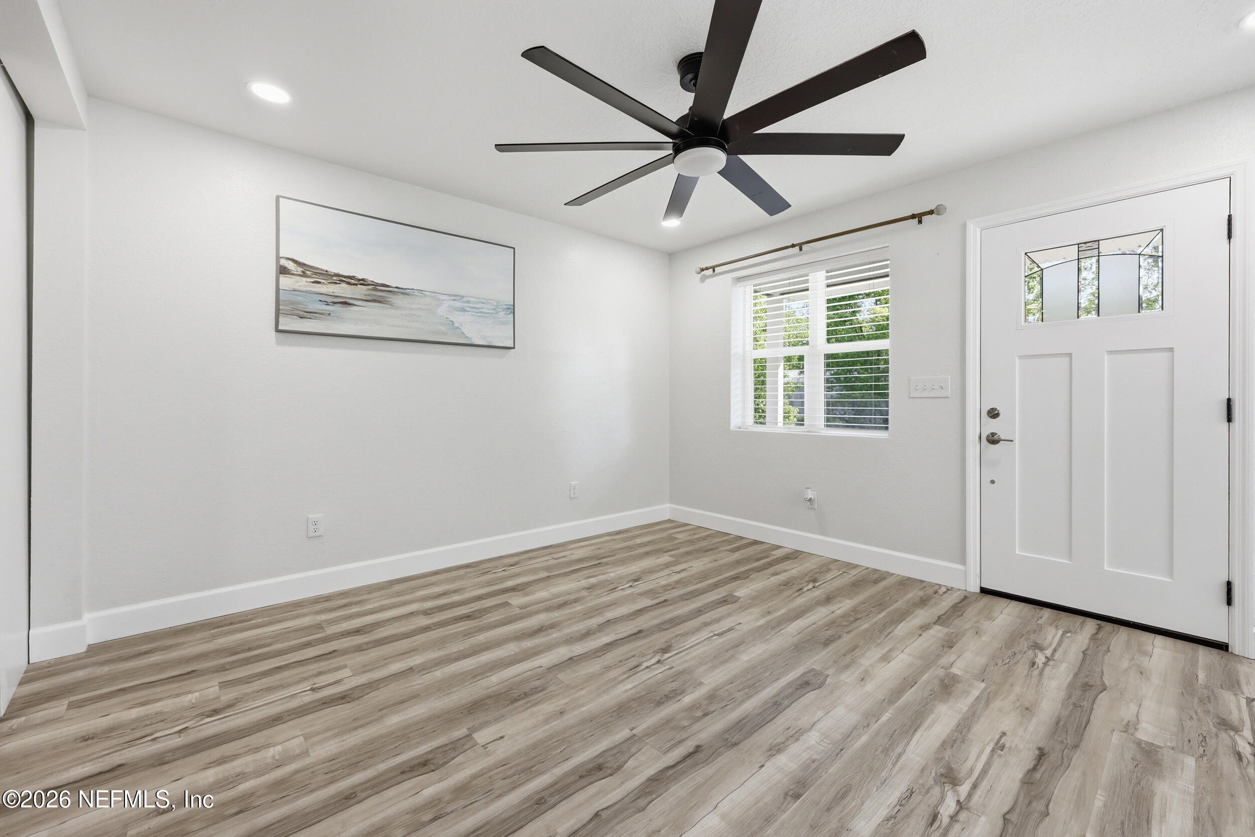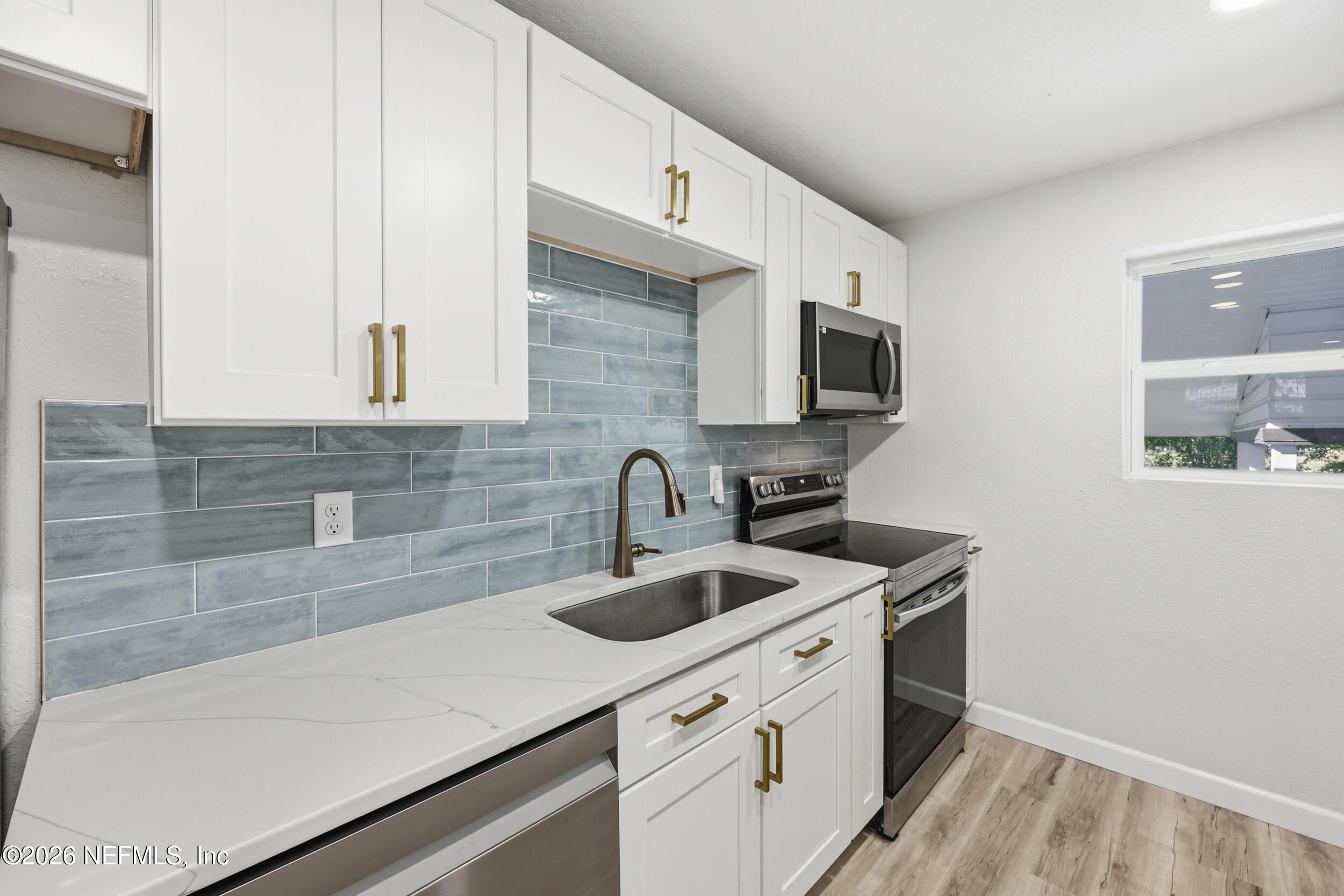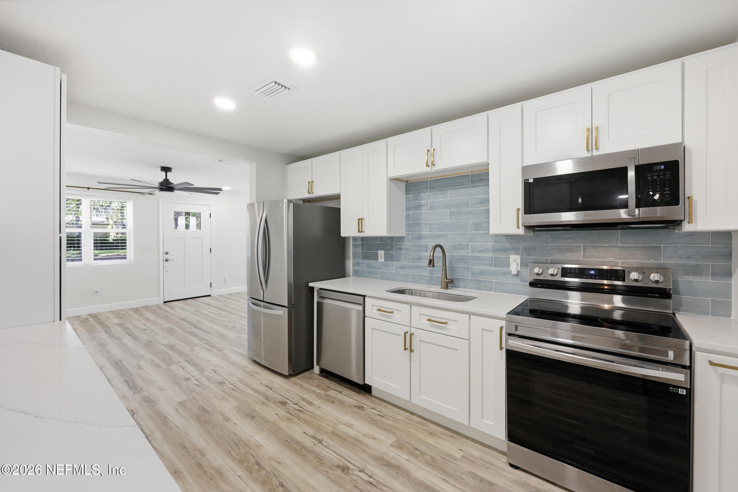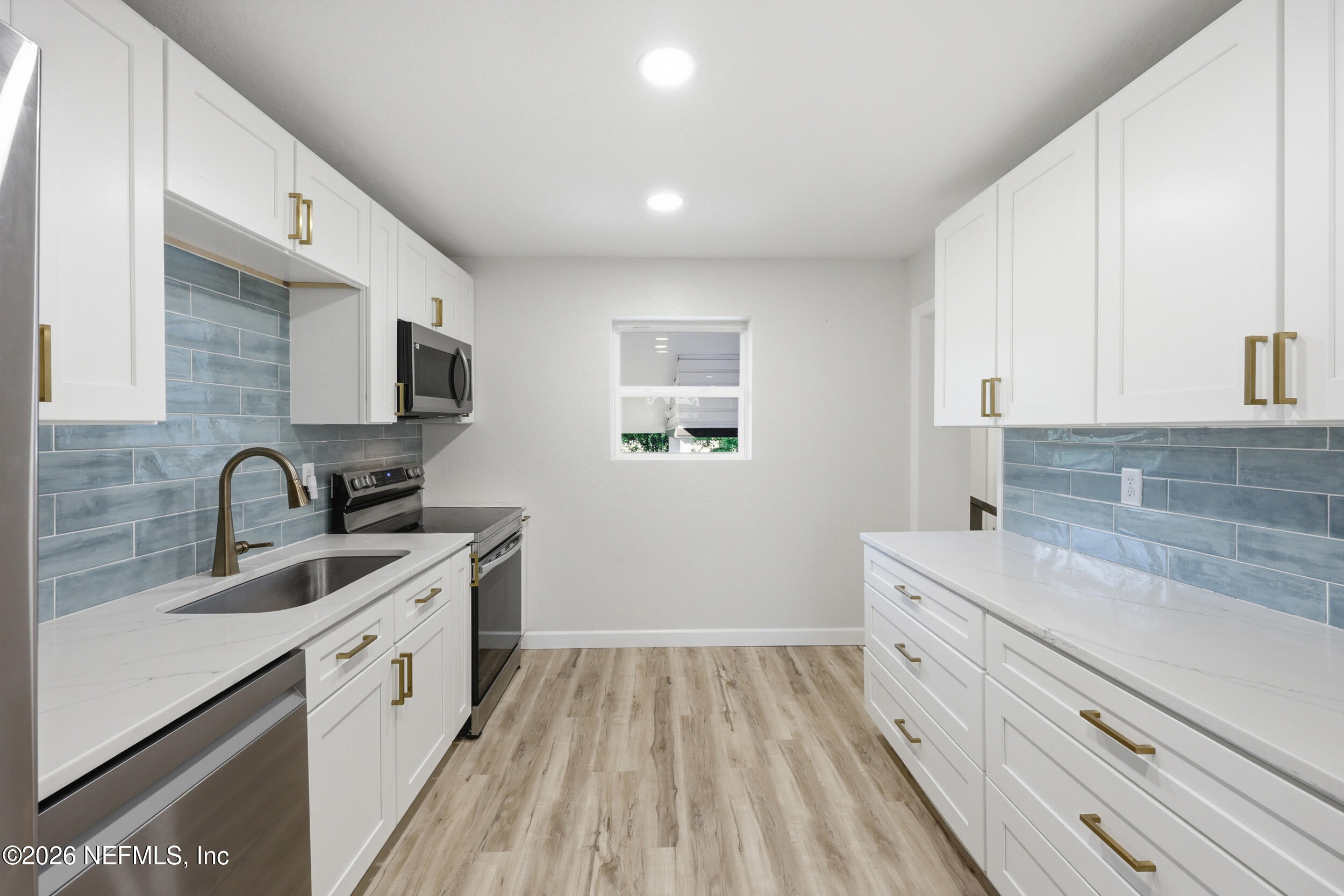 This meticulously maintained 3-bedroom, 1-bathroom ranch home is move-in ready and shows like a model. Inside enjoy luxury plank flooring, recessed lighting and an open layout. The kitchen features white shaker cabinets with gold hardware, quartz countertops, stainless steel appliances and slate blue tile backsplash. The bathroom boasts marble-style tile, a soaking tub, a walk-in shower and a shiplap accent wall. The primary bedroom offers room to relax and unwind. Outdoors, a covered patio overlooks a spacious, tree-lined backyard - a private setting ideal for relaxing, entertaining, or creating your own outdoor retreat. Located on a quiet street just minutes from downtown Starke, near shopping, dining and Bradford County schools. Under an hour away from Jacksonville, welcome home to peaceful living without an HOA.