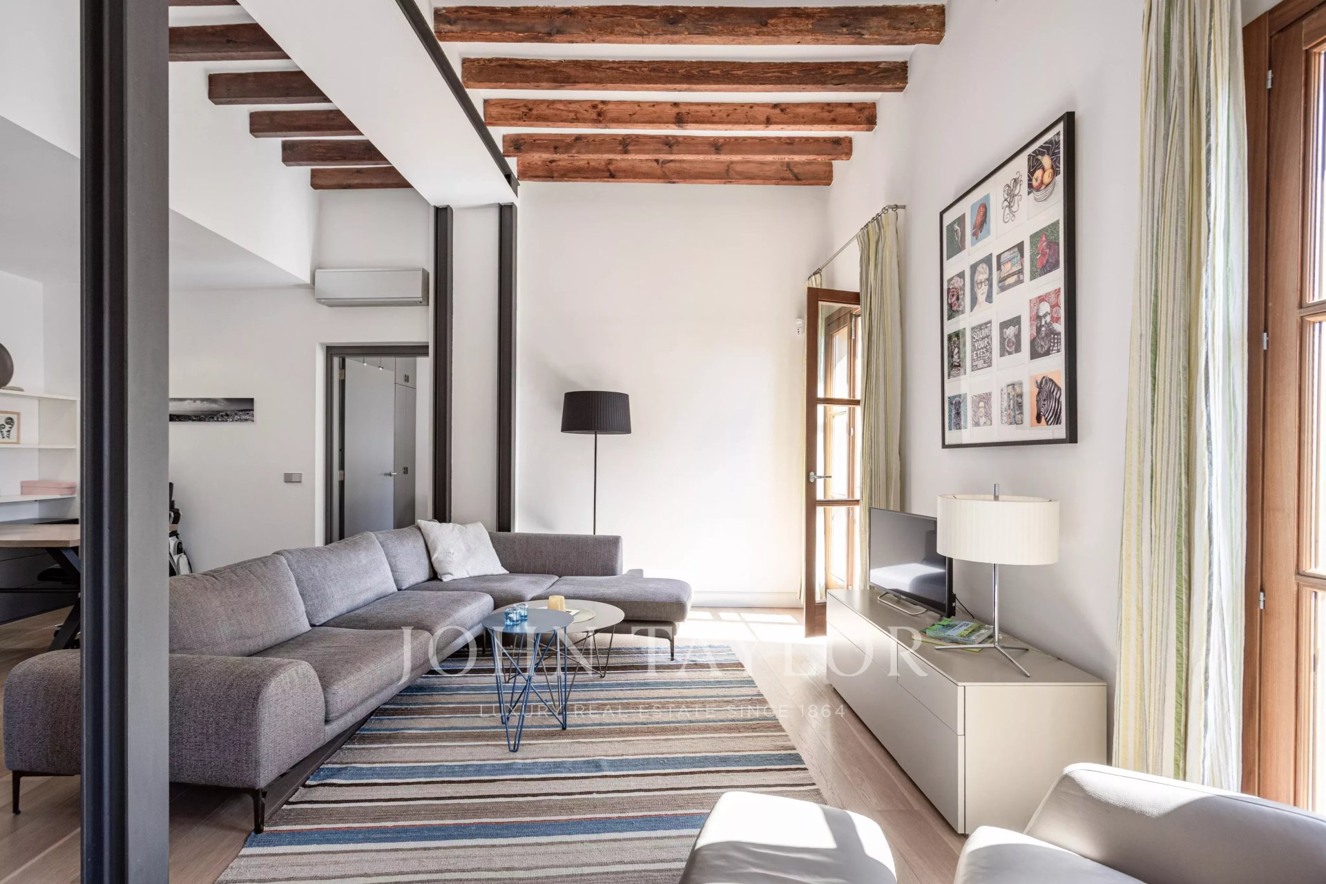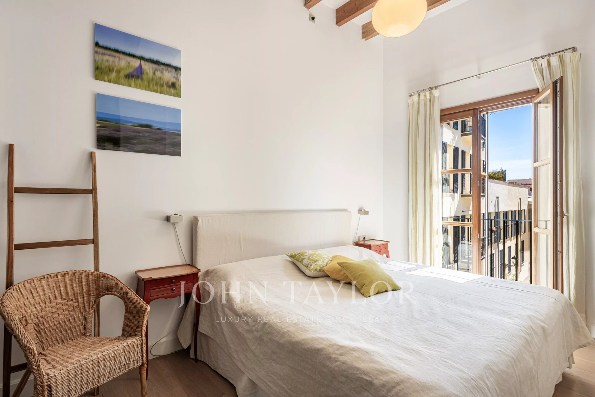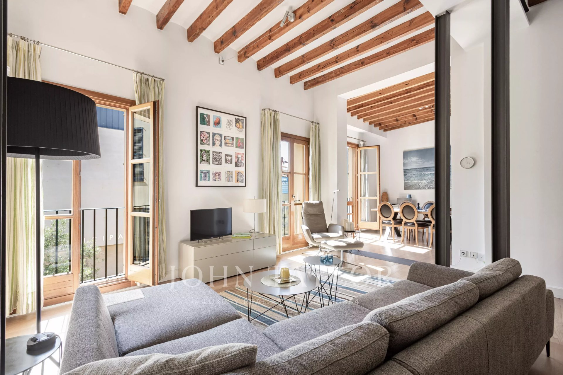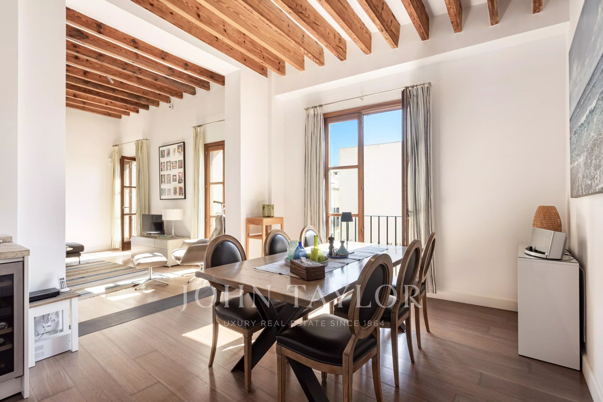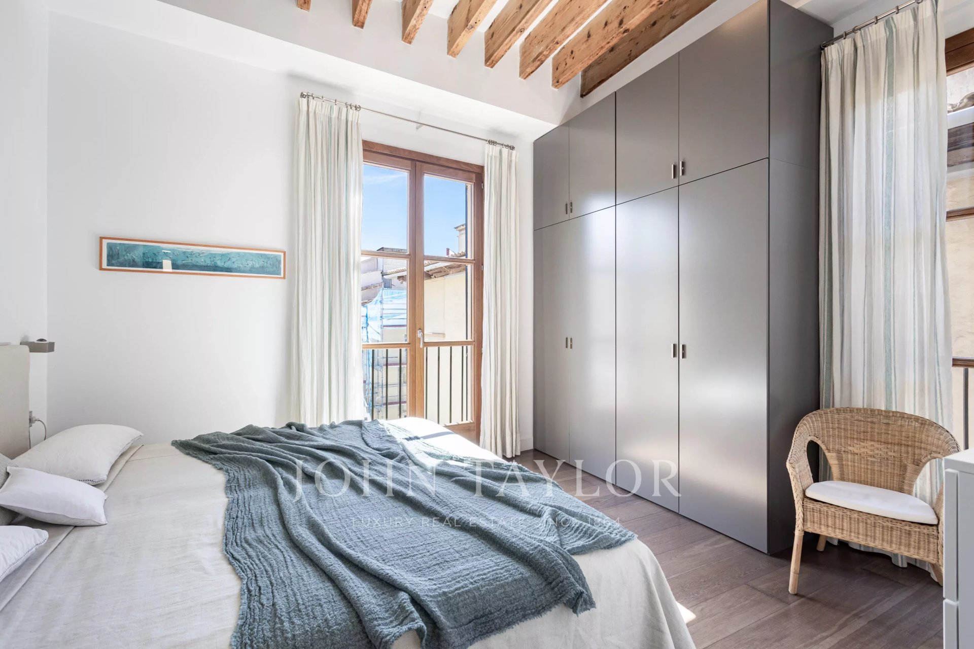 In the heart of Calatrava, one of the most sought-after areas of Palma’s old town, this property occupies a corner position overlooking a wide square, offering a very rare feeling in the historic centre: open light, privacy, and no buildings directly in front of the windows, with the theatre located on the opposite side of the square.Set in a well-maintained building from 2012 with lift access and good-quality finishes, the property was originally designed as two separate apartments and still retains both independent entrances, offering the genuine possibility of dividing it again if desired.Today it functions as a single home with three bedrooms and two bathrooms. The main living area is arranged as an open-plan space where the living room, dining area and kitchen flow together while still feeling clearly defined. Being on a corner, the light moves through the home throughout the day: morning sun fills the living room, midday light gathers on the south-facing terrace, and in the afternoon the interior regains a warm glow from the reflection of the square.From the terrace, located on the same level as the kitchen, there is also a pleasant partial sea view, which gives the space a greater sense of openness.The layout clearly separates the night area. The master suite sits at one end of the property, with an en-suite bathroom discreetly integrated behind a concealed door within a wardrobe, while the two guest bedrooms are located on the opposite side.All rooms are exterior, ceilings are high with exposed beams, and the overall condition is very well maintained. The property also includes a parking space within the same building, a highly valuable asset in the old town.A home with a very special light, a well-resolved layout, and a location that is difficult to match within Palma’s historic centre.One of the best-preserved old towns in Spain, featuring the most amazing Gothic architecture in the Mediterranean, surrounded by hundreds of narrow streets, excellent shopping, great restaurants, art galleries, museums, and amazing ancient passages leading to important historical monuments, landmark buildings, and the jewel of the crown: Catedral Santa Maria, La Seu. It is very popular for social life and offers very trendy places to visit, like Passeig del Born, Avenida de Jaume III, Passeig de la Rambla, La Llonja, and some of the most visited “Plazas”, such as Plaza Santa Eulalia, Plaza Cort, Plaza Mercat, and Plaza Mayor, among others. Casco Antiguo is one of the most desirable districts for property investment. Many of them have been renovated over the past few years and turned into luxury apartments with all the modern amenities.