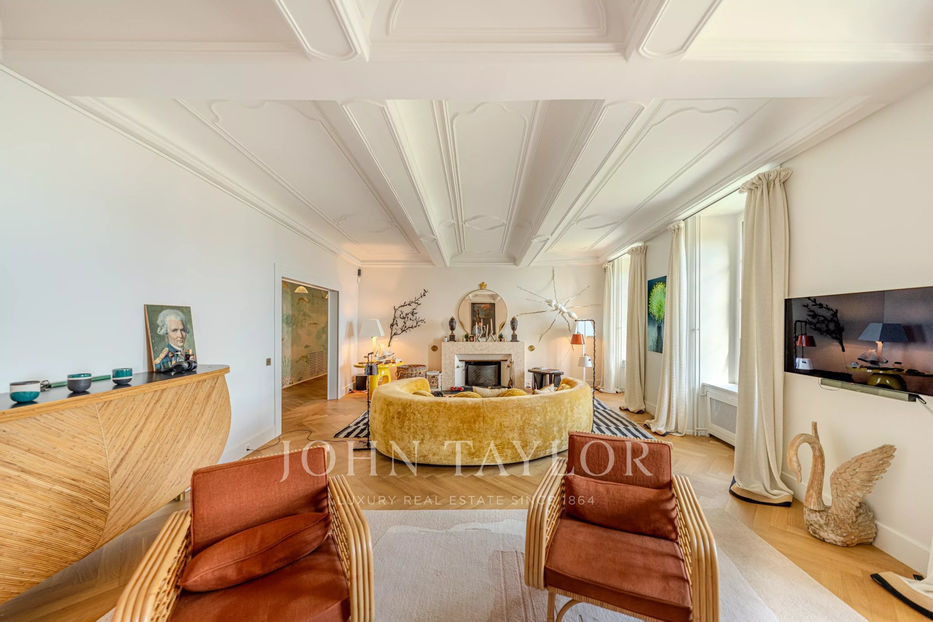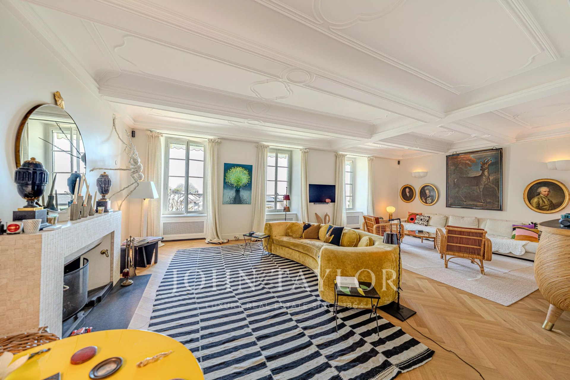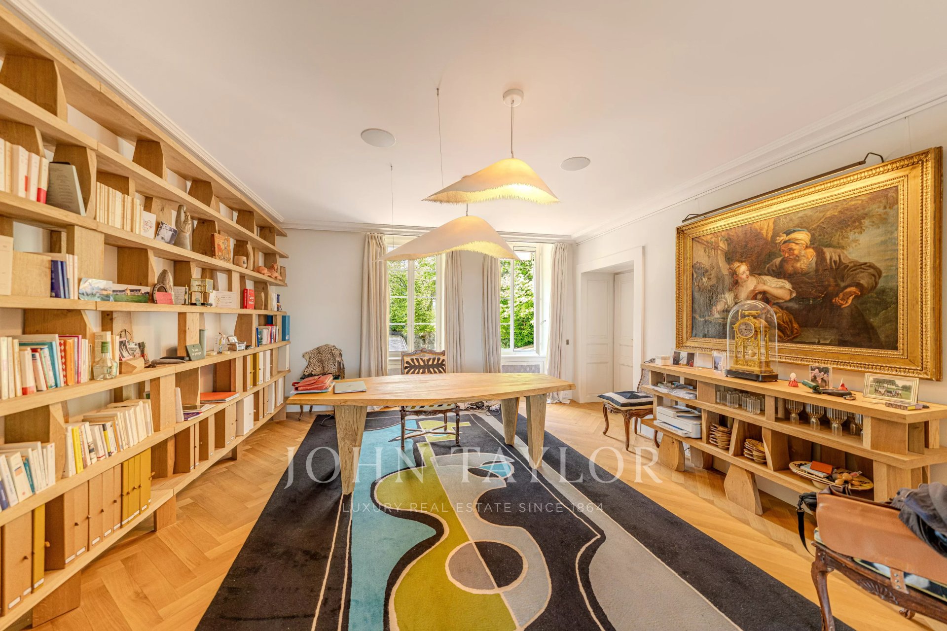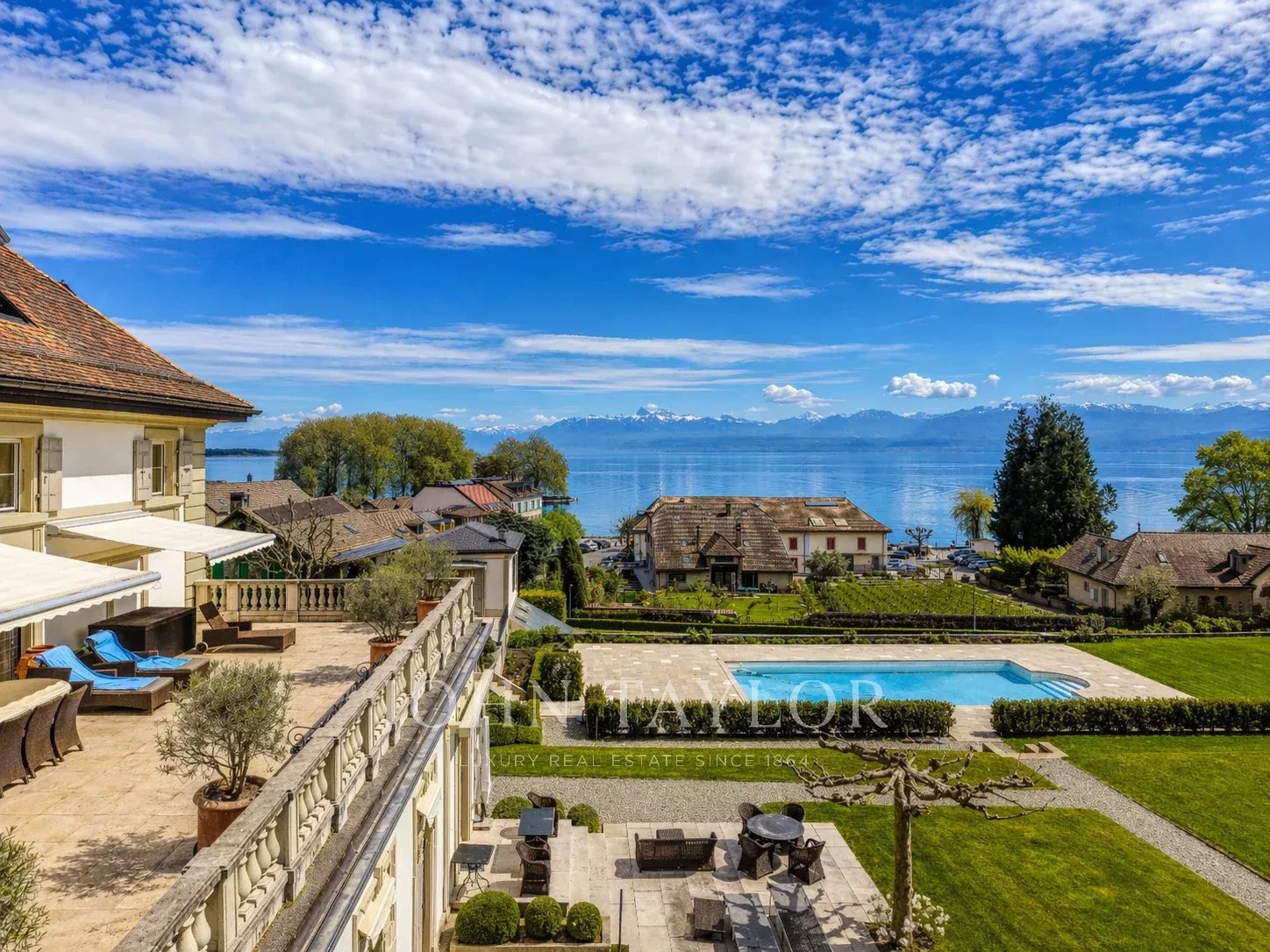 -Privileged location between Geneva and Lausanne, 200 meters from the lake and close to shops and the train station-Historical estate from the 18th century, fully renovated, within a private park of 7,000 m² with heated pool-High-end residence consisting of only 5 apartments-266 m² habitable apartment, renovated with very high-quality materials-Generous volumes, high ceilings, and elegant layout-Reception rooms offering a panoramic view of Lake Geneva and the Alps-A contemporary artwork by Matthieu Cossé enhances the corridor, inspired by Lake Geneva and created in a color palette in perfect harmony with the apartment-3 complete suites with bathrooms and dressing rooms-Spacious and fully equipped kitchen-Private garden of about 1,000 m²-Double garage, cellars, and wine cellar, additional at CHF 100,000