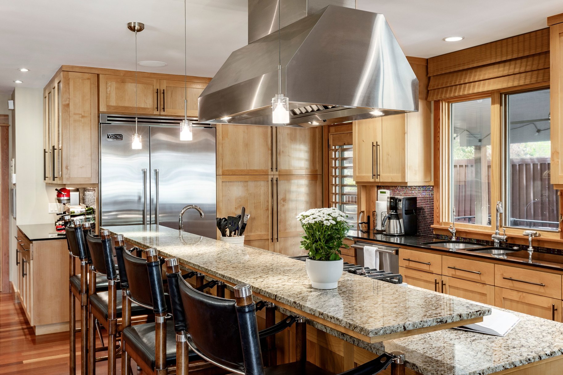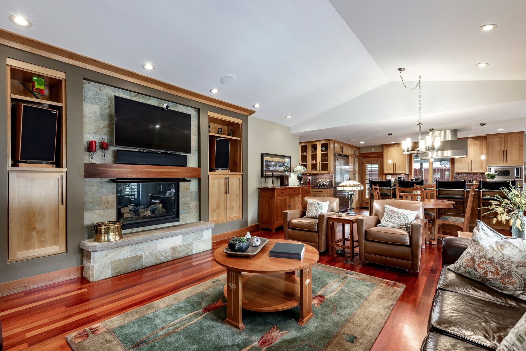 Inside, you’ll find an elegant, light-filled floor plan with soaring vaulted ceilings, rich woodwork, and expansive windows that flood the home with natural light. The chef’s kitchen is both beautiful and functional, featuring generous counter space, stunning cabinetry, and a hidden pantry—perfect for seamless entertaining.