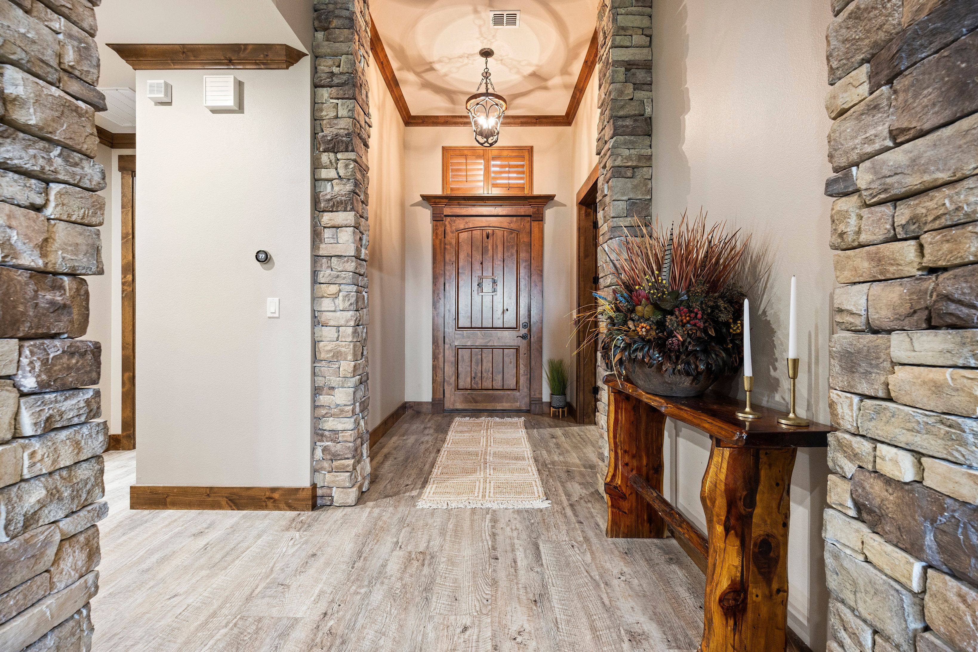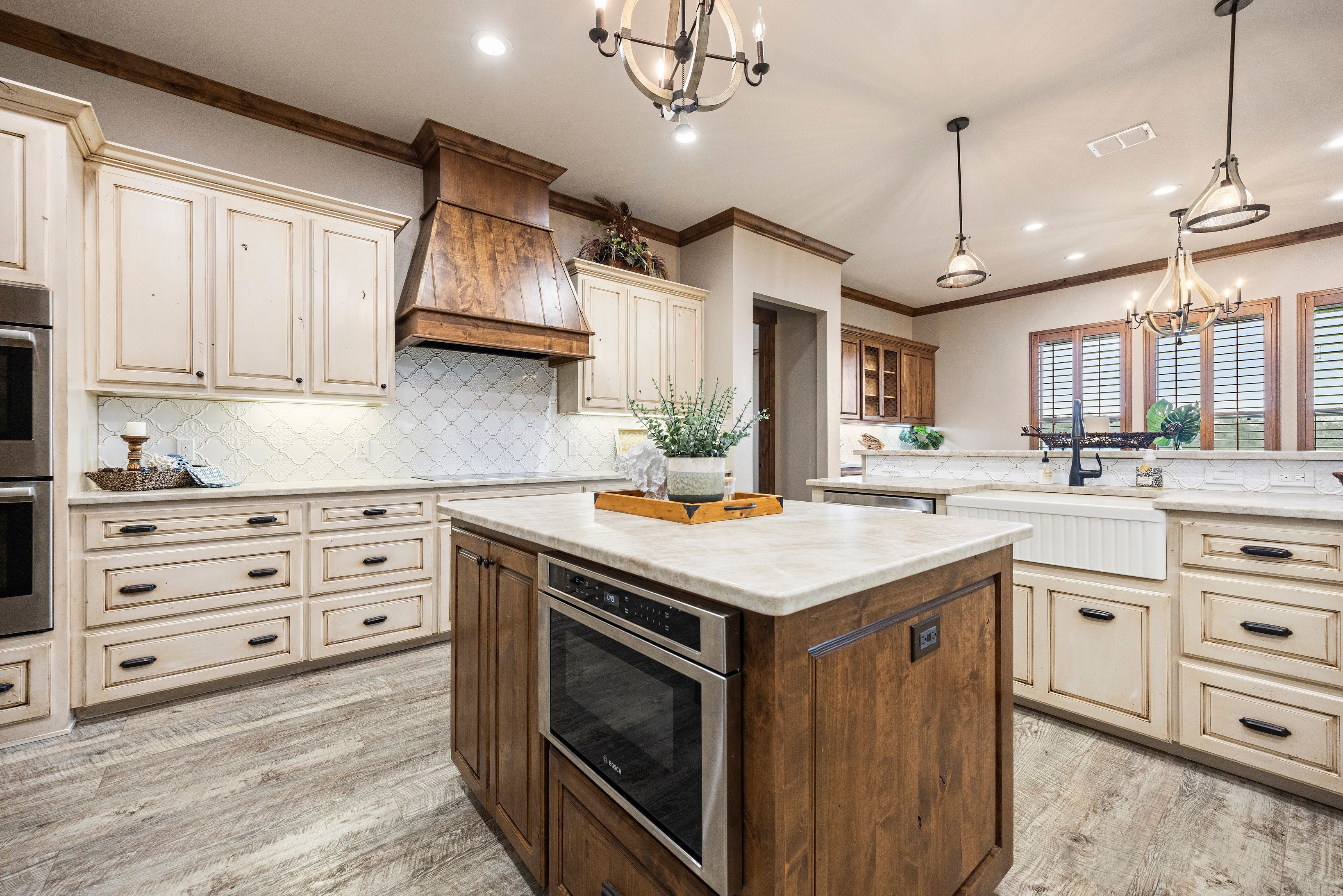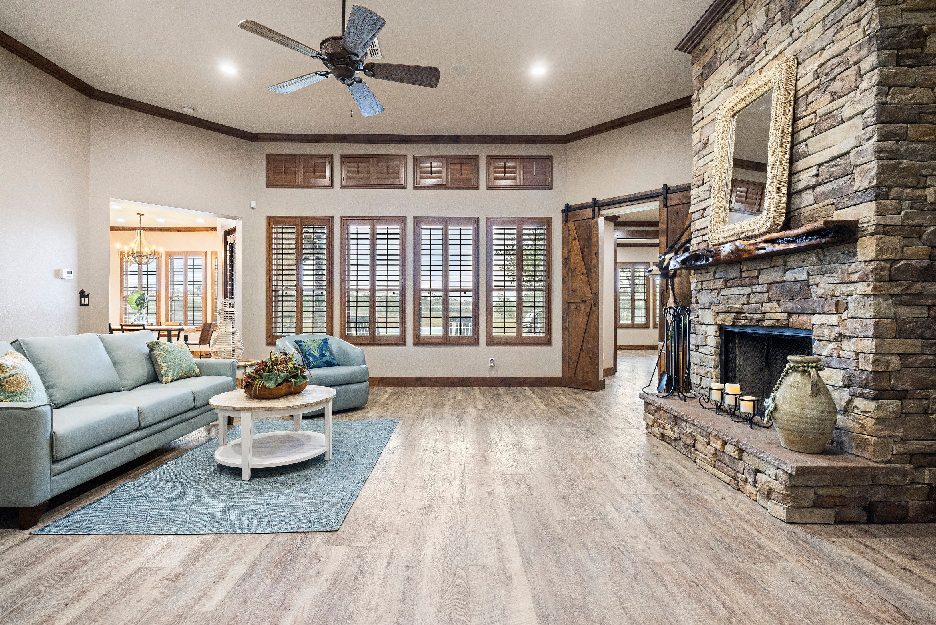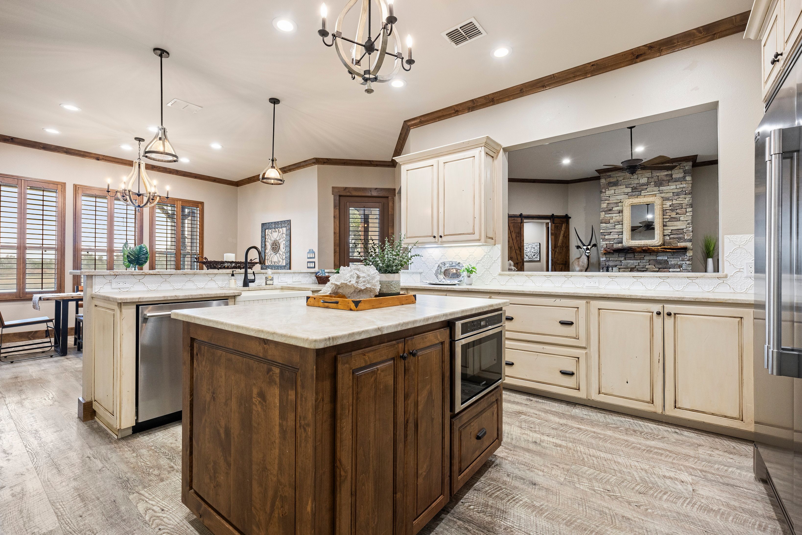 Set behind a sweeping circular drive on a beautifully manicured lot, this custom-built coastal country home delivers luxury, space, and privacy in one exceptional package. Timeless stonework and warm wood accents create a stunning first impression, leading into a grand foyer showcasing impeccable craftsmanship throughout. The open-concept living area features a striking stone fireplace and flows seamlessly to a covered patio with a fully equipped outdoor kitchen, perfect for entertaining and everyday enjoyment. Beyond the outdoor living space, a stocked pond offers peaceful views and frequent sightings of herons, egrets, and native wildlife. The primary suite is a true retreat, highlighted by a spa-inspired walk-through dual-head shower and an expansive 13x13 custom walk-in closet with built-in island. The chef’s kitchen is designed to impress with leathered granite countertops, oversized island with breakfast bar, double convection ovens, 64” built-in refrigerator/freezer, microwave drawer, beverage cooler, custom solid wood cabinetry, and a large walk-in pantry. Additional features include an oversized garage, metal roof, impact-rated double-pane windows, dual A/C systems with Nest thermostats, dual water heaters, whole-home water filtration system, plantation shutters throughout, spacious laundry room, dedicated game or flex room, stair access to a decked attic, dehumidifier, and a 20-zone irrigation system. Completing the property is a workshop with an extended carport, ideal for hobbies, storage, boats, or RV parking. This one-of-a-kind home offers a rare combination of refined design, modern efficiency, and elevated coastal country living—perfect for buyers seeking space, privacy, and luxury just minutes from the coast.