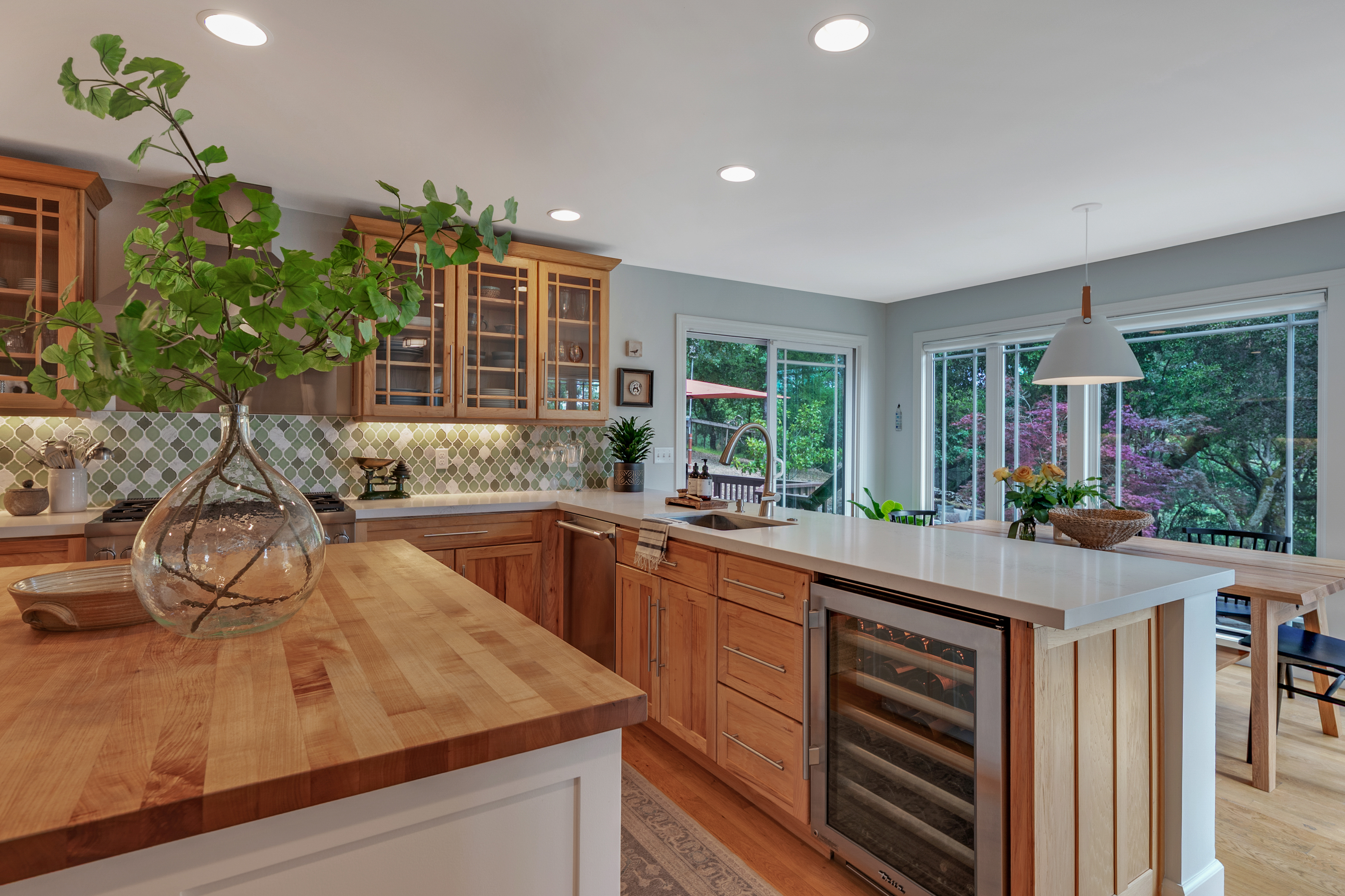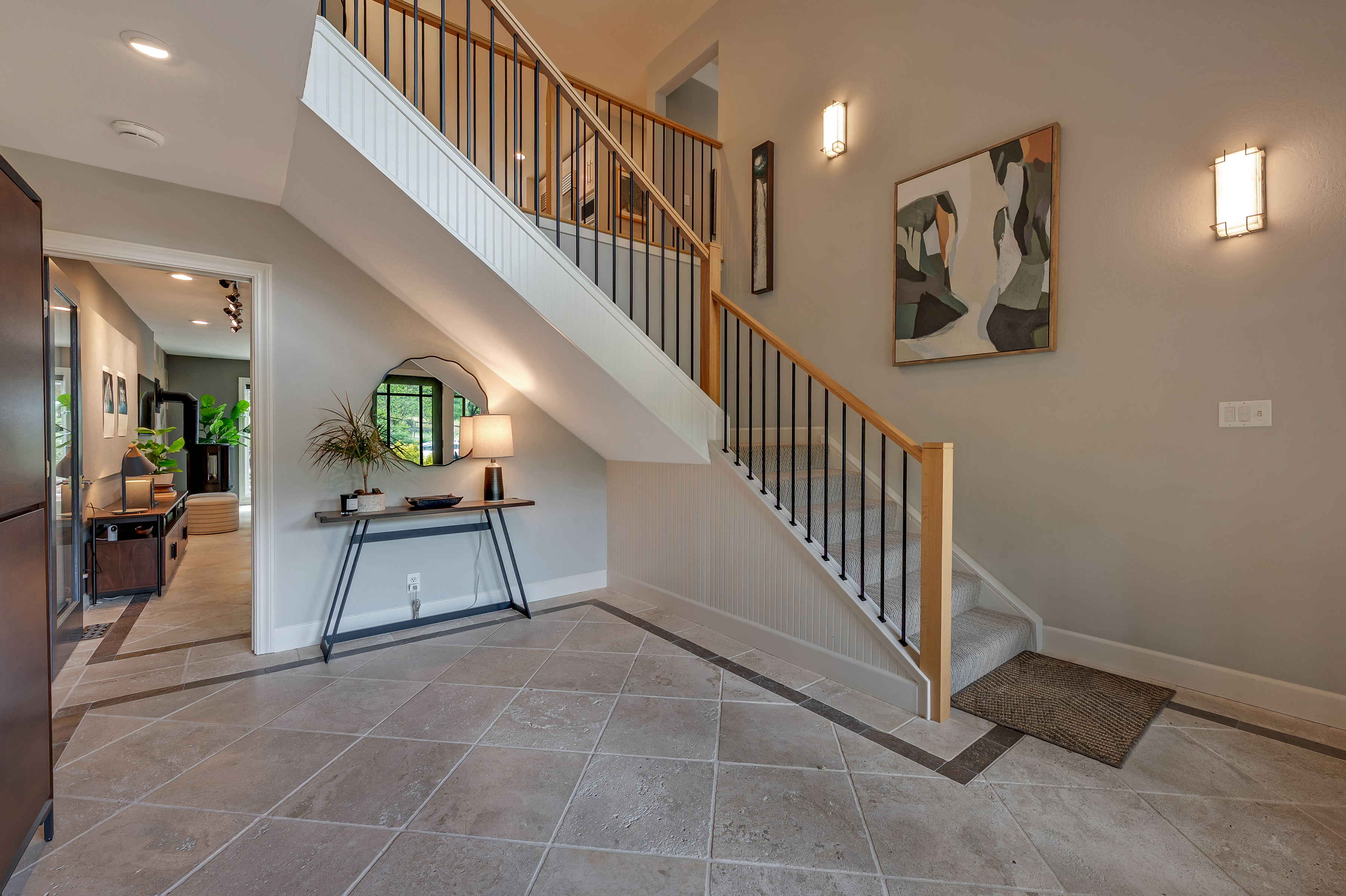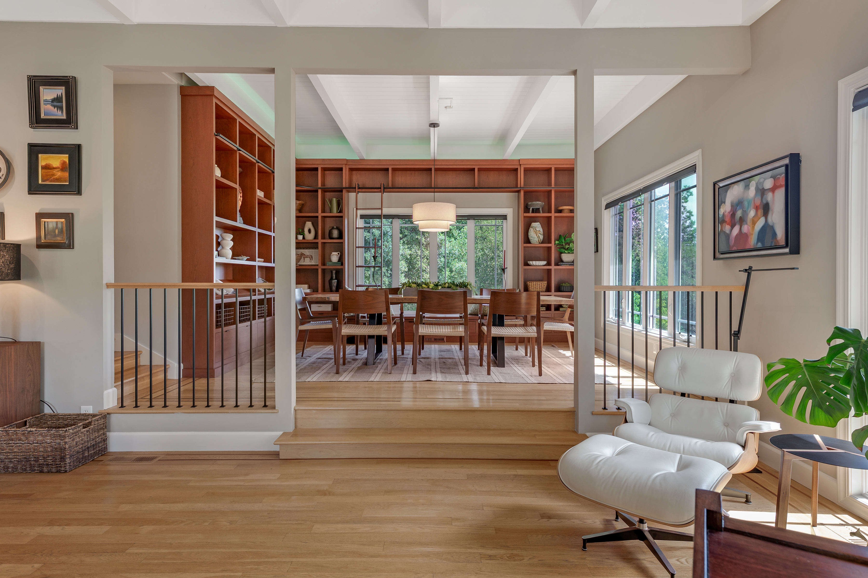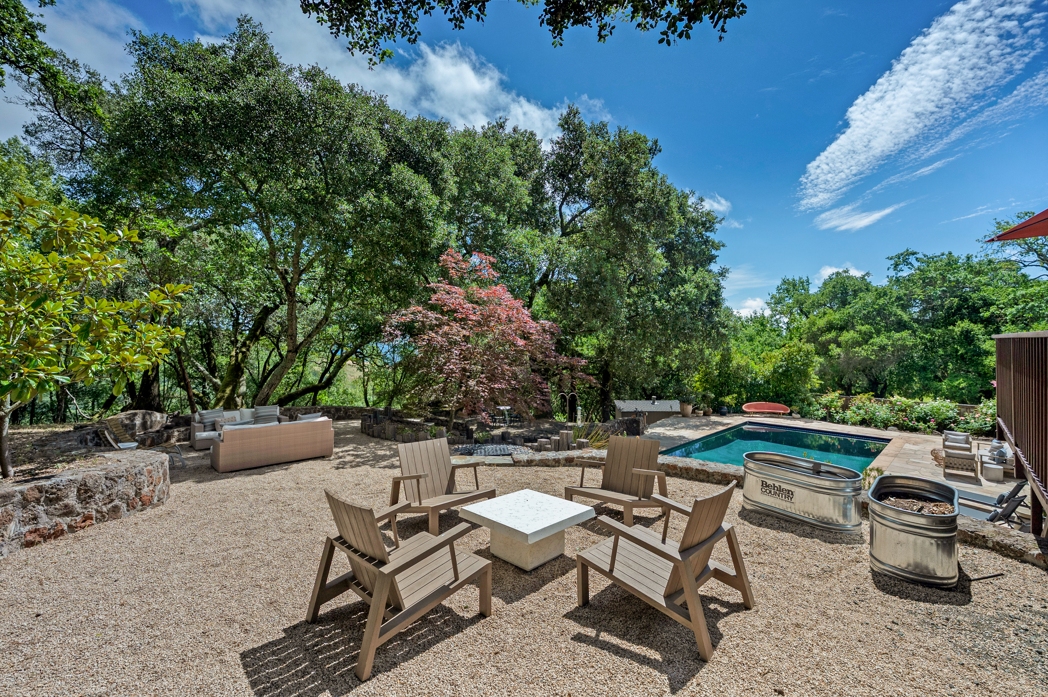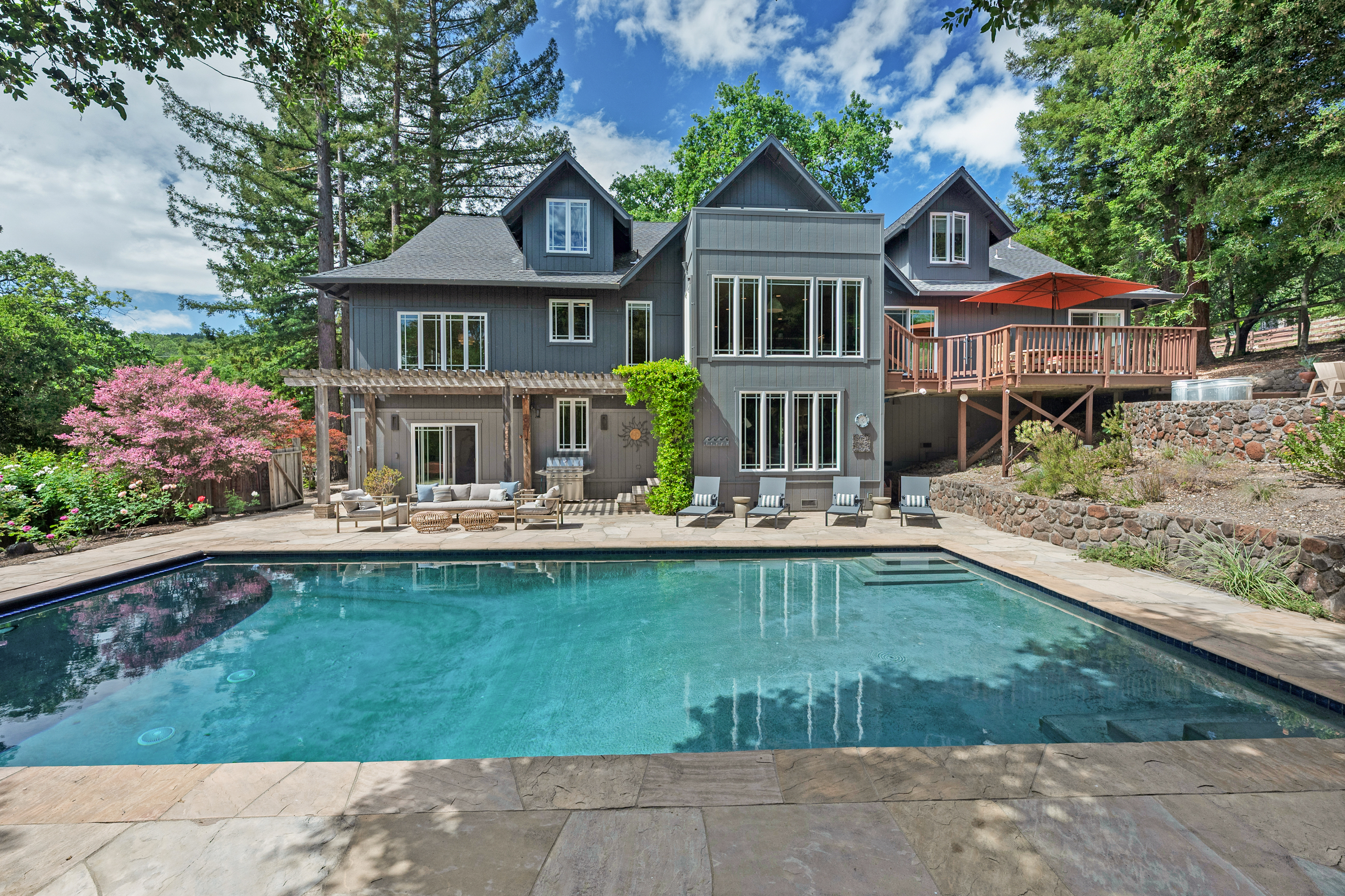 Perfectly sited in Sonoma's verdant western hills, 3745 Grove Street is a sun-filled contemporary residence offering approximately 4,369 square feet with 4 bedrooms, an office, and 3 full baths on 2.5 acres dotted with oak and redwood. Expansive windows and glass doors invite dappled light and sweeping valley vistas, opening to generous decks and terraces that embrace effortless indoor-outdoor wine country living. The entry level welcomes with a gracious foyer and striking staircase featuring newly installed oak and steel railings, creating architectural continuity throughout. A versatile media/recreation room with contemporary gas fireplace opens directly to an expansive pergola ideal for year-round entertaining. The main level is designed for both comfort and style, with expansive living and dining areas, custom stained alder built-ins, designer lighting and large view windows. The chef's kitchen features Thermador professional appliances, Sub-Zero refrigeration, and True wine and under-counter fridges, complemented by updated counters, custom tile backsplash and abundant cabinetry. A sunlit casual dining area overlooks the pool and hillside greenery. Three bedrooms, an office and a full bath offer flexibility for guests, work, or creative use. Occupying its own level, the primary suite offers a private retreat with sitting area, spa-inspired bath with soaking tub, new vanity, walk-in closet with custom built-ins and private decks capturing panoramic views. Extensive upgrades include custom window treatments, Lutron Caseta smart lighting, UV-tinted windows, solid wood interior doors, CAT6 wiring, Unifi cameras, Doorbird gate control, updated electrical panel, HVAC with AC and a Generac generator. Outdoor living shines with freshly resealed decks, stone patios, and a solar-heated pool set among natural landscaping and a vibrant rose garden. A gated entry, sweeping drive, three-car garage, and ample guest parking complete the offering. Minutes to Sonoma Plaza, wineries, and dining, with optional Diamond A Recreation Center membership this is refined Sonoma Valley living with modern ease.
